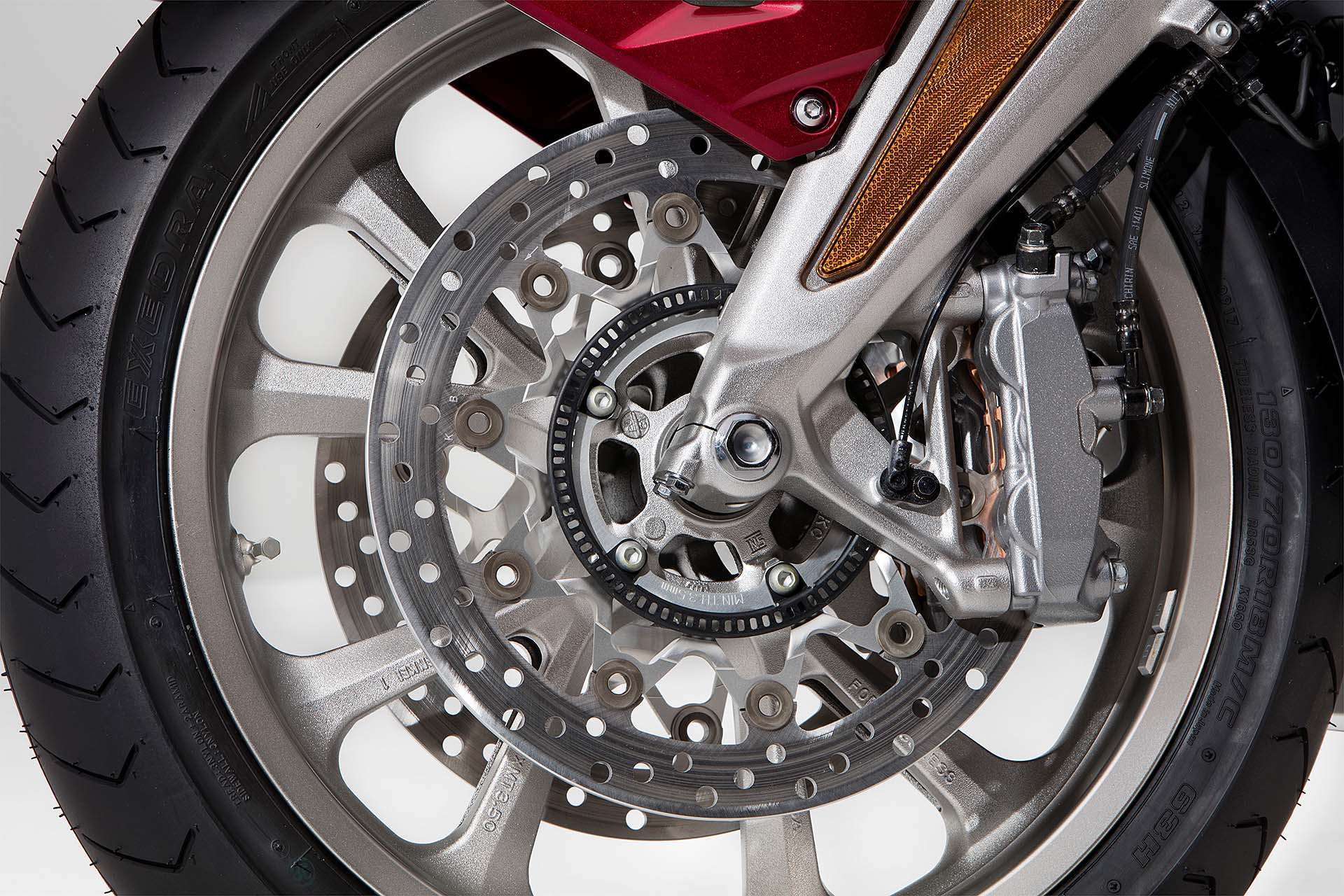 NON È TUTTOAncora: nella versione DCT la Honda GL1800 Gold Wing 2018 è equipaggiata con Start&Stop e ISG (Integrated Starter Generator, un sistema che garantisce un avviamento molto silenzioso), oltre all’HSA (Hill Start Assist) per le partenze in salita. La versione con cambio “manuale” dispone del nuovo cambio a 6 rapporti con frizione assistita e antisaltellamento, mentre sulle moto con DCT il cambio a 7 rapporti lavora secondo i parametri dei Riding Mode. È disponibile una modalità Walking Mode, per parcheggiare comodamente la moto (si muove a 1,8 km/h in avanti, 1,2 km/h in retro).OSSA “PICCOLE”Non sono meno importanti le modifiche aalla ciclistica. La Honda GL1800 Gold Wing 2018 sfrutta un telaio perimetrale in alluminio più compatto e leggero, che ha permesso di spostare il motore in avanti di 40 mm. I numeri delle quote, come sempre, fanno impressione: 30,5° l’inclinazione del cannotto, 1.695 mm l’interasse. Davanti sparisce la forcella e debutta una sospensione a doppio braccio oscillante e cannotto avanzato, simile a quella adottata da BMW, e che promette più comfort. È nuovo il monobraccio, denominato Pro-Arm. L’idraulica delle sospensioni è regolata in maniera attiva dalla centralina in base al Riding Mode selezionato, con motorini passo-passo che muovono gli spilli del passaggio dell’olio, mentre il precarico del mono si regola elettricamente con un pulsante. L’ABS completa l’impianto frenante combinato D-CBS (Dual Combined Braking System), che distribuisce la frenata tra anteriore e posteriore a seconda del Riding Mode selezionato. In totale la nuova Gold Wing pesa 365 kg in ordine di marcia con il pieno, ben 48 kg in meno del precedente modello. Se si opta per la versione DCT/Airbag, però, la massa sale a 383 kg.