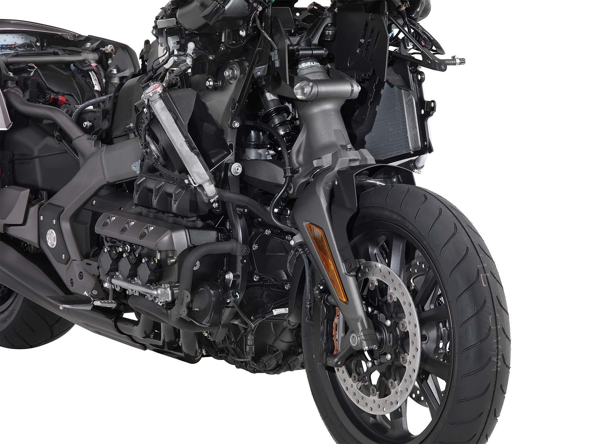TUTTA NUOVALa meccanica è tutta nuova, a partire dal motore. La Honda GL1800 Gold Wing 2018 monta il classico 6 cilindri boxer da 1.833 cc, con nuove misure di alesaggio e corsa (73 x 73 mm), 4 valvole per cilindro e peso ridotto di 6,2 kg. Leggermente più potente (126 cv a 5.500 giri e 170 Nm), è abbinato a un pacchetto elettronico molto completo, che comprende acceleratore TBW (Throttle By Wire) e quattro Riding Mode (Tour, Sport, Econ e Rain) per regolare erogazione, controllo di trazione HSTC, assetto delle sospensioni (semi-attive) e ripartizione della forza frenante tra avantreno e retrotreno. È anche più parco nei consumi: grazie alle numerose modifiche meccaniche e aerodinamiche (come il nuovo plexiglas), Honda dichiara per la Gold Wing 17,8 km/l nel ciclo medio WMTC.