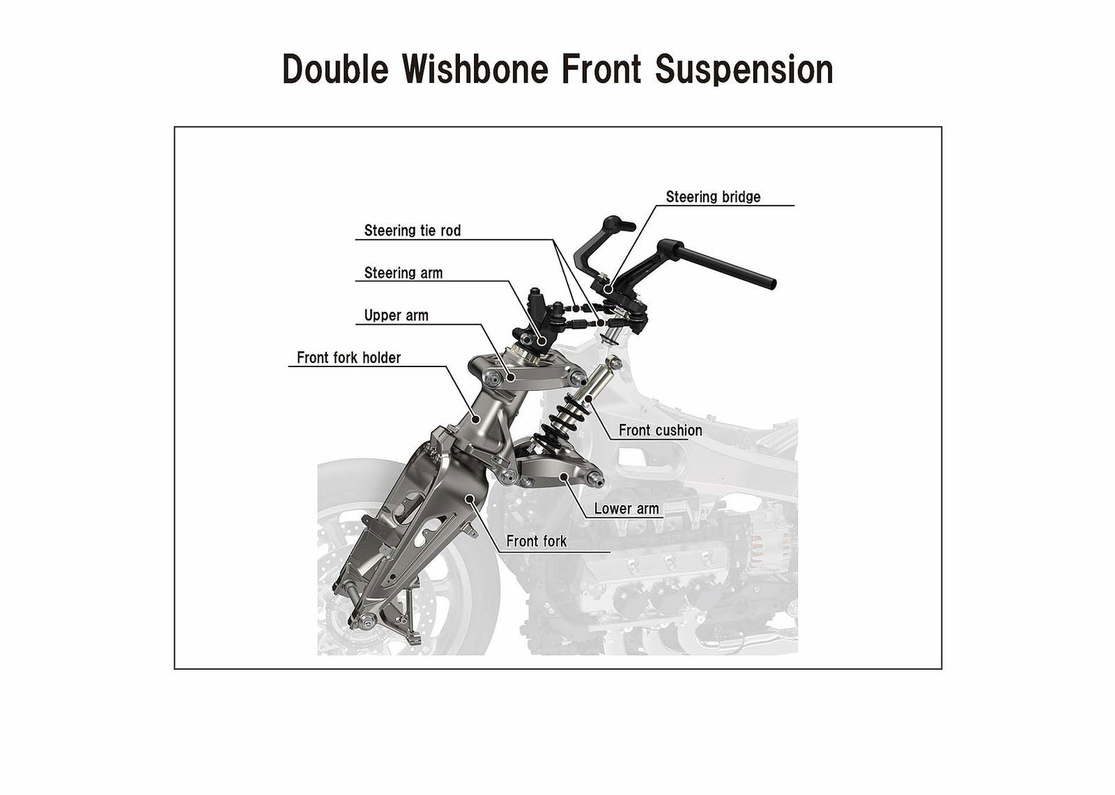 NON È TUTTOAncora: nella versione DCT la Honda GL1800 Gold Wing 2018 è equipaggiata con Start&Stop e ISG (Integrated Starter Generator, un sistema che garantisce un avviamento molto silenzioso), oltre all’HSA (Hill Start Assist) per le partenze in salita. La versione con cambio “manuale” dispone del nuovo cambio a 6 rapporti con frizione assistita e antisaltellamento, mentre sulle moto con DCT il cambio a 7 rapporti lavora secondo i parametri dei Riding Mode. È disponibile una modalità Walking Mode, per parcheggiare comodamente la moto (si muove a 1,8 km/h in avanti, 1,2 km/h in retro).OSSA “PICCOLE”Non sono meno importanti le modifiche aalla ciclistica. La Honda GL1800 Gold Wing 2018 sfrutta un telaio perimetrale in alluminio più compatto e leggero, che ha permesso di spostare il motore in avanti di 40 mm. I numeri delle quote, come sempre, fanno impressione: 30,5° l’inclinazione del cannotto, 1.695 mm l’interasse. Davanti sparisce la forcella e debutta una sospensione a doppio braccio oscillante e cannotto avanzato, simile a quella adottata da BMW, e che promette più comfort. È nuovo il monobraccio, denominato Pro-Arm. L’idraulica delle sospensioni è regolata in maniera attiva dalla centralina in base al Riding Mode selezionato, con motorini passo-passo che muovono gli spilli del passaggio dell’olio, mentre il precarico del mono si regola elettricamente con un pulsante. L’ABS completa l’impianto frenante combinato D-CBS (Dual Combined Braking System), che distribuisce la frenata tra anteriore e posteriore a seconda del Riding Mode selezionato. In totale la nuova Gold Wing pesa 365 kg in ordine di marcia con il pieno, ben 48 kg in meno del precedente modello. Se si opta per la versione DCT/Airbag, però, la massa sale a 383 kg.