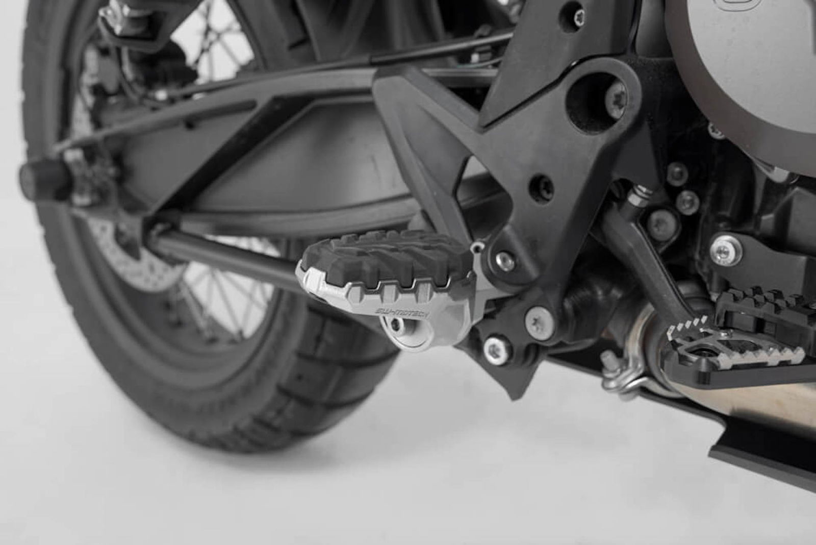Nel catalogo SW-Motech c’è anche il kit di pedane regolabili che aiutano a trovare una posizione ottimale e, allo stesso tempo, forniscono aderenza e stabilità al mezzo. Le pedane regolabili Evo danno modo al rider di scegliere tra 36 varianti e il profilo in gomma può essere facilmente rimosso per affrontare i passaggi off-road più lunghi. Il cavalletto centrale permette invece di parcheggiare la Norden in modo sicuro su terreni accidentati.