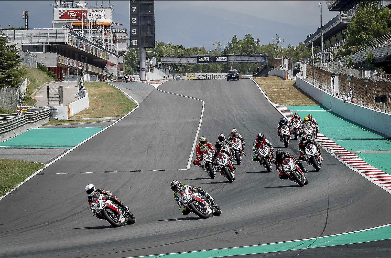 Il motore è particolare. Avevo sentito in passato di un cambio impreciso, ma sulla mia moto (che è l’ultima versione della F3 con motore Euro4) il cambio è assolutamente perfetto sia in salita sia in scalata. Assistito per di più da un Quickshifter molto veloce. I rapporti sono strani, lunghi, molto spaziati tra loro e la trasmissione finale un po’ lunga non aiuta. In alcune curve la seconda è un po’ corta e la terza un po’ lunga. L’erogazione del tre cilindri è ruvida ma efficace, esaltante c’è un bel tiro (per cui spesso si possono usare anche due marce differenti per affrontare la stessa curva), e l’allungo è considerevole, fino a 15.000 giri, consentendo, volendo di tenere la marcia tra una curva e l’altra anche se a 14.000 la spinta finisce per cui conviene cambiare marcia. Insomma con rapporti così spaziati c’è da prenderci un attimo la mano. Vorrei accorciare di un dente la corona ma quella corona non c’è. Per cui mi arrangio e inizio a far scorrere la moto. Nuova Curva Caixa a parte il circuito Montmelò è strepitoso, ma anche ostico, la curva 3 e 4 interminabili e a destra fanno lavorare tantissimo le gomme, soprattutto la posteriore, che raggiunge temperature stratosferiche. Va capito, interpretato per fare meno strada stressare meno gli pneumatici e aprire il gas prima possibile.STEP BY STEPNon mi riesce benissimo all’inizio, ma pian piano miglioro tanto che per il primo turno di qualifiche con gomme usate sto già girando in 1.54 (lo stesso tempo che facevo 10 anni fa con la 1000 e le slick !!!) e oscillo tra la prima e la seconda fila. Siccome in tutte le gare che faccio riesco sempre a trovare qualcuno che mi complica la vita, quel qualcuno nel caso della Coppa F3 è Maria Herrera, la giovane rider spagnola che ha già ben figurato in Moto3 e in SSP300, capace di mettere dietro molti maschietti giovani e arrembanti. Maria, tanto minuta quanto agguerrita, ha uno stile di guida stupendamente pulito e mette dietro tutti rifilando distacchi abissali. Al punto che c’è da chiedersi se stia effettivamente girando sulla nostra stessa pista o ci sia qualche taglio.Q2 ALTRO SECONDO LIMATO