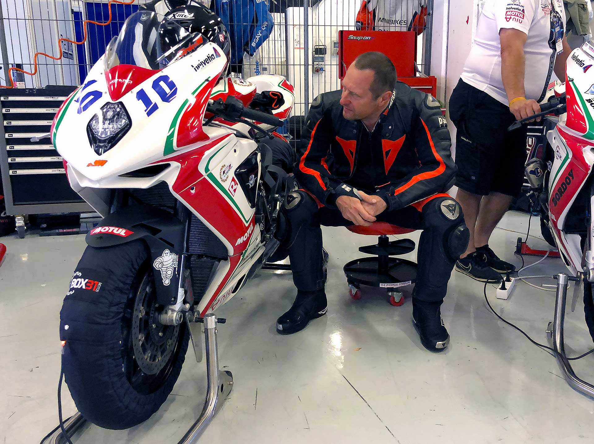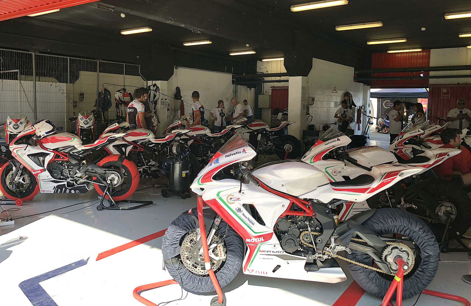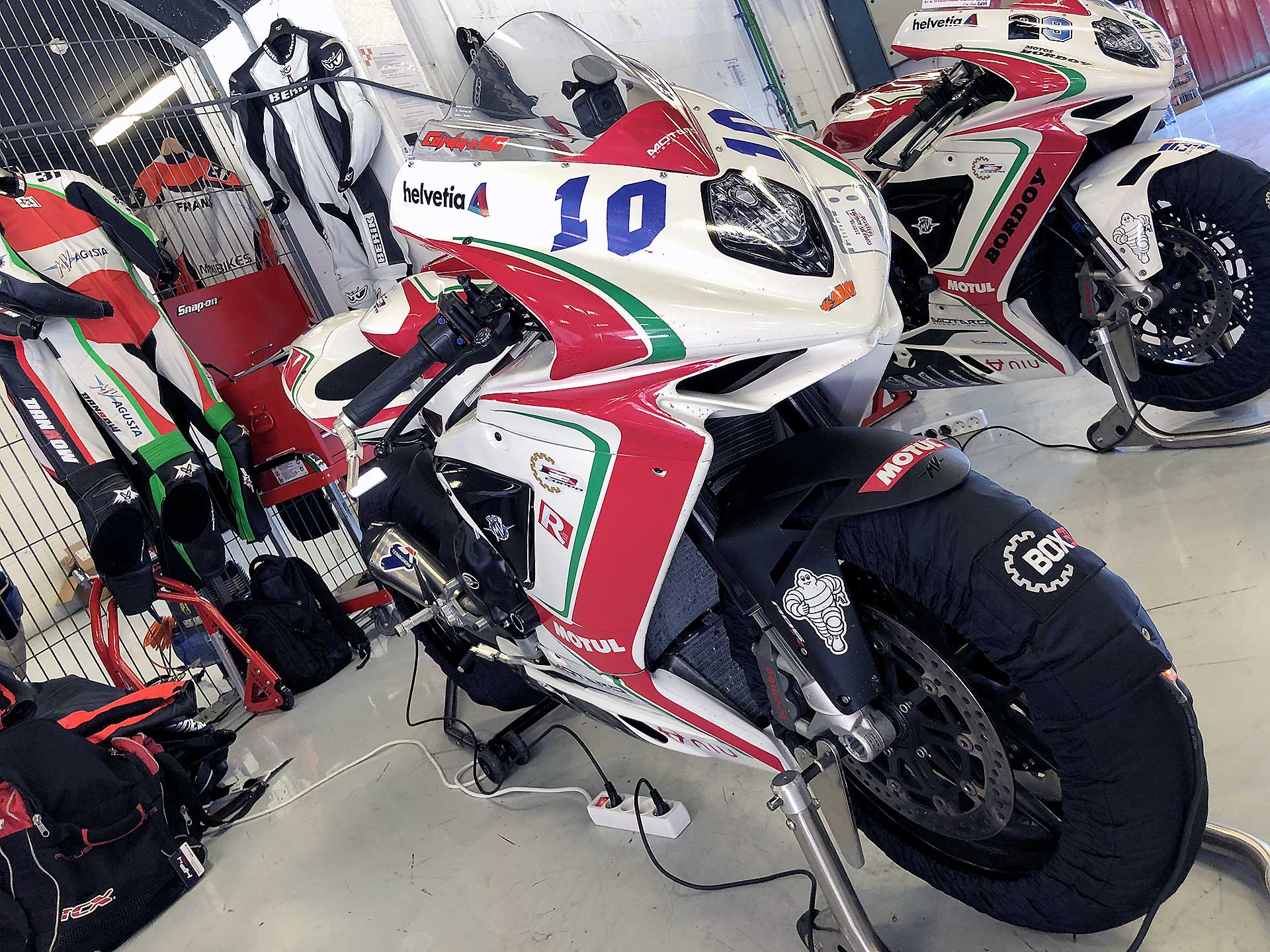La formula della Coppa F3 (organizzata dal promoter Box 31 Motos) è semplice: le moto hanno una preparazione minima, la mappa del motore (preparata espressamente da MV) è conservativa (limitatore abbassato di 600 giri) per permettere di correre a lungo senza problemi (in due anni di trofeo nessun motore rotto), cartuccia forcella e monoammortizzatore TTX sono marchiati Ohlins, rimane montato sulla moto addirittura il modulatore dell’ABS (comunque bypassato, ma non si può togliere per non mandare in protezione l’elettronica) e compare uno scarico Termignoni con una voce che pare Bocelli. https://youtu.be/4b2I3inyOmg Tutto il resto è assolutamente di serie. La formula è studiata per rendere i costi accettabili. Con 17.500 euro, infatti, si entra in possesso di una fiammante MV Agusta F3 675, di tutto il kit, di un treno di gomme e si è pronti per correre su sei circuiti top della spagna (Jerez – Aragon – Albacete – Barcellona – Valencia e il nuovo circuito di Andalucia che ha così tante curve da sembrare un intesino). Il premio per il vincitore è una Brutale 800 RR. Direi appetibile.MONOGOMMA COL BIBENDUM