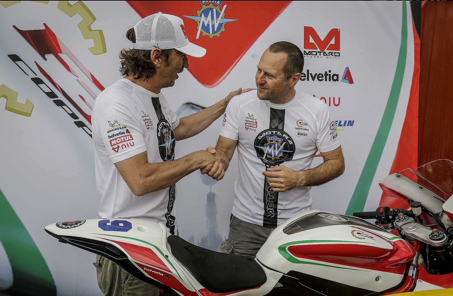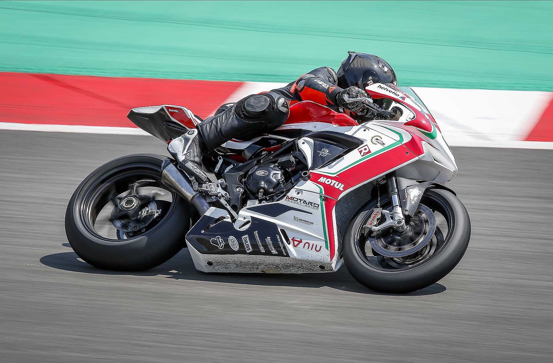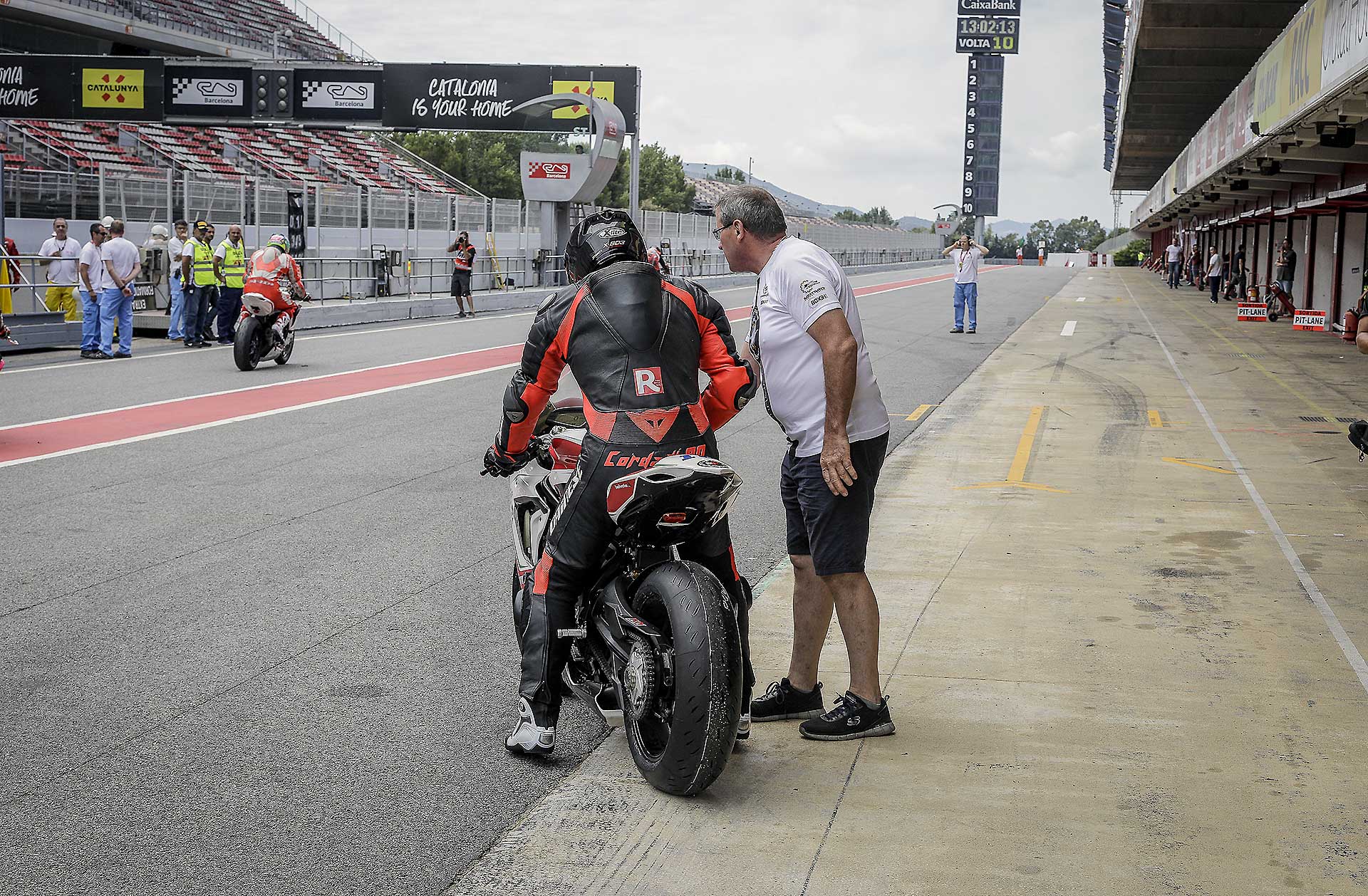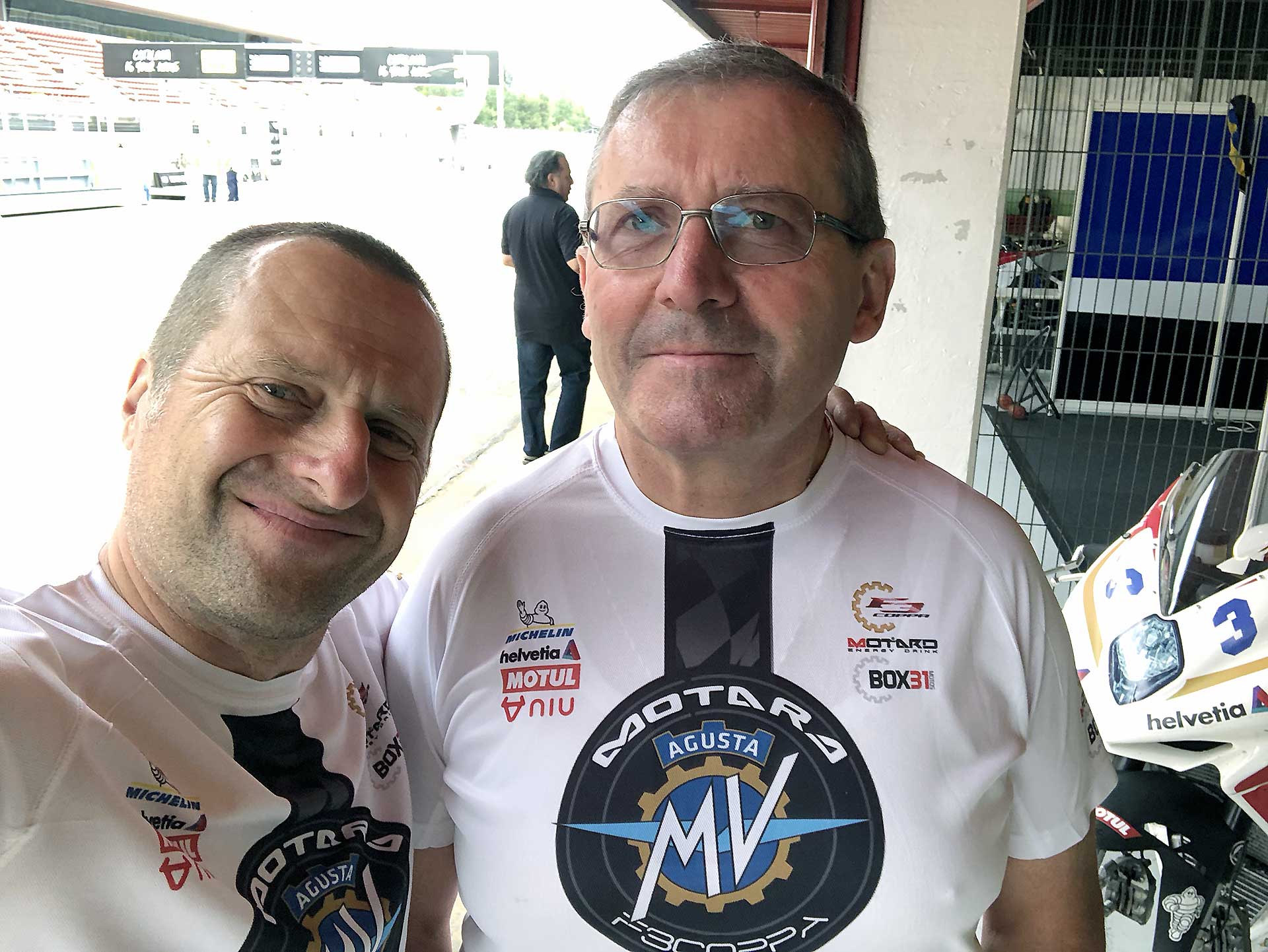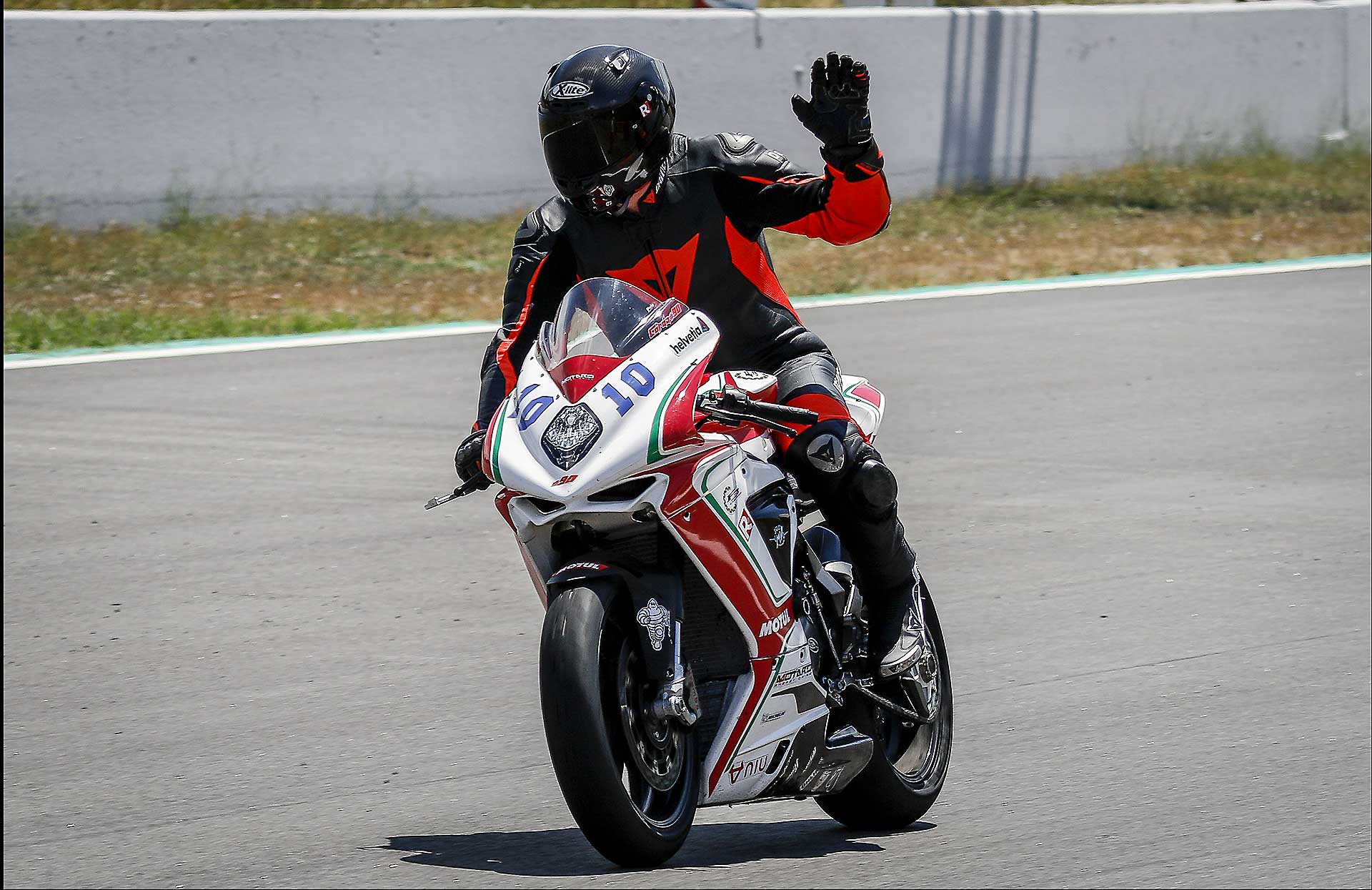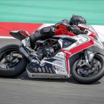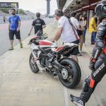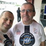 Ovviamente quando parto per questi miei voli pindarici trascino sempre con me Max Tresoldi che ormai mi sopporta da 13 anni e che, conoscendo come le sue tasche i miei gusti e le mie esigenze in fatto di moto da corsa, potrà accelerare il processo di conoscenza con la moto. In effetti non ero più abituato a queste comparsate, arrivare il sabato mattina in pista, senza essere mai salito su una moto e darci dentro subito non è la cosa più facile del mondo. In più, qui la prospettiva era di partire subito dalle prove di qualificazione, il che non mi lasciava per nulla tranquillo. Per fortuna è saltato fuori un turno di prove libere mattutine che mi ha consentito di prendere almeno confidenza con moto e pista. Pista che negli anni è cambiata diventando peggiore perché la curva Caixa (quella famosa della “spalla per terra” della MotoGP) è stata anticipata e ora segue il percorso della formula 1. Orribile. Una curva che sarebbe stretta anche per la rampa del box, figuriamoci per correre. https://youtu.be/9EHTzBbd6kIParto con gomme usate, la posteriore è una Ultimate già vissutella e ci do dentro da subito, non è che ci sia tutto questo tempo per guardarsi attorno. Ovviamente mi produco in una interessante sequenza di dritti, larghi e traiettorie sbagliate. Ma trovo anche una moto già molto a punto di ciclistica che senti in mano da subito e mi piace molto. L’assetto è tendenzialmente “seduto” la MV ha una seduta molto orizzontale e poco puntata sul davanti e questo la rende formdabile in staccata. L’avantreno è spettacolare, scava l’asfalto è sempre molto “presente” e lavora bene con la Michelin Power Cup che onestamente mi ha sorpreso. Grande rapidità di manovra, l’agilità è davvero di alto livello e giro dopo giro capisco quanto ci stiamo perdendo abbandonando le medie cilindrate.TRE CILINDRI CHE CONVINCE