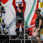 Gonzalez vola via all’ultima curva, lo vediamo gattonare a bordo pista, ma non mi rendo nemmeno conto che è lui preso come sono a cercare di passare quella maledetta MV numero 141. E’ l’ultimo giro sono in apnea apro così presto che gli sono addosso, ma Israel è bravo mi chiude un paio di porte in faccia nei punti di possibile sorpasso. Potrei tentare un numero alla Valentino Rossi su Lorenzo all’ultima curva ma io non sono Rossi e ogni volta che passo di li mi chiedo come diavolo abbia fatto a passare in quel punto. Finiamo uno dietro l’altro, in volata. Solo dopo aver tagliato il traguardo mi rendo conto di essere sul podio. E sono contento. Si contento come un bambino a cui hanno ridato il gioco preferito. Perché le corse sono questo, un gioco bellissimo a cui, anche se ormai come ha scritto mio padre su Facebook “hai pur sempre quasi 51 anni e due figli” una volta iniziato a giocare è difficile rinunciare.