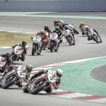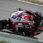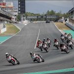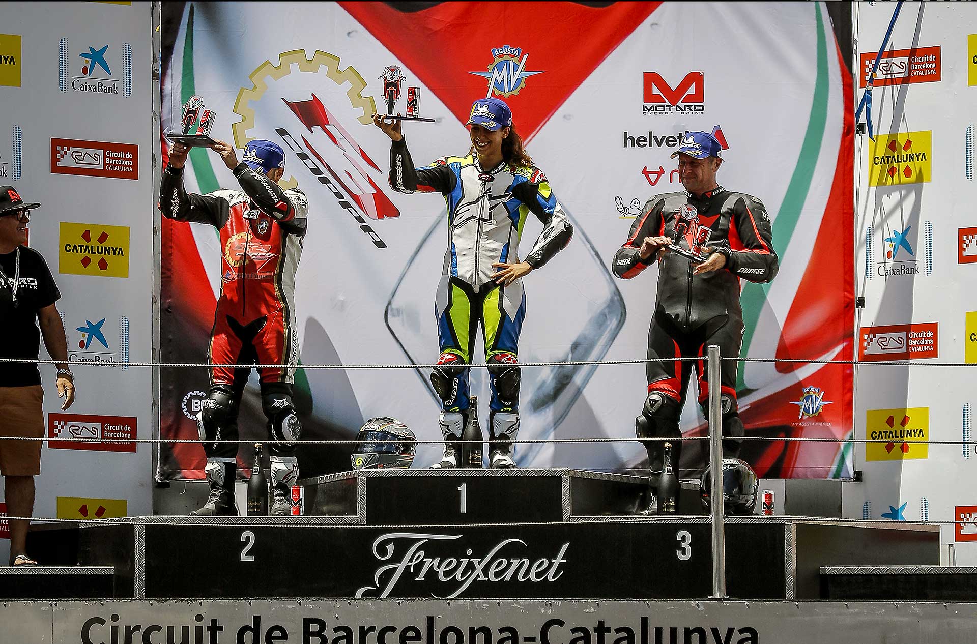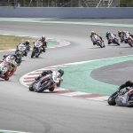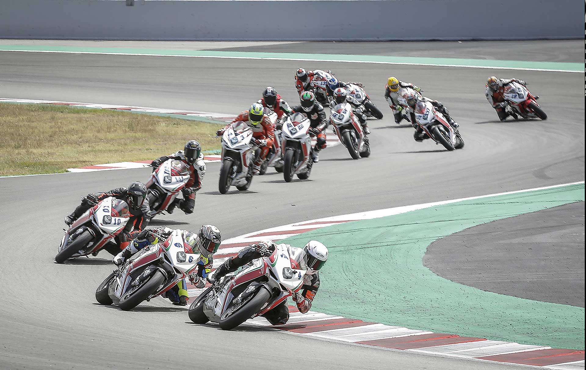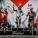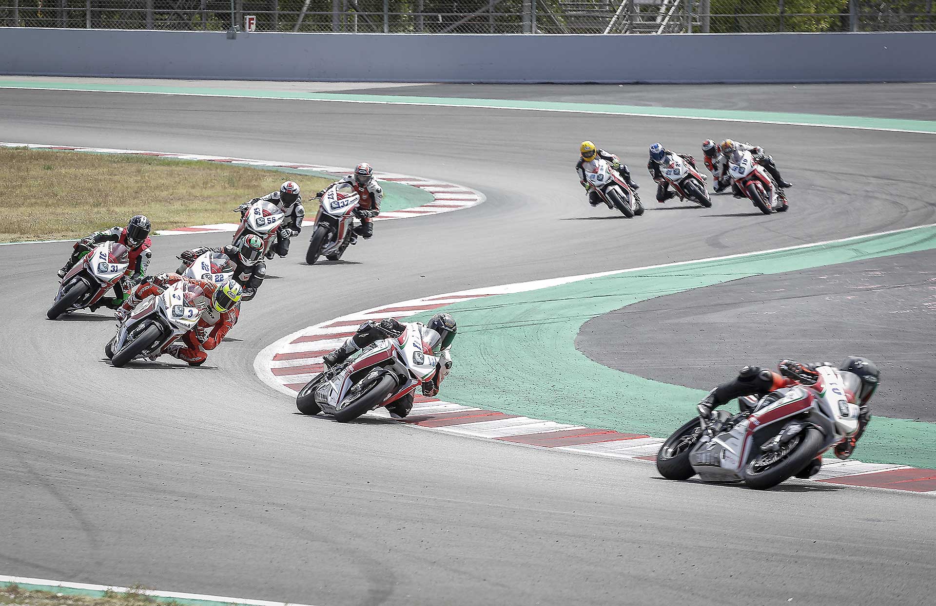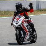 Il motore è particolare. Avevo sentito in passato di un cambio impreciso, ma sulla mia moto (che è l’ultima versione della F3 con motore Euro4) il cambio è assolutamente perfetto sia in salita sia in scalata. Assistito per di più da un Quickshifter molto veloce. I rapporti sono strani, lunghi, molto spaziati tra loro e la trasmissione finale un po’ lunga non aiuta. In alcune curve la seconda è un po’ corta e la terza un po’ lunga. L’erogazione del tre cilindri è ruvida ma efficace, esaltante c’è un bel tiro (per cui spesso si possono usare anche due marce differenti per affrontare la stessa curva), e l’allungo è considerevole, fino a 15.000 giri, consentendo, volendo di tenere la marcia tra una curva e l’altra anche se a 14.000 la spinta finisce per cui conviene cambiare marcia. Insomma con rapporti così spaziati c’è da prenderci un attimo la mano. Vorrei accorciare di un dente la corona ma quella corona non c’è. Per cui mi arrangio e inizio a far scorrere la moto. Nuova Curva Caixa a parte il circuito Montmelò è strepitoso, ma anche ostico, la curva 3 e 4 interminabili e a destra fanno lavorare tantissimo le gomme, soprattutto la posteriore, che raggiunge temperature stratosferiche. Va capito, interpretato per fare meno strada stressare meno gli pneumatici e aprire il gas prima possibile.STEP BY STEPNon mi riesce benissimo all’inizio, ma pian piano miglioro tanto che per il primo turno di qualifiche con gomme usate sto già girando in 1.54 (lo stesso tempo che facevo 10 anni fa con la 1000 e le slick !!!) e oscillo tra la prima e la seconda fila. Siccome in tutte le gare che faccio riesco sempre a trovare qualcuno che mi complica la vita, quel qualcuno nel caso della Coppa F3 è Maria Herrera, la giovane rider spagnola che ha già ben figurato in Moto3 e in SSP300, capace di mettere dietro molti maschietti giovani e arrembanti. Maria, tanto minuta quanto agguerrita, ha uno stile di guida stupendamente pulito e mette dietro tutti rifilando distacchi abissali. Al punto che c’è da chiedersi se stia effettivamente girando sulla nostra stessa pista o ci sia qualche taglio.Q2 ALTRO SECONDO LIMATO