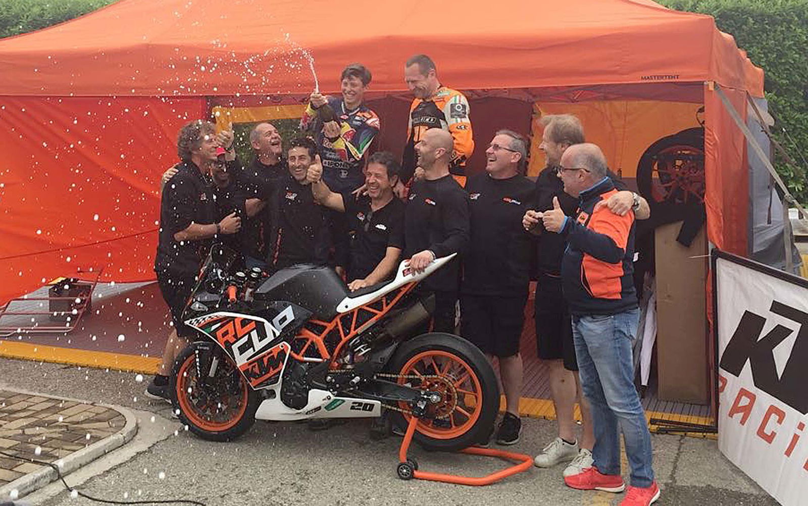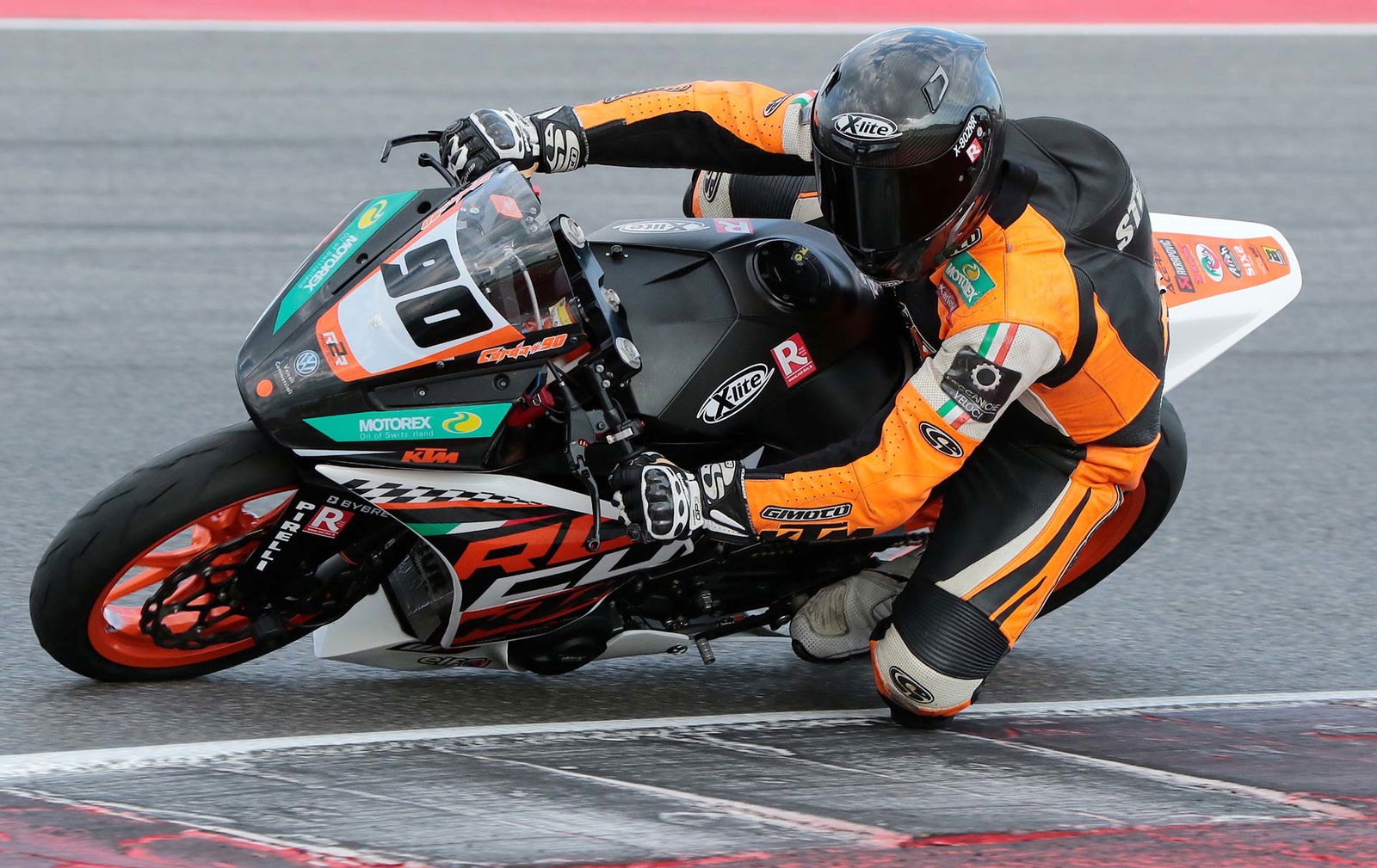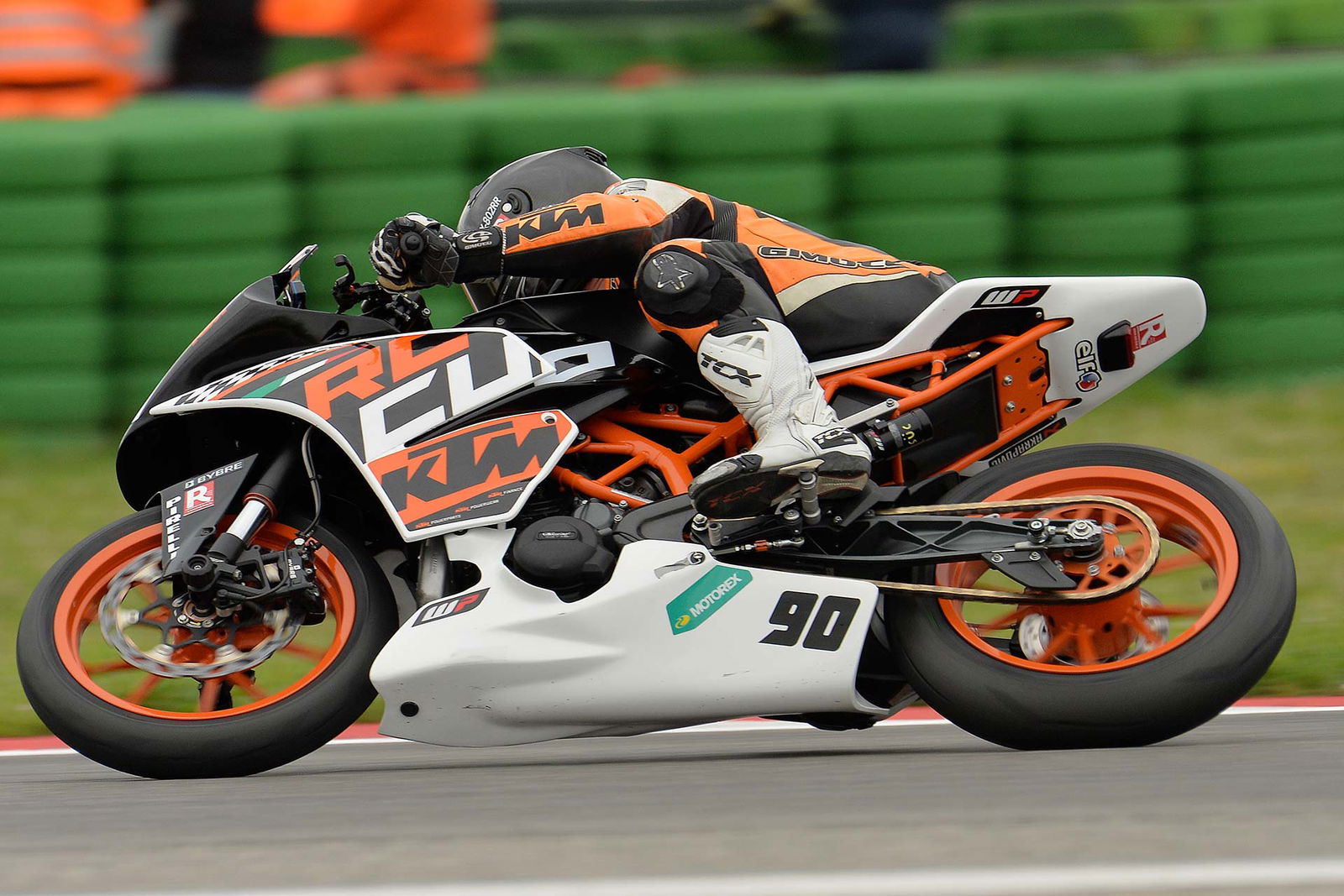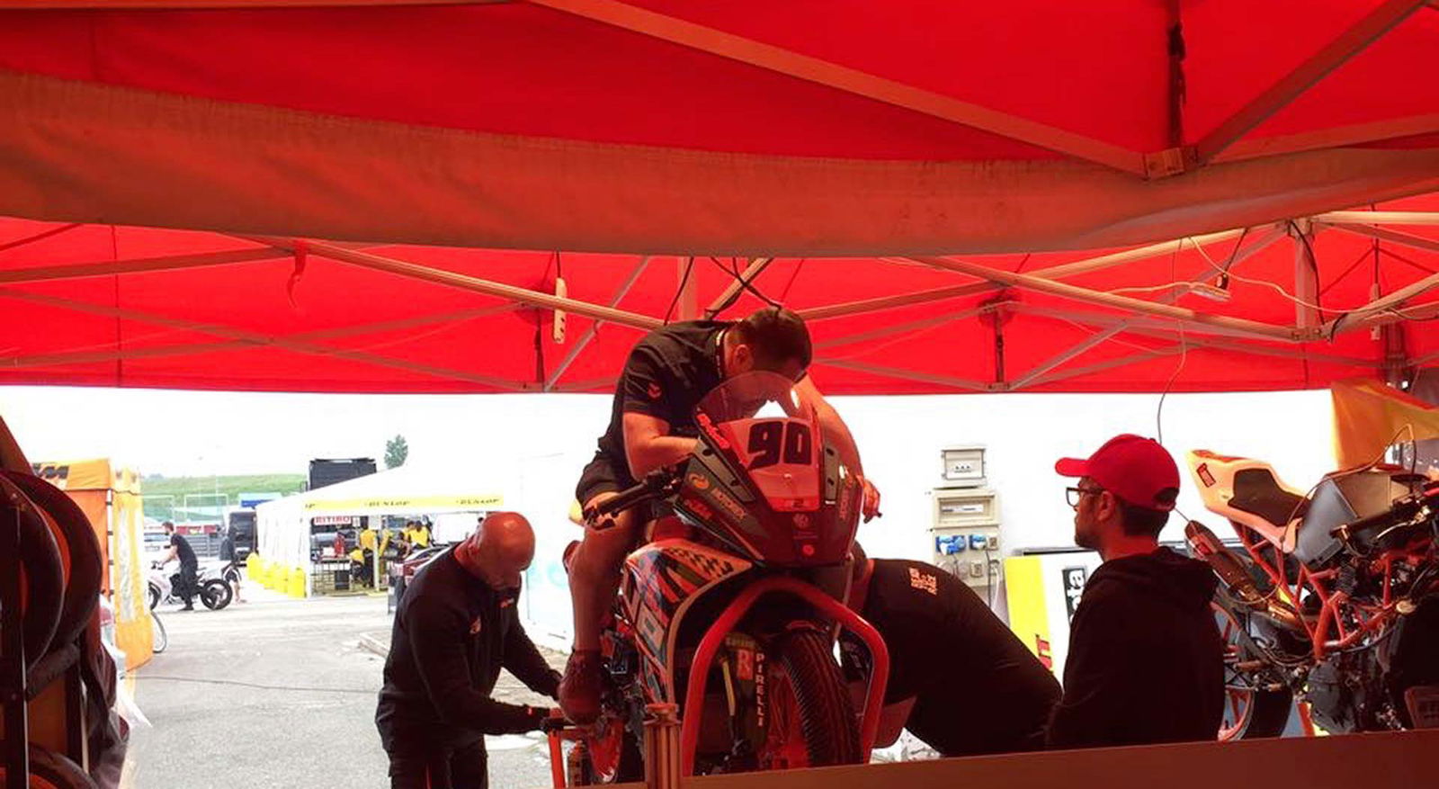 Motori al minimo. Guardo a sinistra, mi rendo conto che se sommo l’età dei due piloti che mi affiancano sulla griglia di partenza il risultato supera di poco la metà dei miei anni. C’è davvero da chiedersi cosa diavolo ci faccio qui io in mezzo a questa masnada di mocciosi dal polso molto (troppo) snodato. In griglia al CIV, nel 2017. Quando ho chiesto di fare la licenza credevo mi concedessero al massimo la carta argento delle FS, invece incredibilmente i medici mi hanno detto che sono molto “fit” ed eccomi qui… Ok ok. Lo so. Avevo promesso che dopo l’esperienza con la BMW ufficiale di Badovini al CIV nel 2012 avrei smesso. Infatti, ho smesso. Da li in poi basta gare, solo test. Nella vita c’è un tempo per tutto, ho pensato…TU CHIAMALE SE VUOI, EMOZIONI…Però… Però “quella roba li” che ti prende nei minuti prima del via, quel misto di adrenalina, concentrazione, pathos che provi solo quando sei, con la frizione in mano, in attesa che si spenga il semaforo non è una cosa che riesci a scrollarti di dosso facilmente. Si, sono ancora qui, in pista, in gara. Sapete com’è: dicono che quando si diventa anziani si ritorna anche un po’ bambini. Quindi ho ricominciato dal basso. Tradotto: 45 cv e 140 kg di una monocilindrica da 375 cc. Già, la griglia è quella della Supersport 300. So già quello a cui starete pensando: “questo si è bevuto il cervello”, “il classico colpo di coda del cinquantenne che vuole ancora sentirsi giovane”. Ma dietro a questa piccola pazzia c’è dell’altro, c’è un progetto, un lavoro di sviluppo. È questo che mi ha convinto a rimettere tuta, casco e licenza nel borsone e prendere la strada per Misano Adriatico. Quando ero giovane avevo tanti sogni: molti li ho realizzati, uno invece, quello tipicamente ingegneristico di poter lavorare allo sviluppo di un prodotto, mi mancava. Beh anche questo in parte lo potrò coronare. In futuro se chi correrà nella SSP300 potrà contare su una KTM RC390 competitiva in piccolissima parte sarà anche frutto del mio lavoro. Questo mi rende particolarmente orgoglioso.CONTINUA A LEGGERE –> VAI A PAGINA 2Perché la RC390? Perché il campionato Supersport 300? I motivi sono vari, questa moto mi ha fatto assaporare il gusto di correre con una piccola cilindrata durante l’evento un po’ pazzo che KTM organizzò all’autodromo di Modena per farci conoscere meglio la RC390 in versione trofeo.UN CAMPIONATO GIOIELLO