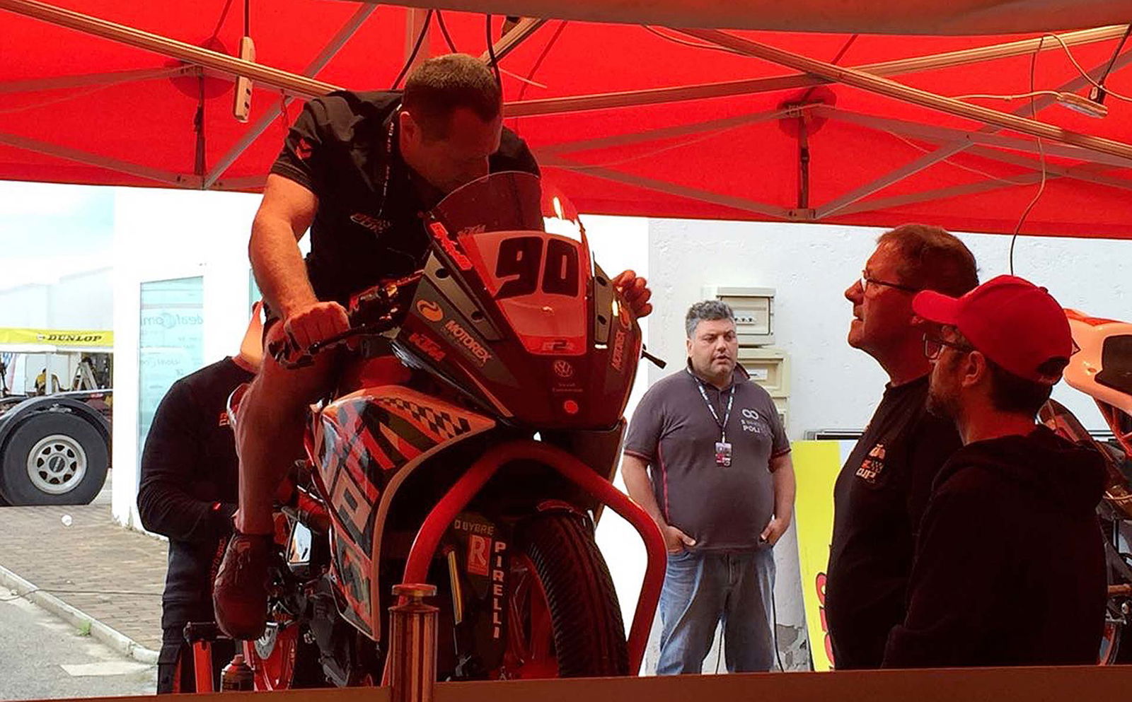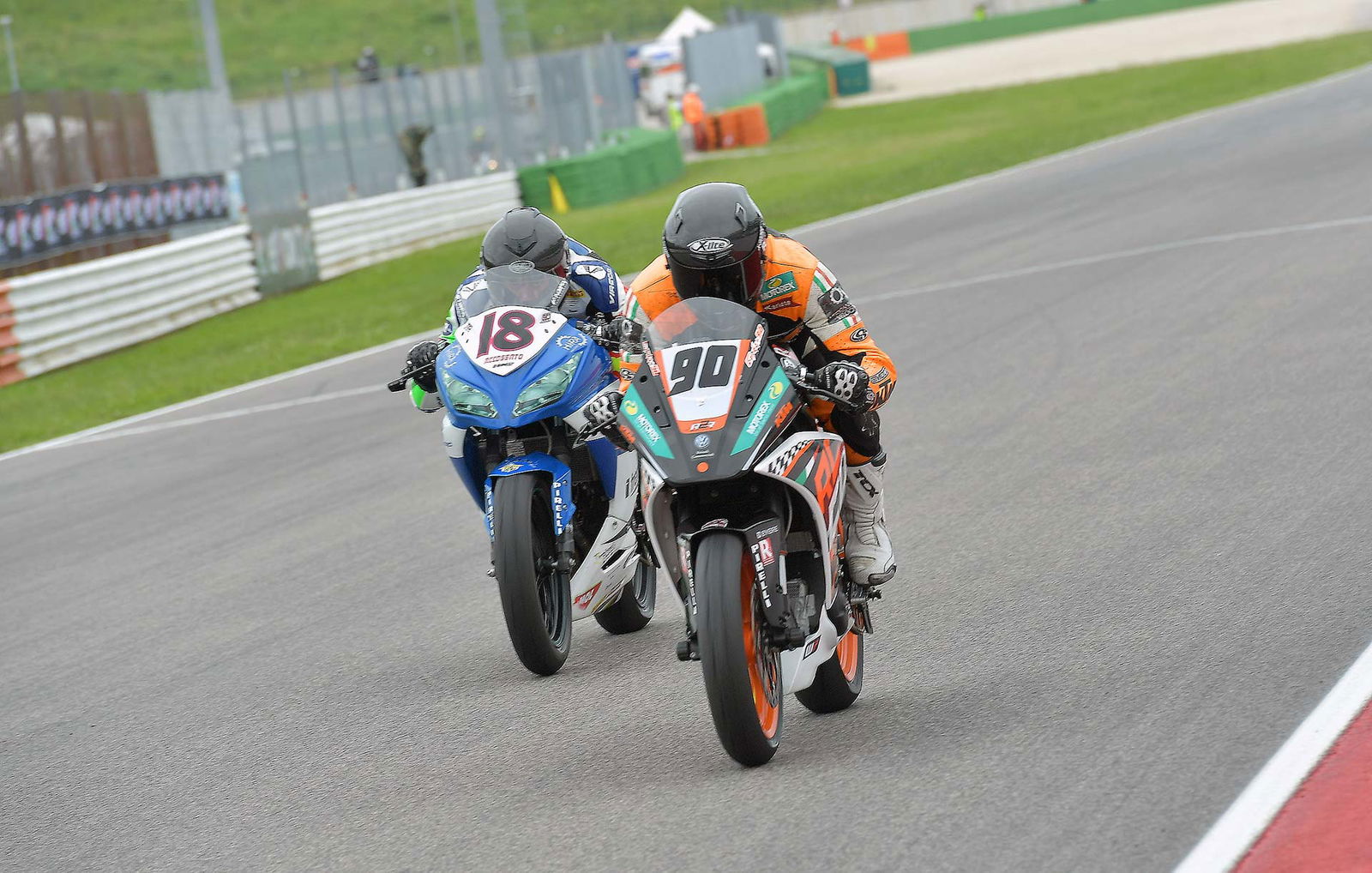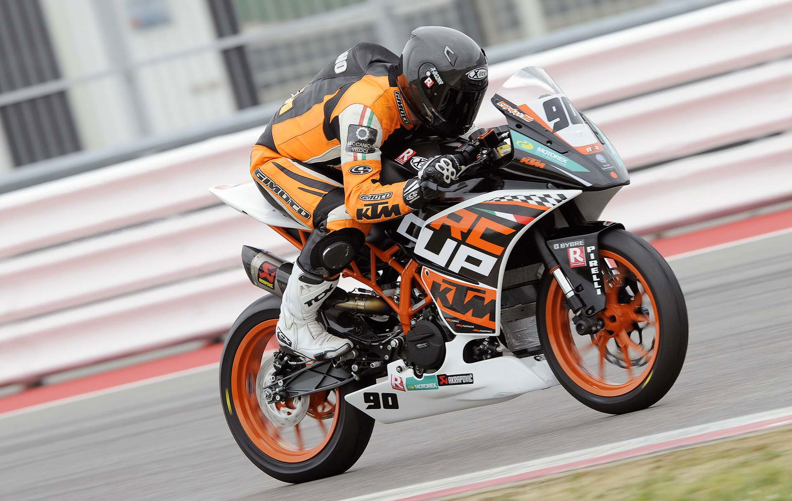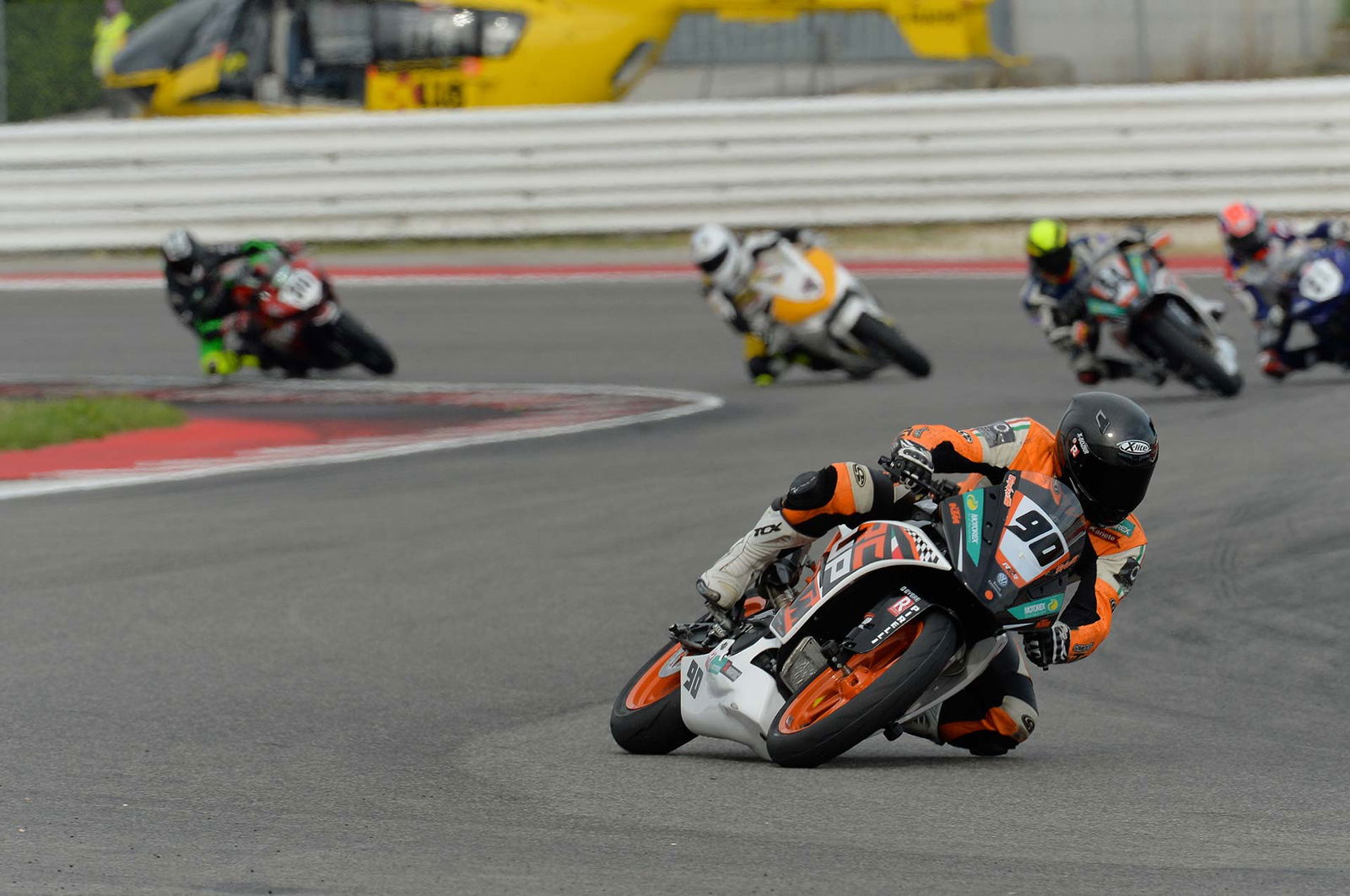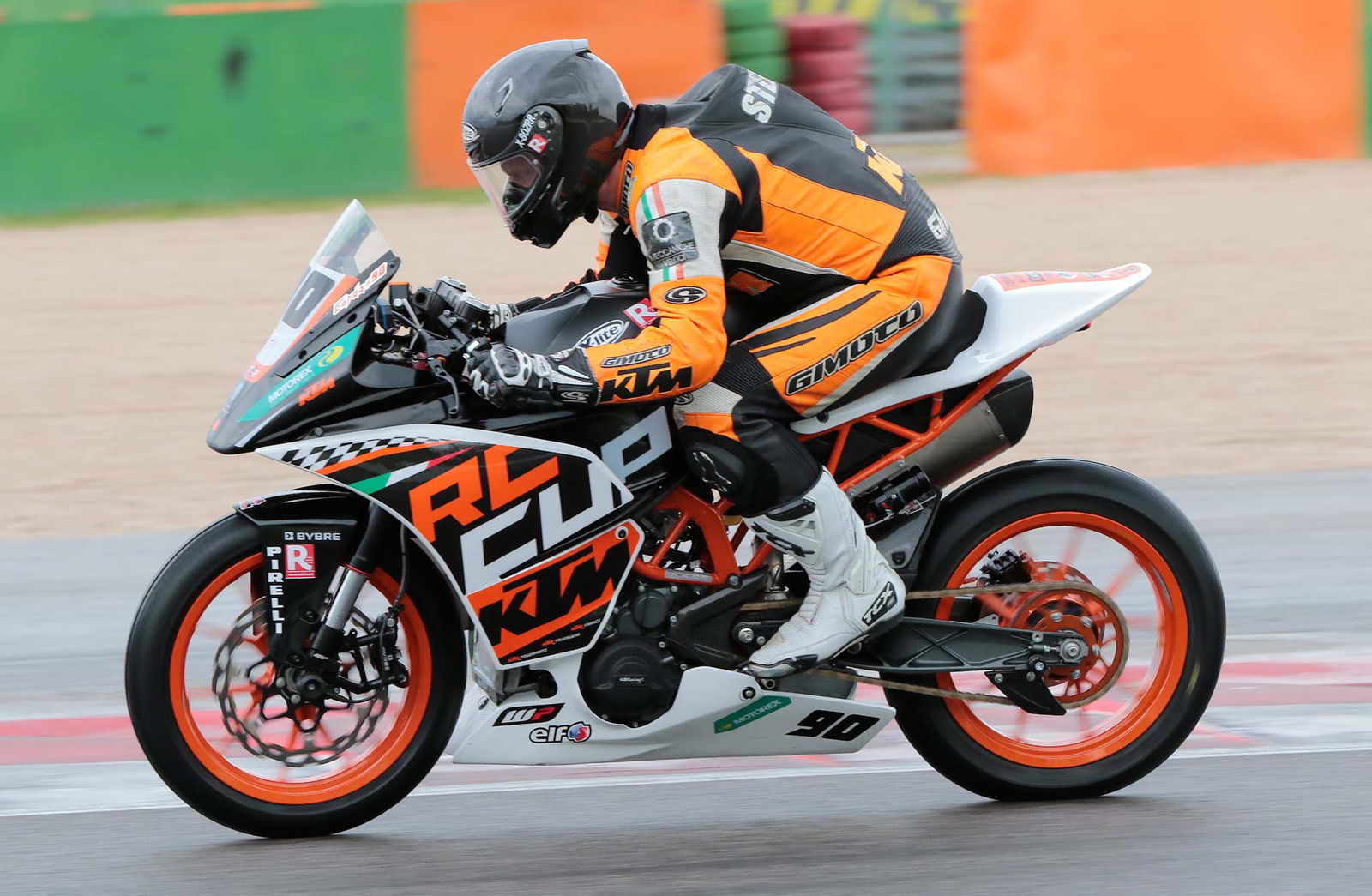 Motori al minimo. Guardo a sinistra, mi rendo conto che se sommo l’età dei due piloti che mi affiancano sulla griglia di partenza il risultato supera di poco la metà dei miei anni. C’è davvero da chiedersi cosa diavolo ci faccio qui io in mezzo a questa masnada di mocciosi dal polso molto (troppo) snodato. In griglia al CIV, nel 2017. Quando ho chiesto di fare la licenza credevo mi concedessero al massimo la carta argento delle FS, invece incredibilmente i medici mi hanno detto che sono molto “fit” ed eccomi qui… Ok ok. Lo so. Avevo promesso che dopo l’esperienza con la BMW ufficiale di Badovini al CIV nel 2012 avrei smesso. Infatti, ho smesso. Da li in poi basta gare, solo test. Nella vita c’è un tempo per tutto, ho pensato…TU CHIAMALE SE VUOI, EMOZIONI…Però… Però “quella roba li” che ti prende nei minuti prima del via, quel misto di adrenalina, concentrazione, pathos che provi solo quando sei, con la frizione in mano, in attesa che si spenga il semaforo non è una cosa che riesci a scrollarti di dosso facilmente. Si, sono ancora qui, in pista, in gara. Sapete com’è: dicono che quando si diventa anziani si ritorna anche un po’ bambini. Quindi ho ricominciato dal basso. Tradotto: 45 cv e 140 kg di una monocilindrica da 375 cc. Già, la griglia è quella della Supersport 300. So già quello a cui starete pensando: “questo si è bevuto il cervello”, “il classico colpo di coda del cinquantenne che vuole ancora sentirsi giovane”. Ma dietro a questa piccola pazzia c’è dell’altro, c’è un progetto, un lavoro di sviluppo. È questo che mi ha convinto a rimettere tuta, casco e licenza nel borsone e prendere la strada per Misano Adriatico. Quando ero giovane avevo tanti sogni: molti li ho realizzati, uno invece, quello tipicamente ingegneristico di poter lavorare allo sviluppo di un prodotto, mi mancava. Beh anche questo in parte lo potrò coronare. In futuro se chi correrà nella SSP300 potrà contare su una KTM RC390 competitiva in piccolissima parte sarà anche frutto del mio lavoro. Questo mi rende particolarmente orgoglioso.CONTINUA A LEGGERE –> VAI A PAGINA 2Perché la RC390? Perché il campionato Supersport 300? I motivi sono vari, questa moto mi ha fatto assaporare il gusto di correre con una piccola cilindrata durante l’evento un po’ pazzo che KTM organizzò all’autodromo di Modena per farci conoscere meglio la RC390 in versione trofeo.UN CAMPIONATO GIOIELLO