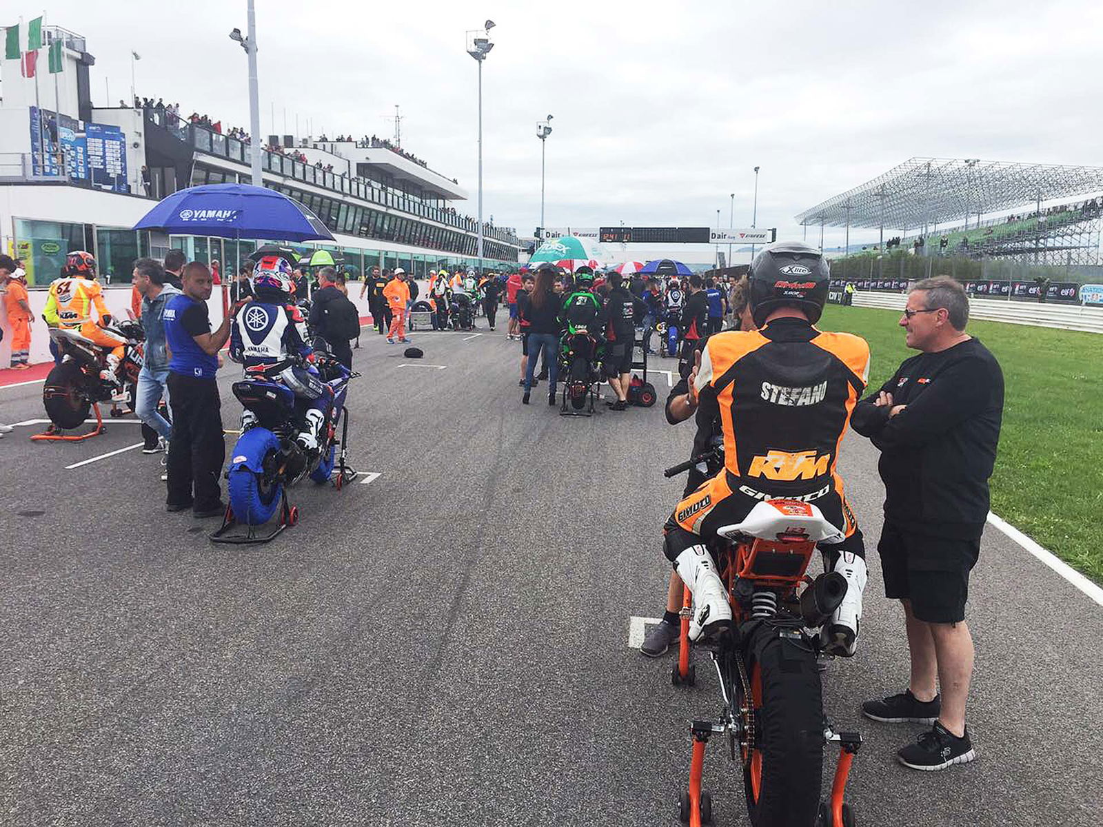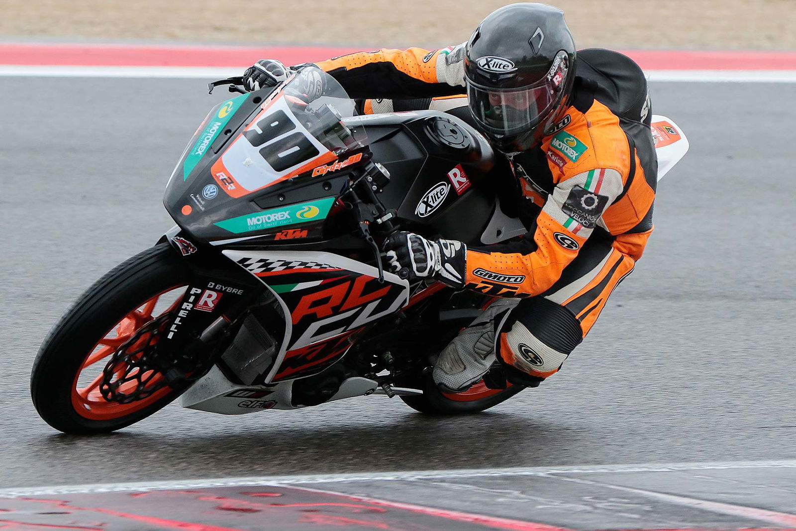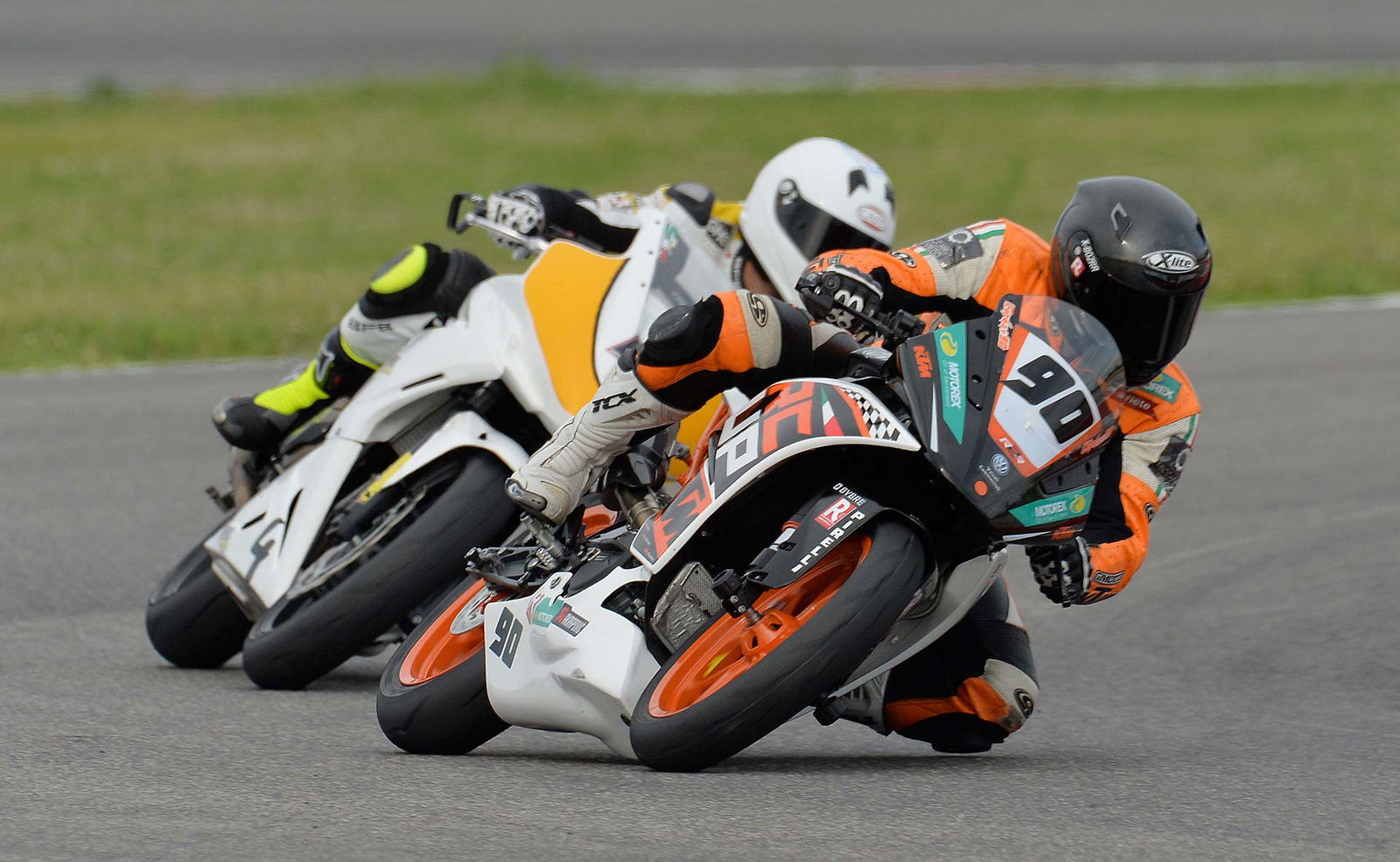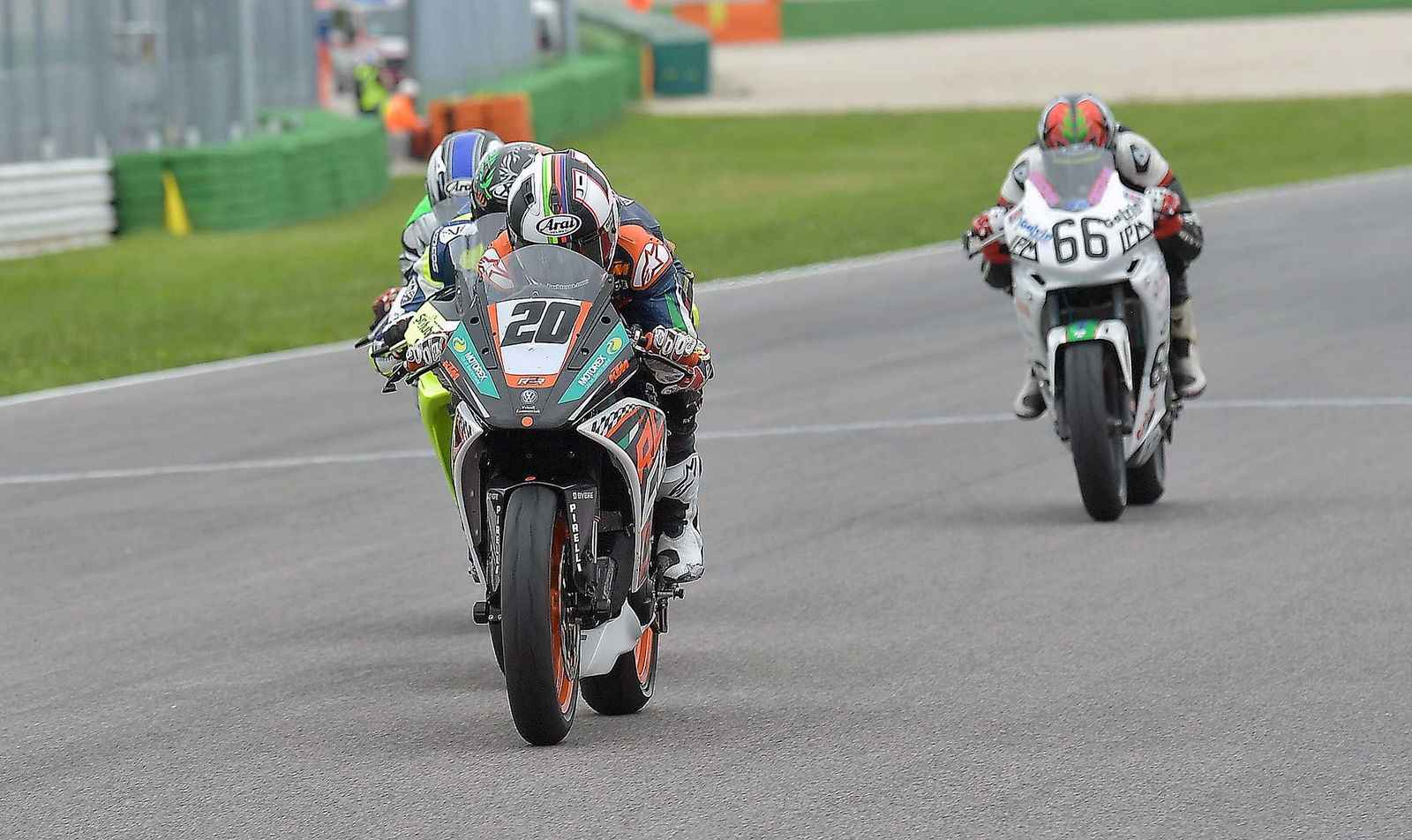 Motori al minimo. Guardo a sinistra, mi rendo conto che se sommo l’età dei due piloti che mi affiancano sulla griglia di partenza il risultato supera di poco la metà dei miei anni. C’è davvero da chiedersi cosa diavolo ci faccio qui io in mezzo a questa masnada di mocciosi dal polso molto (troppo) snodato. In griglia al CIV, nel 2017. Quando ho chiesto di fare la licenza credevo mi concedessero al massimo la carta argento delle FS, invece incredibilmente i medici mi hanno detto che sono molto “fit” ed eccomi qui… Ok ok. Lo so. Avevo promesso che dopo l’esperienza con la BMW ufficiale di Badovini al CIV nel 2012 avrei smesso. Infatti, ho smesso. Da li in poi basta gare, solo test. Nella vita c’è un tempo per tutto, ho pensato…TU CHIAMALE SE VUOI, EMOZIONI…Però… Però “quella roba li” che ti prende nei minuti prima del via, quel misto di adrenalina, concentrazione, pathos che provi solo quando sei, con la frizione in mano, in attesa che si spenga il semaforo non è una cosa che riesci a scrollarti di dosso facilmente. Si, sono ancora qui, in pista, in gara. Sapete com’è: dicono che quando si diventa anziani si ritorna anche un po’ bambini. Quindi ho ricominciato dal basso. Tradotto: 45 cv e 140 kg di una monocilindrica da 375 cc. Già, la griglia è quella della Supersport 300. So già quello a cui starete pensando: “questo si è bevuto il cervello”, “il classico colpo di coda del cinquantenne che vuole ancora sentirsi giovane”. Ma dietro a questa piccola pazzia c’è dell’altro, c’è un progetto, un lavoro di sviluppo. È questo che mi ha convinto a rimettere tuta, casco e licenza nel borsone e prendere la strada per Misano Adriatico. Quando ero giovane avevo tanti sogni: molti li ho realizzati, uno invece, quello tipicamente ingegneristico di poter lavorare allo sviluppo di un prodotto, mi mancava. Beh anche questo in parte lo potrò coronare. In futuro se chi correrà nella SSP300 potrà contare su una KTM RC390 competitiva in piccolissima parte sarà anche frutto del mio lavoro. Questo mi rende particolarmente orgoglioso.CONTINUA A LEGGERE –> VAI A PAGINA 2Perché la RC390? Perché il campionato Supersport 300? I motivi sono vari, questa moto mi ha fatto assaporare il gusto di correre con una piccola cilindrata durante l’evento un po’ pazzo che KTM organizzò all’autodromo di Modena per farci conoscere meglio la RC390 in versione trofeo.UN CAMPIONATO GIOIELLO