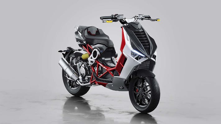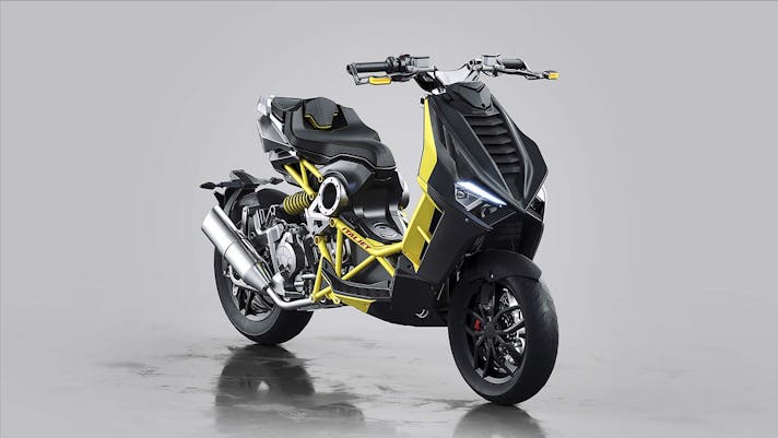 Il manubrio è in alluminio pressofuso e adotta semimanubri laterali, il serbatoio da 9 litri è posto sotto la pedana poggiapiedi, per abbassare il baricentro e garantire una buona distribuzione dei pesi. Quasi scontato parlare di motori, che tuttavia scontati non sono: 125 cc e 200 cc, entrambi 4 tempi, 4 valvole, con sistema d’iniezione elettronica e raffreddamento a liquido (due radiatori); nella cilindrata più alta la potenza raggiunge il ragguardevole valore di 20 cv. Sono montati orizzontalmente.