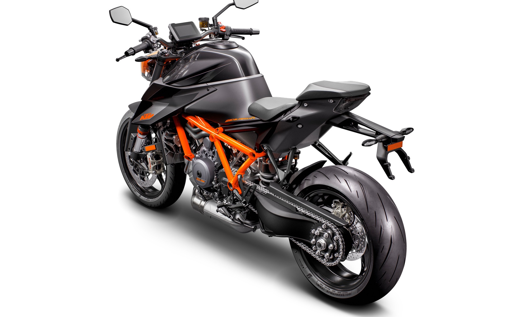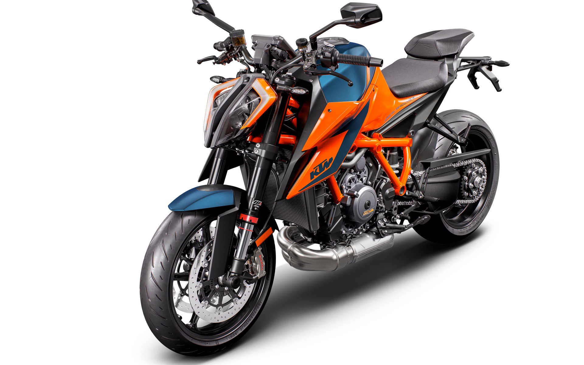 La KTM 1290 Super Duke R 2020 cambia però anche a livello di telaio. La struttura mantiene lo schema a traliccio con tubi d’acciaio al cromo-molibdeno ma il suo disegno è ora più semplice e pulito. Anche il telaietto ausiliario posteriore è inedito ed è realizzato alternando alluminio e materiali compositi. La bilancia premia queste scelte fermando l’ago a 189 kg, sei meno di quelli fatti segnare dal model year 2019. Le sospensioni sono WP Apex completamente regolabili e il mono ammortizzatore ora è lavorato dal forcellone monobraccio attraverso nuovi levaraggi. I freni sono invece Brembo, con le pregiate pinze della linea Stylema a mordere la coppia di dischi anteriori.