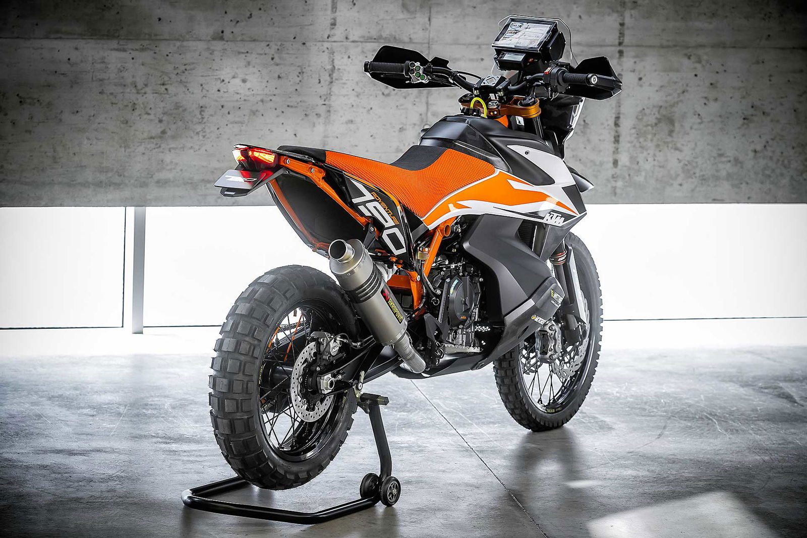 Da un punto di vista estetico, la KTM 790 Adventure Concept evolve le linee delle moto a catalogo, restando fedele a forme moderne e tagli geometrici, specie a livello del cupolino. Le sovrastrutture in stile raid lasciano in vista i tubi in acciaio del telaio a traliccio, che lavora a braccetto con le immancabili sospensioni WP. Un’altra presenza scontata è quella del forcellone a doppio braccio in alluminio con le nervature di rinforzo in vista, una specie di marchio di fabbrica KTM.