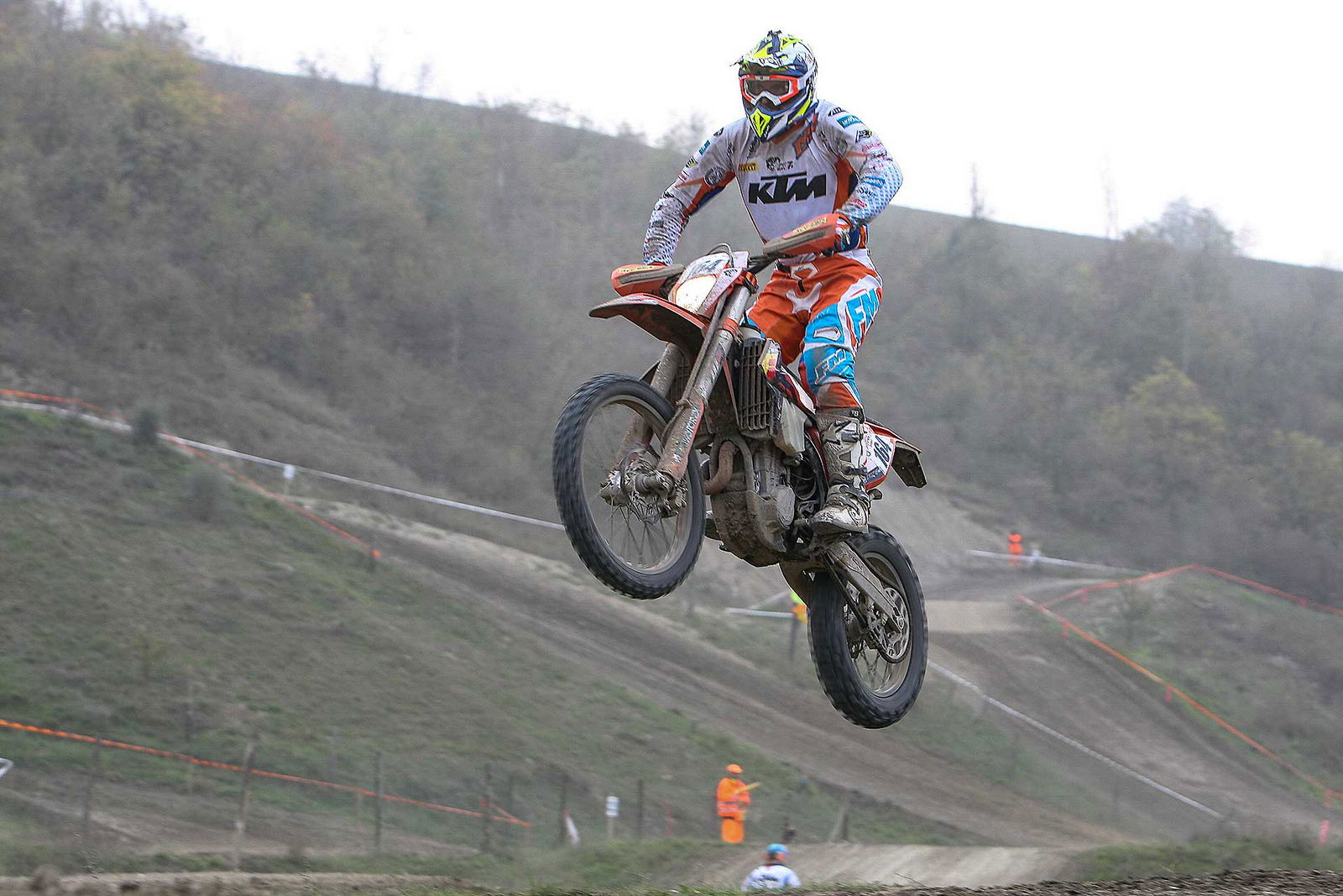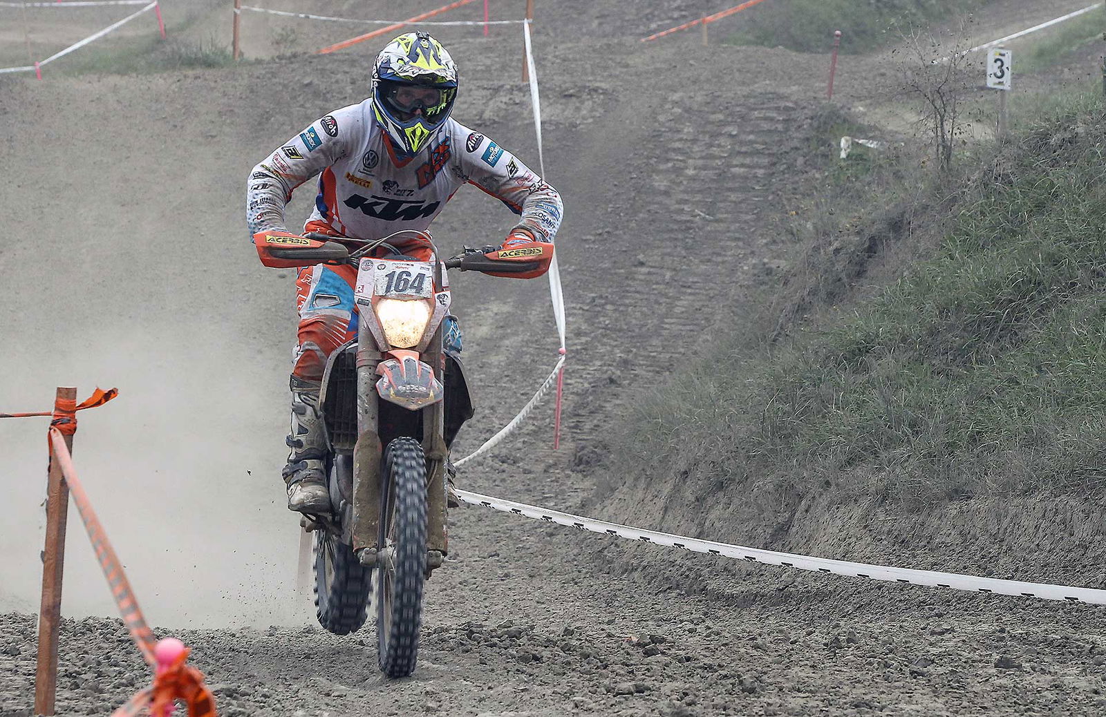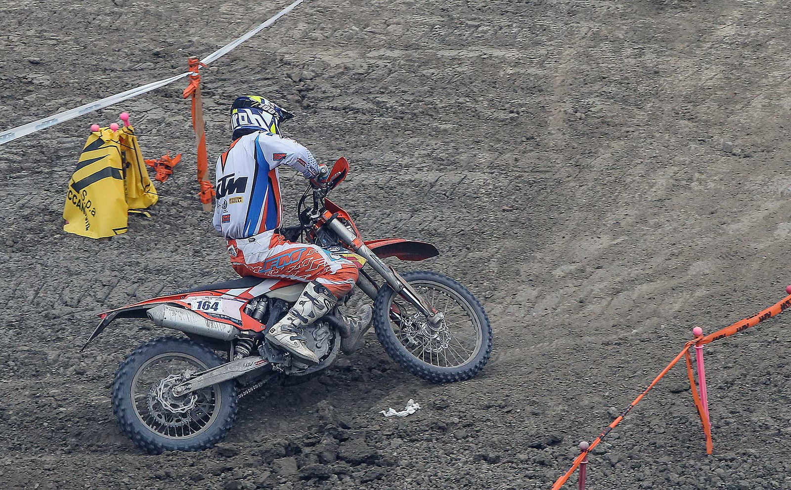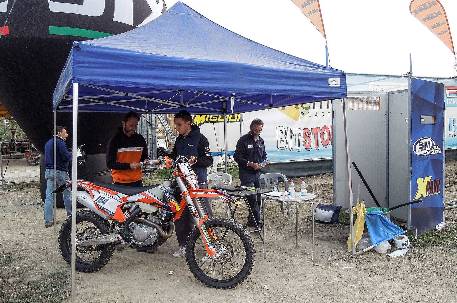 Dopo due giri di gara e cinque prove speciali si arriva dunque al momento più atteso da molti, ma non dal sottoscritto: la manche di cross. In effetti nella mia vita ho visto tante gare di mx, ma questa è stata veramente la primissima volta per me. L’attesa è lunga, visto che le categorie sono tante e la mia, la E3, è praticamente l’ultima prima della superfinale. Questo di certo non mi aiuta, perché nelle ore di pausa ho tempo per passare dalla stanchezza, alla noia, alla fame e, più si avvicina il fatidico momento, alla dannata ansia di buttarmi là in mezzo… Quando veniamo chiamati al parco chiuso per prendere le moto ed avvicinarci al piazzale di partenza credo di aver avuto il picco di battiti cardiaci della settimana. Poi alla fine mi sono detto: mai fatto motocross, a parte qualche uscita in passato giusto per capire che forse era meglio se iniziavo quand’ero più giovane, sui salti lasciamo perdere, anche perché ovviamente non sapevo dell’esistenza di questa pista prima di esserci arrivato il giorno prima della gara, quindi che problema c’è, ho una EXC 500 sotto il sedere, gas e via! Incredibilmente appena mi sono posizionato dietro al cancelletto la tensione è come svanita.