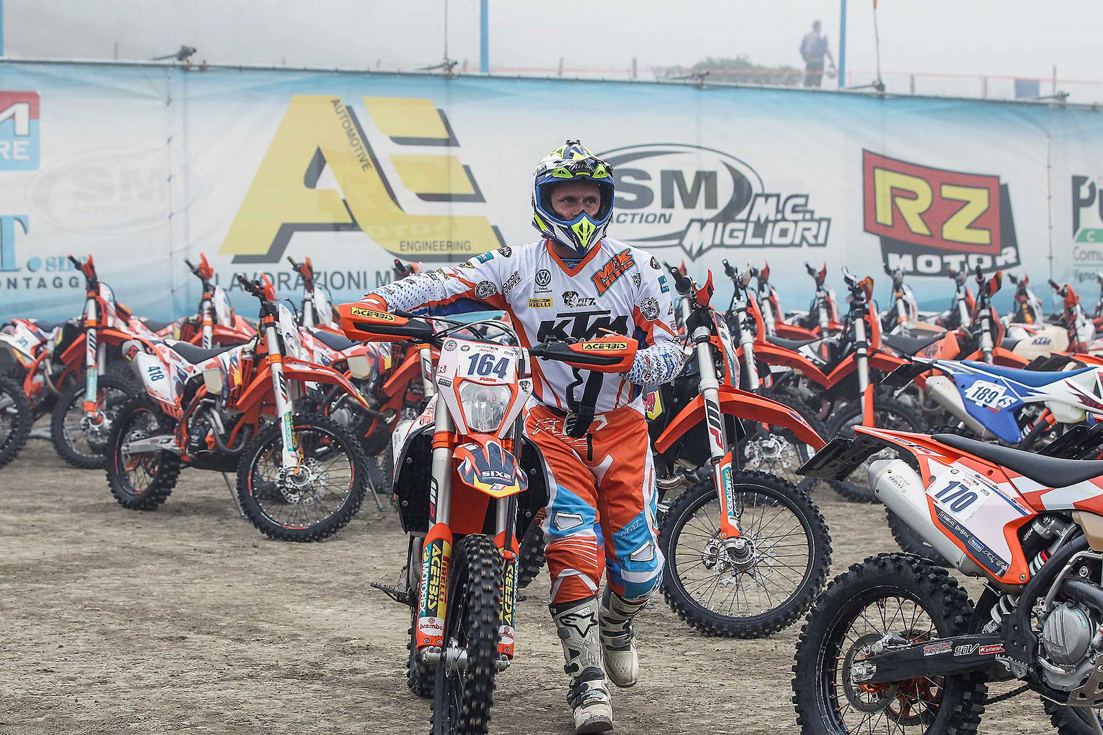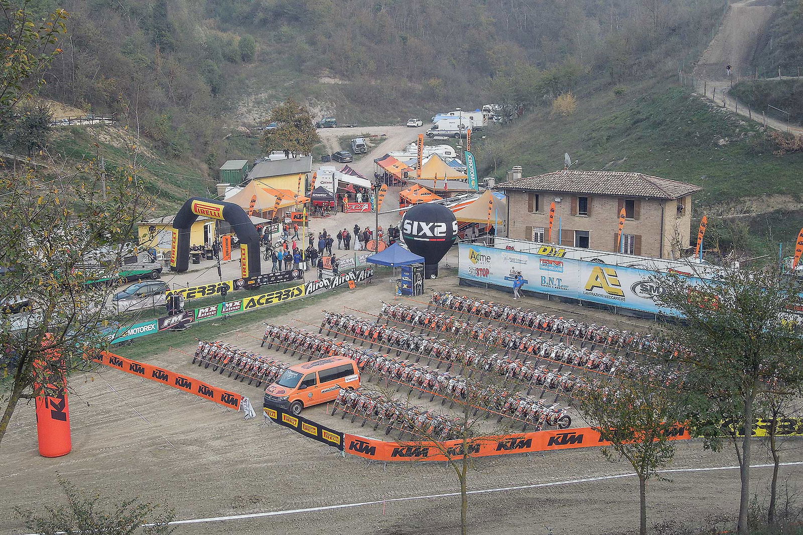 Questa volta sono state le colline Modenesi a fare da sfondo all’epilogo della stagione per quanto riguarda il campionato monomarca più affollato d’Italia. 182 piloti al via, con i primi di ogni classe a giocarsi il titolo all’ultima gara. Il fulcro dell’evento è stata la bellissima pista di Savignano sul Panaro, un crossodromo vecchio stile che si snoda sui saliscendi delle bellissime colline a pochi km da Modena, nel pieno della “terra de mutòr”. Come ogni gran finale, la gara di enduro si è conclusa con la prova di cross, con tutti i piloti di ogni categoria schierati dietro al cancelletto in perfetto stile Six Days Enduro. La gara è iniziata in una nebbia fitta che in alcuni tratti rendeva veramente difficoltosa la visibilità. Il percorso lungo 50 km è bellissimo. Prima prova speciale cronometrata nel fettucciato ricavato sui saliscendi della pista di motocross, con partenza “a freddo” per piloti e moto. Qualche passaggio insidioso, come una curva cieca dietro una discesa dove molti piloti al primo giro sono andati via dritti portandosi dietro la fettuccia ed un susseguirsi di salite e discese piuttosto impegnative dove era facile uscire di traiettoria.