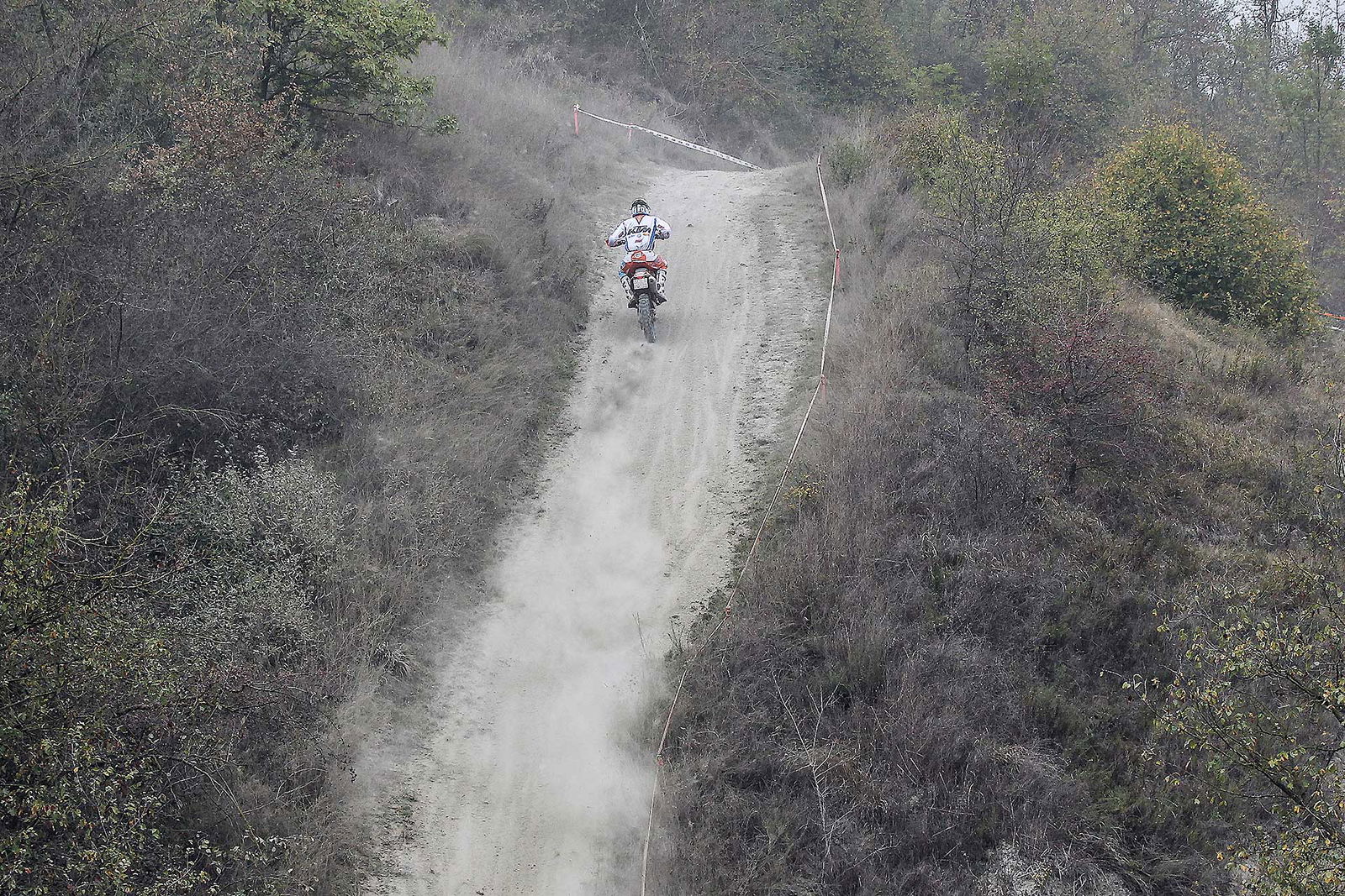 I tratti di trasferimento erano un alternarsi di passaggi nel bosco, con un terreno bellissimo e con tanto grip, ed una pietraia sul letto di un torrente dove era necessario avere delle braccia bene allenate, e non era proprio il mio caso, o delle buone sospensioni (grazie KTM!). Dopo un circa una trentina di km dalla partenza si arrivava all’enduro test. Ragazzi, bellissima! Cinque minuti di vera goduria, in un percorso veloce, tutto a vista con allunghi notevoli e qualche passaggio più tecnico in salita e discesa. Talmente bella che sarebbe stata da ripetere dieci volte. Certo la nebbia non aiutava, infatti in alcuni momenti la visibilità era veramente scarsa ed era necessario staccare una mano dal manubrio per pulire gli occhiali. Ma, meglio la nebbia dell’acqua, se avesse piovuto allora sì che sarebbero stati dolori…