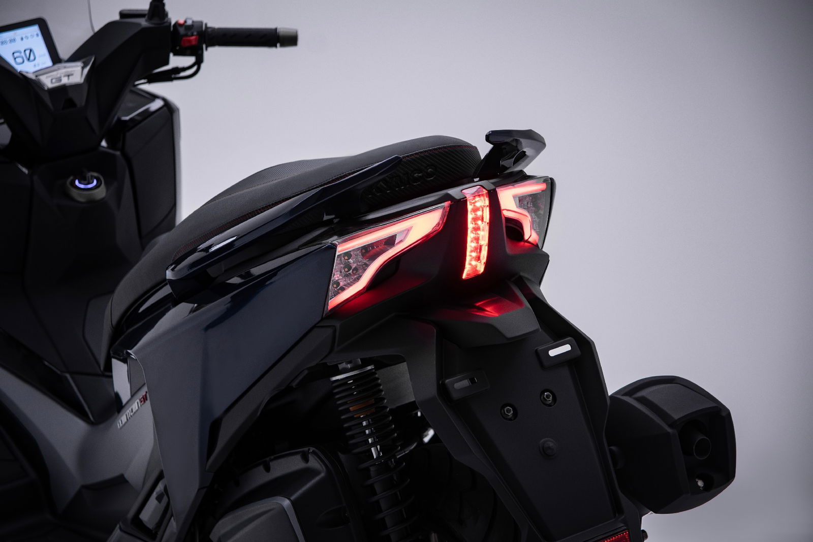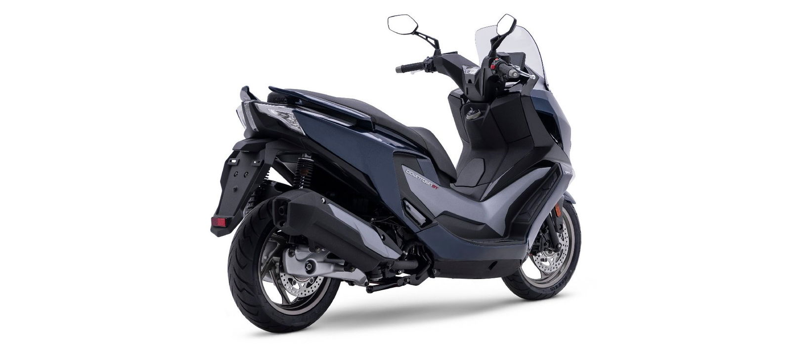 Le sovrastrutture del nuovo Kymco Downtown 350GT sono caratterizzate da linee tese, che rendono il design filante e sportivo, nonostante l’abitabilità per pilota e passeggero siano un riferimento tra gli scooter GT di media cilindrata. La sezione frontale propone uno scudo di dimensioni generose, che garantisce una protezione dall’aria ottimale anche nei mesi freddi. La parte anteriore dello scudo ospita i gruppi ottici con tecnologia full LED a sviluppo verticale e gli indicatori di direzione montati a filo con la superficie della carrozzeria. Il parabrezza dal disegno arrotondato nella parte superiore riduce al minimo le turbolenze nella zona del casco. La vista laterale del Downtown 350GT (leggi il nostro articolo sui migliori scooter di media cilindrata) conferma la sua vocazione da scooter cruiser. La pedana è stata disegnata per offrire grande libertà di movimento sia longitudinalmente (con più punti di appoggio per i piedi), sia orizzontalmente, grazie alla superficie disponibile particolarmente ampia. La sella su due livelli, impreziosita dal rivestimento antiscivolo, è stata progettata per garantire il massimo comfort, con la zona dedicata al passeggero molto estesa e completata da maniglie ergonomiche perfettamente integrate nel codone. Il design si arricchisce grazie al terminale di scarico dotato di cover in tinta con la carrozzeria. D’impatto il gruppo ottico posteriore, anch’esso full LED e con indicatori di direzione integrati.