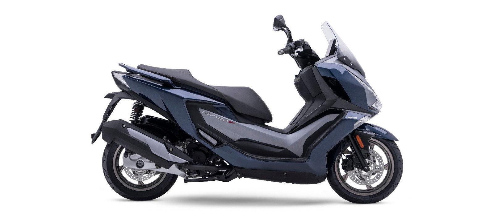 La ciclistica del Kymco Downtown 350GT ha tutte le caratteristiche a cui uno scooter pensato per viaggiare non può rinunciare. Forcella e ammortizzatori assicurano rispettivamente un’escursione di 110 mm e 108 mm, ideale per assorbire qualsiasi asperità con un comfort da prima classe. Le ruote in lega leggera a cinque razze montano pneumatici premium nelle misure 120/80–14” davanti e 150/70-13” dietro. La ciclistica del nuovo Downtown 350GT è completata da un impianto frenante di qualità: disco anteriore da 260 mm di diametro con pinza a tre pistoncini e disco posteriore da 240 mm di diametro con pinza a doppio pistoncino. L’ABS è a doppio canale.