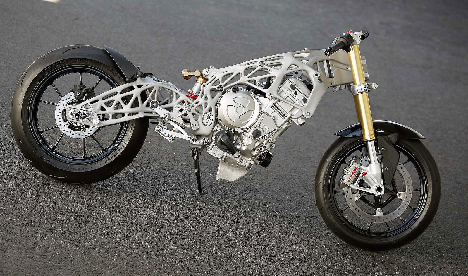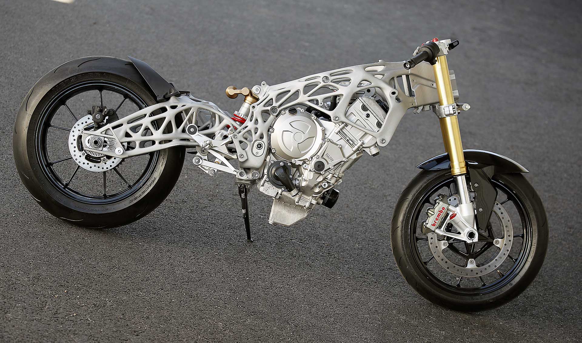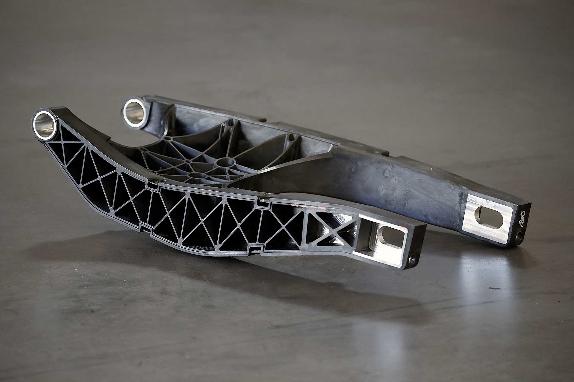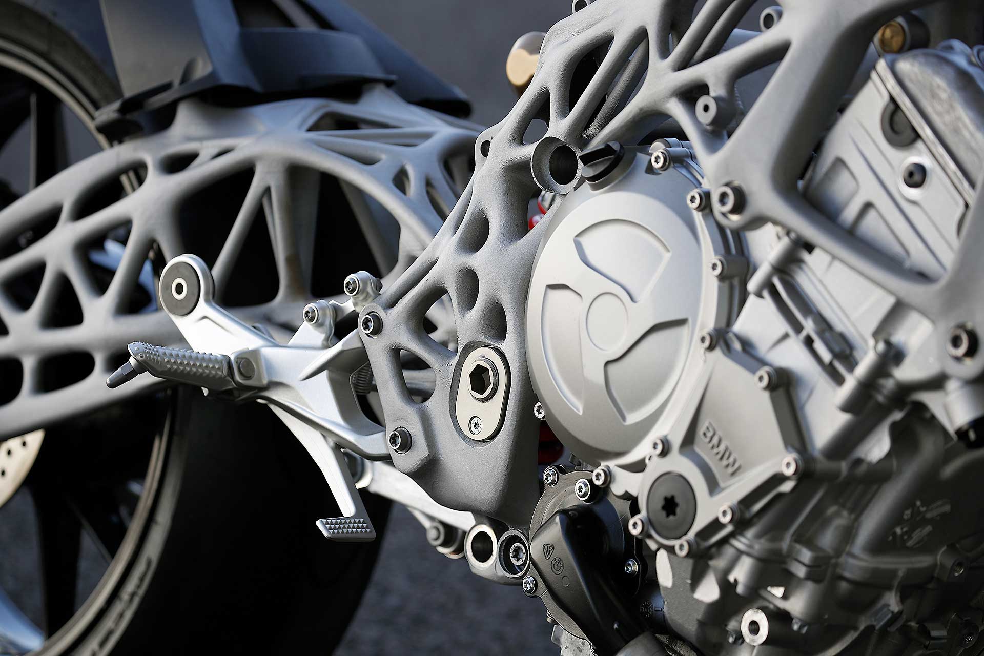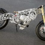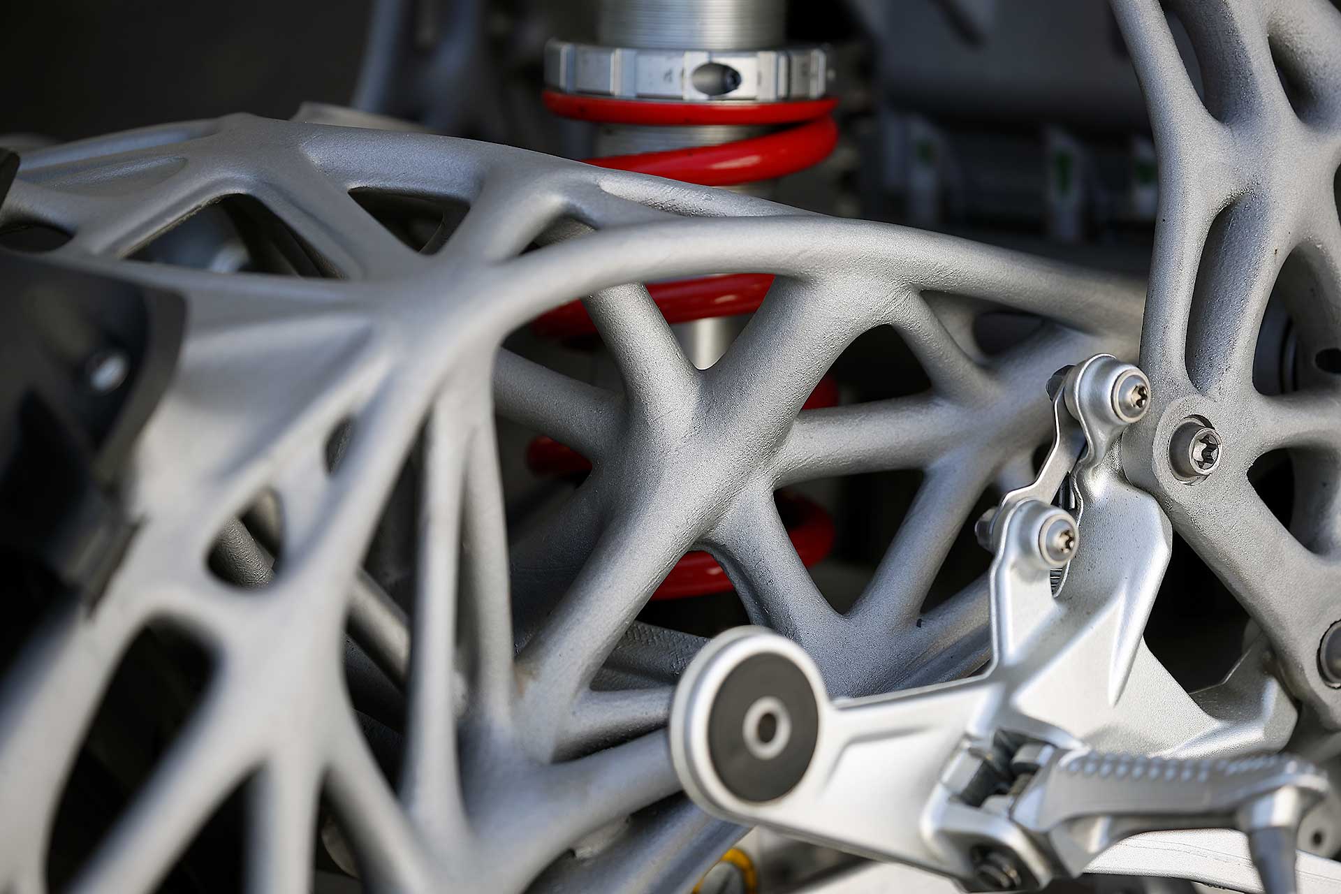 Quindi è la volta dei vari reparti, a cominciare da quello specializzato nella ricerca sull’impiego della fibra di carbonio. Per mettere a punto tecniche specifiche per i telai o per le ruote, con i cerchi che sono sottoposti a vere e proprie torture: gradini di 10 cm di altezza affrontati a 30 km/h, oppure di 5 cm affrontati a 120 all’ora, o ancora i test di laboratorio che riproducono gli effetti di un wheeling poco aggraziato, con una caduta secca sull’anteriore. Oppure per trovare soluzioni economicamente più vantaggiose per realizzare componenti strutturali, come un forcellone, unendo le qualità della fribra di carbonio con quelle della plastica, in proporzioni variabili in funzione delle prestazioni.Ecco il telaio realizzato con la stampante 3D