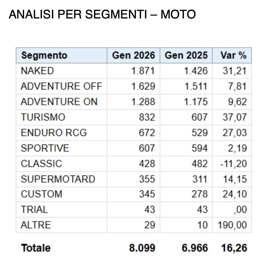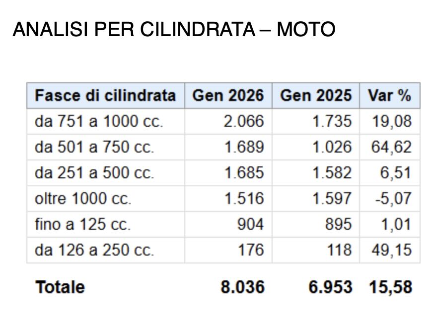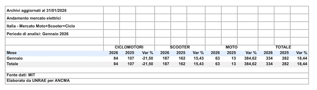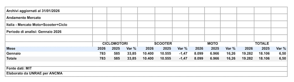 l mercato delle due ruote a motore inaugura il 2026 con un segnale positivo. Secondo i dati delle immatricolazioni di moto, scooter e ciclomotori diffusi oggi in esclusiva da Confindustria ANCMA (Associazione Nazionale Ciclo Motociclo Accessori), il mese di gennaio registra una crescita complessiva del 6,5% rispetto allo stesso periodo dell’anno precedente.