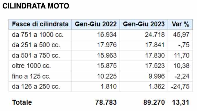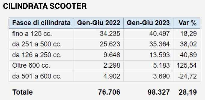 I primi sei mesi dell’anno evidenziano una crescita a doppia cifra del mercato due ruote: +16,88% e 201.922 pezzi venduti. Di tutto rilievo la performance degli scooter, che incassano un quarto dei volumi in più rispetto al primo semestre 2022 (+24,93%) e targano 102.470 mezzi. A doppia cifra anche l’incremento delle moto: +13,10% e 89.450 unità, mentre i ciclomotori, per effetto di quattro mensilità negative nel corso dell’anno, si fermano a -14,14% e 10.002 veicoli immessi sul mercato.