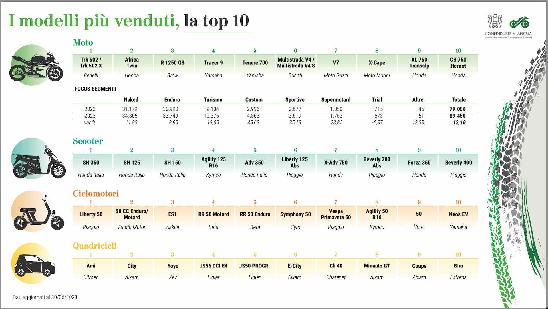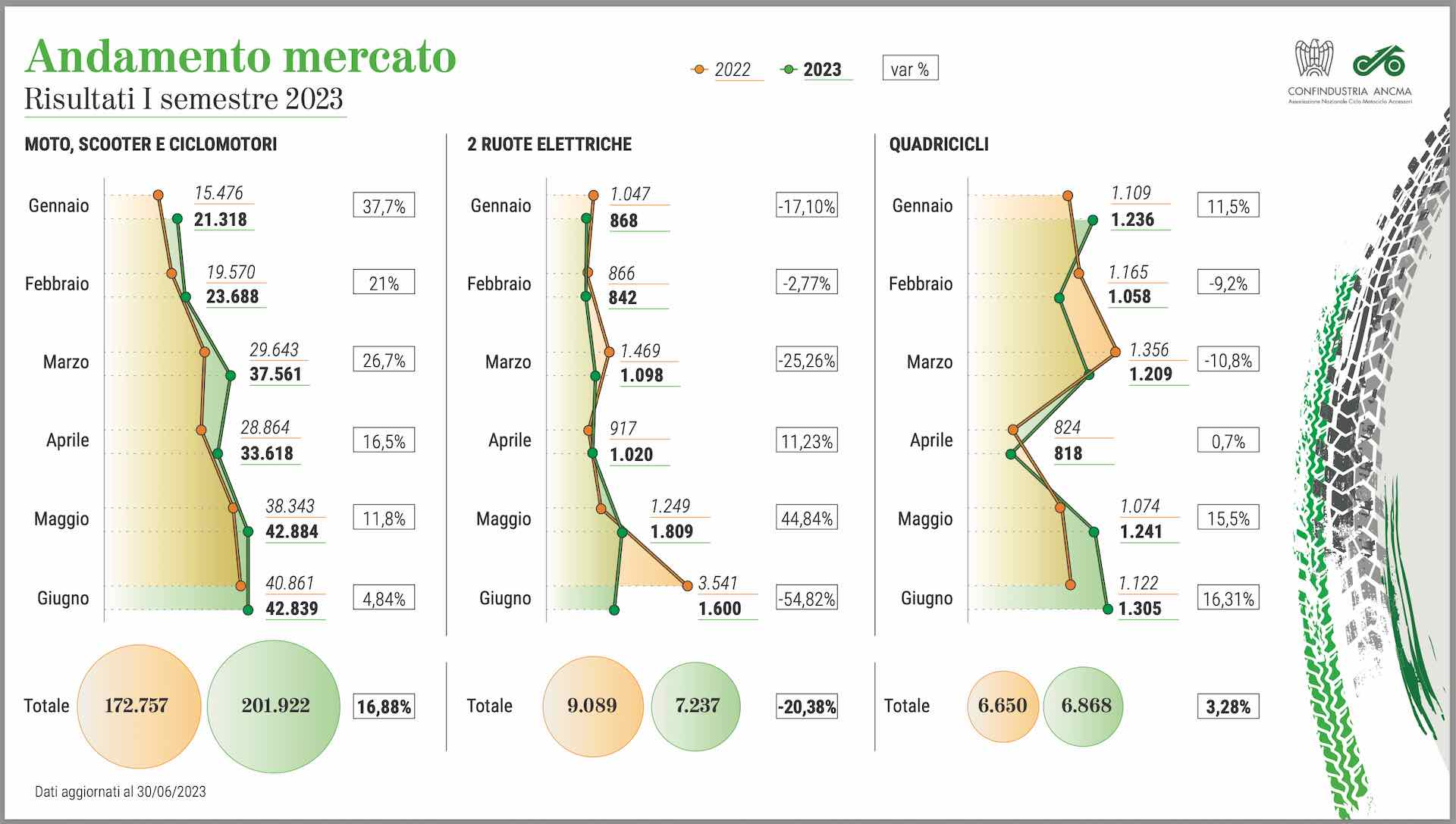 Splende il sole sull’estate delle due ruote a motore. I dati di mercato diffusi nel pomeriggio di oggi da Confindustria ANCMA (Associazione Nazionale Ciclo Motociclo Accessori) confermano l’interesse crescente degli italiani verso moto, scooter e ciclomotori e certificano un primo semestre 2023 che vola a +16,8% sull’anno scorso. Per il presidente dell’associazione dei produttori e distributori di due ruote Paolo Magri “la nuova domanda di mobilità che viene soprattutto dai centri urbani e il desiderio di libertà e passione che i motocicli sono in grado di soddisfare, sono sempre più i due elementi portanti di un mercato che continua a crescere malgrado le incertezze globali, le residuali difficoltà di approvvigionamento e l’impennata inflattiva”.
