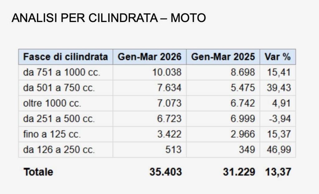 I dati, pur positivi, richiedono comunque una lettura attenta, considerando che nei primi mesi dello scorso anno le immatricolazioni erano state influenzate dal fine serie Euro 5. Tuttavia, i risultati attuali confermano una tendenza in ripresa e alimentano fiducia per l’imminente avvio della stagione motociclistica, tradizionalmente il momento di maggiore dinamismo per il mercato. Positivo anche l’andamento del mercato degli elettrici, sostenuto dalla spinta degli incentivi Ecobonus.