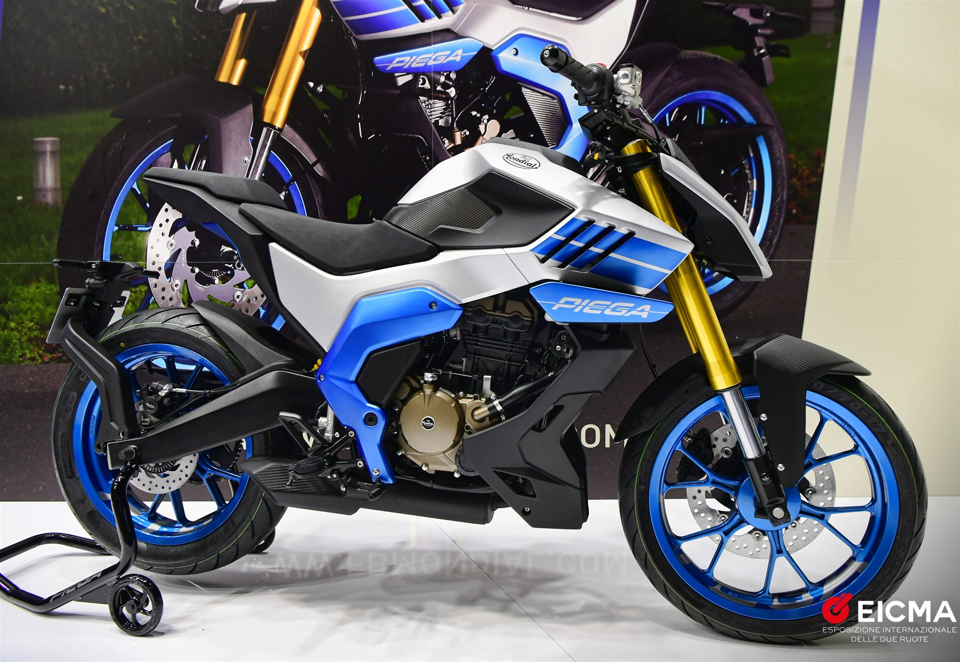 La Mondial Piega è infatti una 125 cc nuda e spigolosa, corta e sfrontata, con una forte personalità, pensata per fare breccia nei cuori dei più giovani. A disegnarla è stato uno che di moto di successo ne ha fatte parecchie, Rodolfo Frascoli. Il designer italiano ha puntato su elementi caratterizzanti piuttosto forti. Tra loro ci sono le branchie sui convogliatori, le alette in stile MotoGP, il doppio faro anteriore sovrapposto e la coda filante e libera dalla fanaleria, spostata sopra la ruota. Completa la dotazione un moderno display a colori TFT.