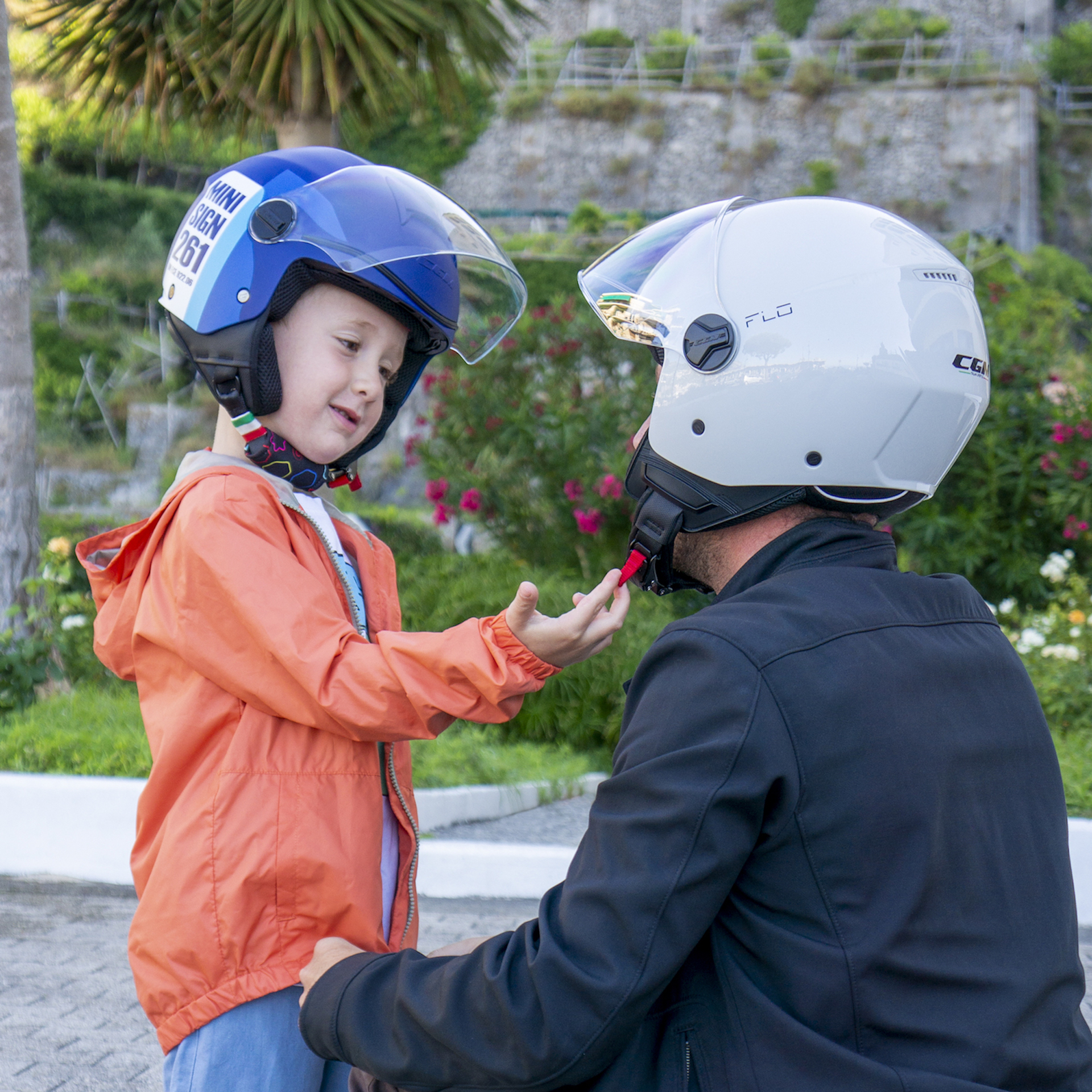 Grafiche divertenti si accompagnano a caratteristiche di un casco per adulti, con regolare omologazione 22.06 per il demi-jet che CGM dedica ai più piccoli e ai ragazzi. Questa caratteristica è da ricondurre a una calotta offerta in cinque taglie. Il 261 è un casco leggero dalla calzata avvolgente, con interni colorati, estraibili e lavabili, che si combinano a un collarino paranuca con guanciali, removibile con zip. Dotato di aerazione con Air Stream System e di visiera lunga, il casco è dotato di fibbia micrometrica, anello antifurto e elastico fermacinturino. I piccoli clienti si potranno divertire a personalizzare la calotta con divertenti sticker contenuti nella confezione.