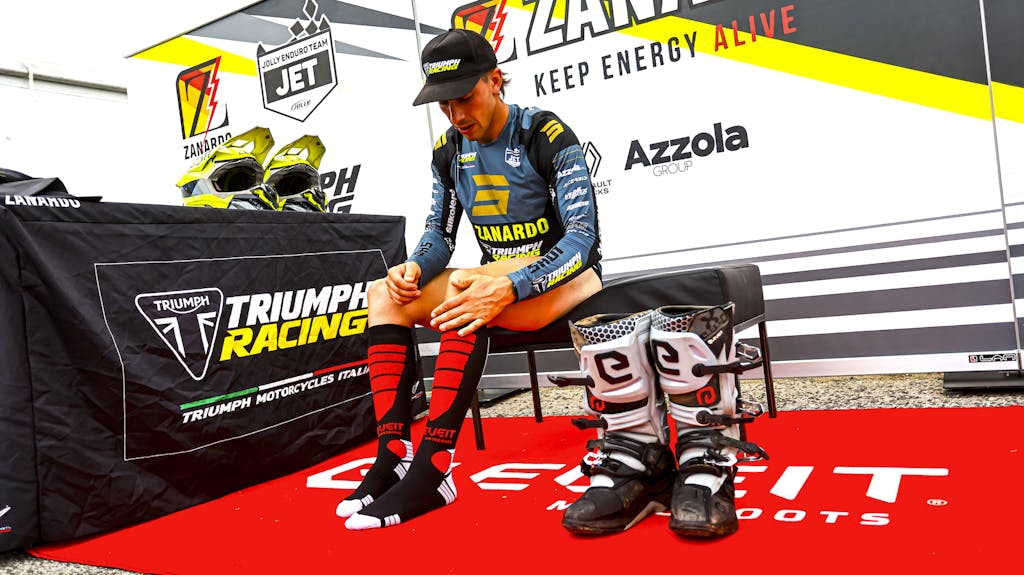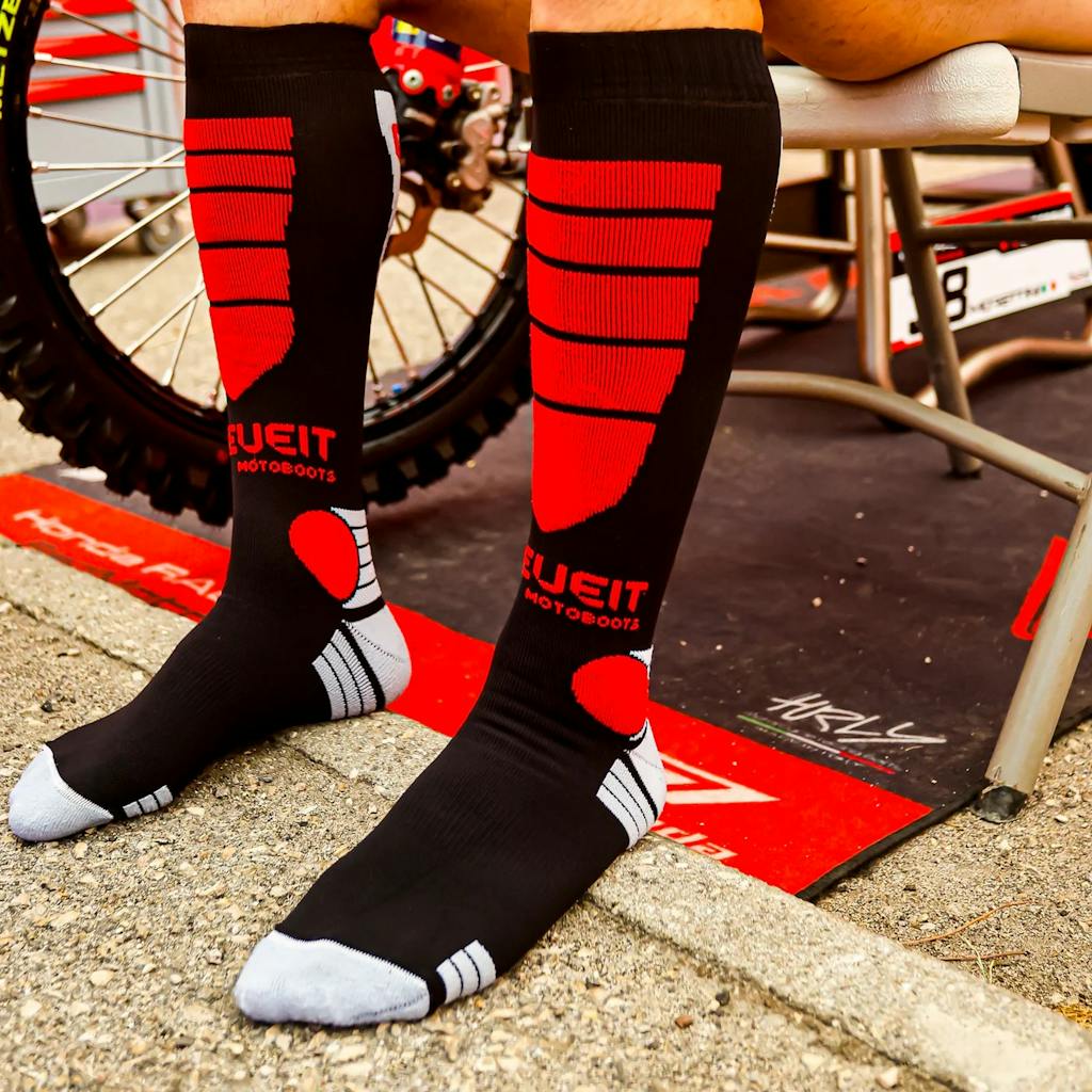 Testato e approvato da piloti del Mondiale di Enduro come Steve Holcombe e Morgan Lesiardo, il calzino marchiato Elevet è senza cuciture, con rinforzo antiabrasione su stinco e malleolo, inserti in spugna per il supporto del polpaccio e fascia elastica antitorsione sul collo del piede. Il calzino X Comp è disponibile in 4 taglie unisex, dalla misura 37 alla 48.