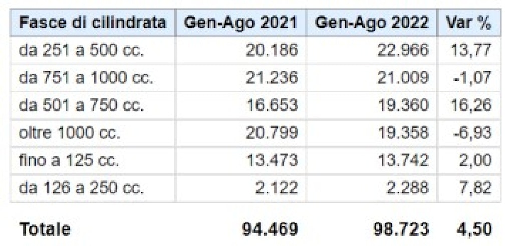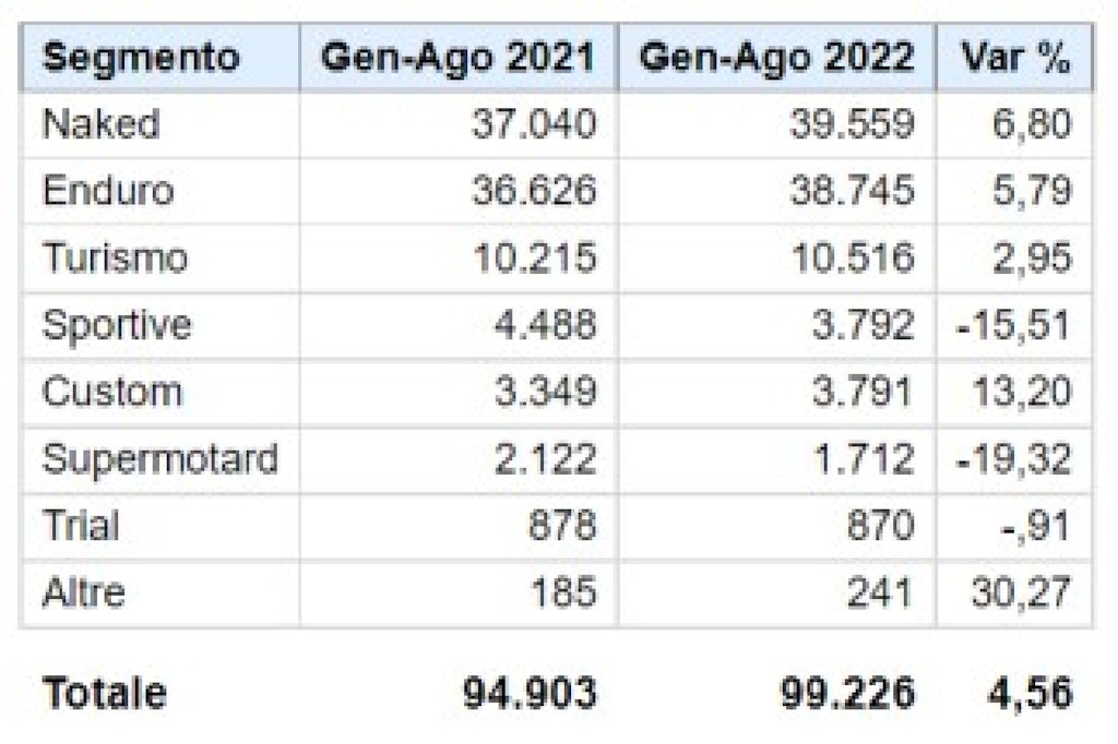 Le immatricolazioni di ciclomotori, scooter e moto segnano ad agosto una crescita del 3,2% rispetto allo stesso mese del 2021. Positivo il commento del presidente di ANCMA, Paolo Magri: “malgrado la situazione congiunturale e i noti problemi globali di approvvigionamento, che riguardano tutto il settore automotive, la domanda di due ruote in Italia si mantiene viva, confermando la capacità distintiva della nostro settore di soddisfare il desiderio di nuova mobilità e passione nel mercato del trasporto privato”.