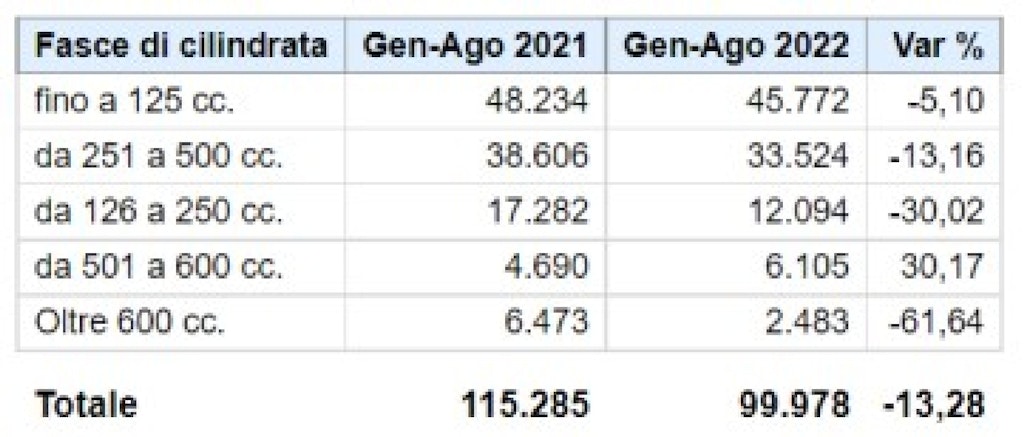 Dopo sei mesi di segno meno, il mercato delle due ruote ad agosto torna in territorio positivo. Il mese si chiude con 16.126 veicoli venduti e una crescita di 3,2 punti percentuali sullo stesso periodo dello scorso anno. A fare la parte del leone le moto, con 6.864 veicoli immatricolati pari a un incremento del 13,4 %. Non riescono invece a risalire la china gli scooter, che targano 7.948 mezzi e perdono il 5,17% sul 2021. Infine, prosegue la crescita dei ciclomotori, quest’anno sempre in positivo con la sola eccezione del mese di maggio: ad agosto il segmento registra 1.314 veicoli e un incremento del 10,8%.