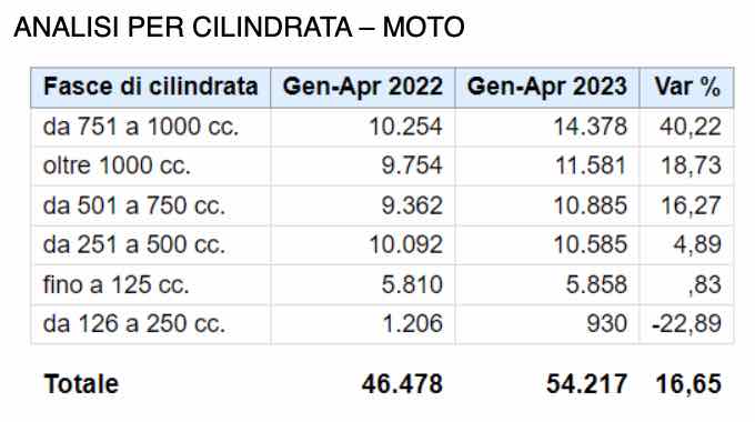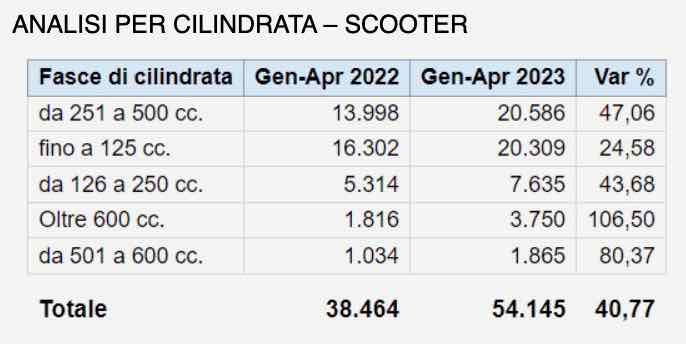 Nei primi quattro mesi dell’anno il mercato guadagna il 24,17% rispetto allo stesso periodo del 2022. In vetta gli scooter, con 56.485 mezzi targati e una crescita del 37,98%. Al secondo posto, per numero di veicoli immatricolati, le moto, con 54.311 unità vendute e un incremento del 16,44%. Ancora in territorio negativo, nonostante il buon risultato del mese di aprile, i ciclomotori che perdono il 10,05% e mettono in strada 5.373 pezzi.