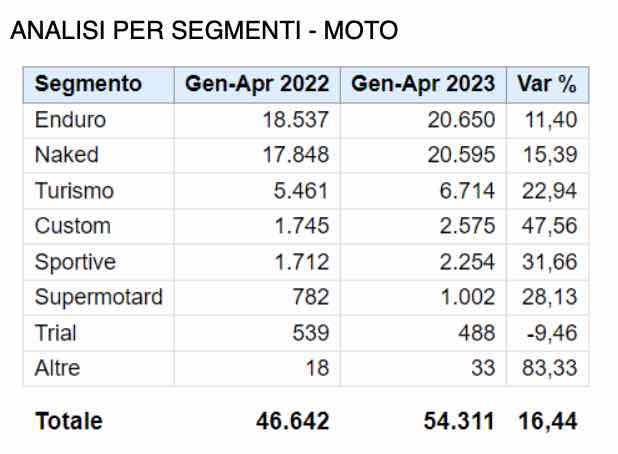 Quarto mese consecutivo con il segno più per il mercato italiano delle due ruote a motore. Anche aprile chiude, infatti, con una crescita complessiva del 16,4% sullo stesso mese dell’anno scorso. I dati sulle immatricolazioni mensili di moto, scooter e ciclomotori diffusi oggi da Confindustria ANCMA (Associazione Nazionale Ciclo Motociclo Accessori) confermano quindi l’incessante interesse per le due ruote in Italia dove, secondo gli ultimi dati del Ministero dei Trasporti, anche il rilascio di patenti A, necessarie per guidare un motociclo, è cresciuto di oltre il 24% dal 2019 alla fine dello scorso anno.