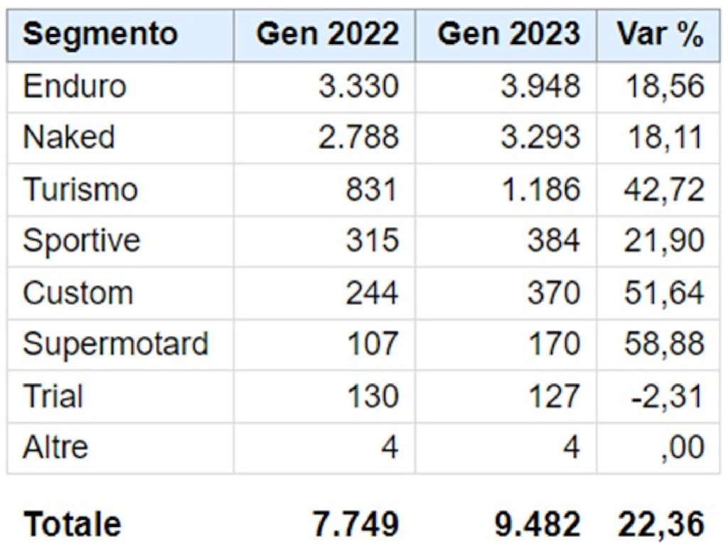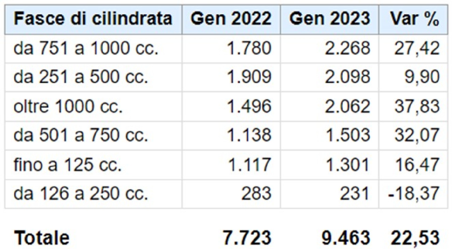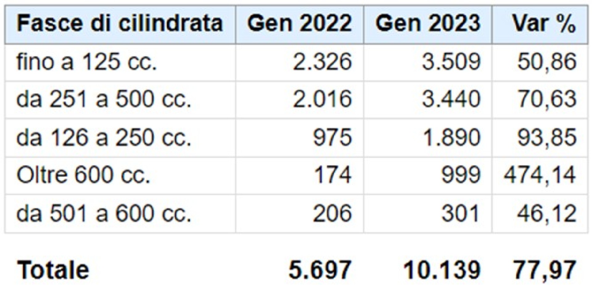 Performance a doppia cifra quindi per il mercato delle due ruote nel primo mese dell’anno, con una crescita del 37,72% pari a 21.314 unità, anche per effetto degli incentivi statali, peraltro già esauriti. Il dato più significativo è dato dagli scooter che crescono del 77,4% e immatricolano 10.720 veicoli. Ottimo anche l’andamento delle moto, che spuntano un incremento del 22,36% e targano 9.482 mezzi. Unico dato in controtendenza è quello dei ciclomotori, che fanno segnare un calo del 33,97% e registrano 1.112 unità: si tratta tuttavia di un rimbalzo tecnico dovuto a una significativa commessa registrata nel corso del 2022.