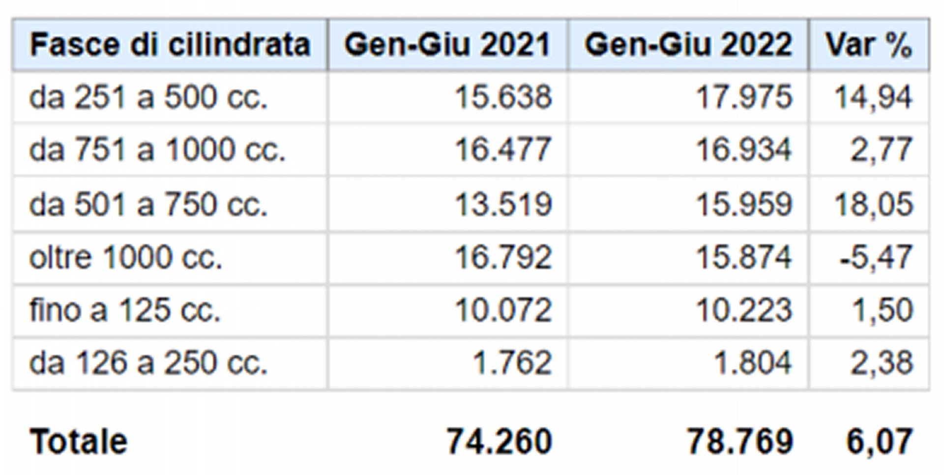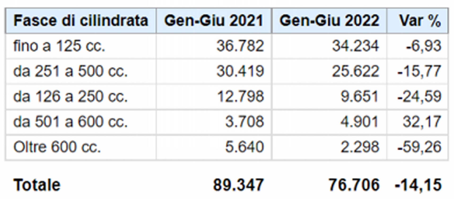 In linea con il dato mensile anche il cumulato annuo, fermo a – 2% rispetto al primo semestre 2021. Segno meno solo per gli scooter, che perdono il 10,9%, pari a 82.021 veicoli immatricolati. Buona invece la performance delle moto, che targano 79.162 mezzi e crescono del 6,1%. Rimane ottimo l’andamento dei ciclomotori, con una crescita del 19,8% e 11.643 veicoli venduti.