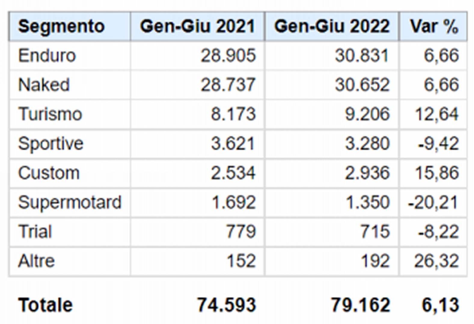 Nel sesto mese dell’anno il mercato delle due ruote ristagna: -1,8% il dato complessivo di moto, scooter e ciclomotori, con 40.871 veicoli venduti. Gli scooter, ormai in territorio negativo dal mese di febbraio, perdono il 6,7% e immatricolano 21.144 mezzi; le moto segnano una flessione del 3% e mettono in strada 16.124 veicoli; in controtendenza i ciclomotori, sostenuti anche dal mercato elettrico, che fanno registrare un bel +53,1%, pari a 3.603 veicoli.