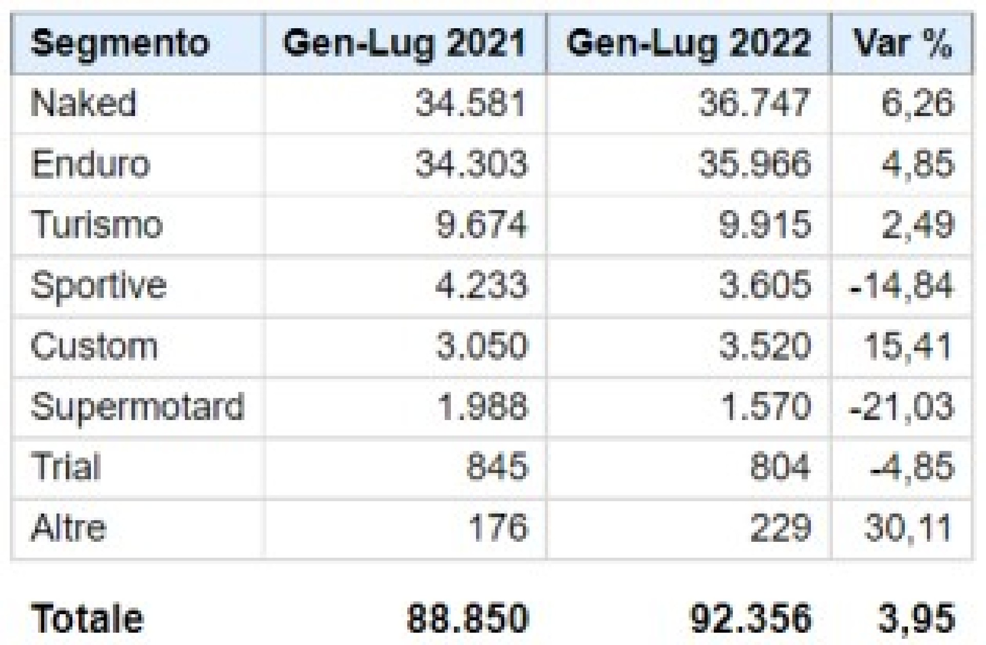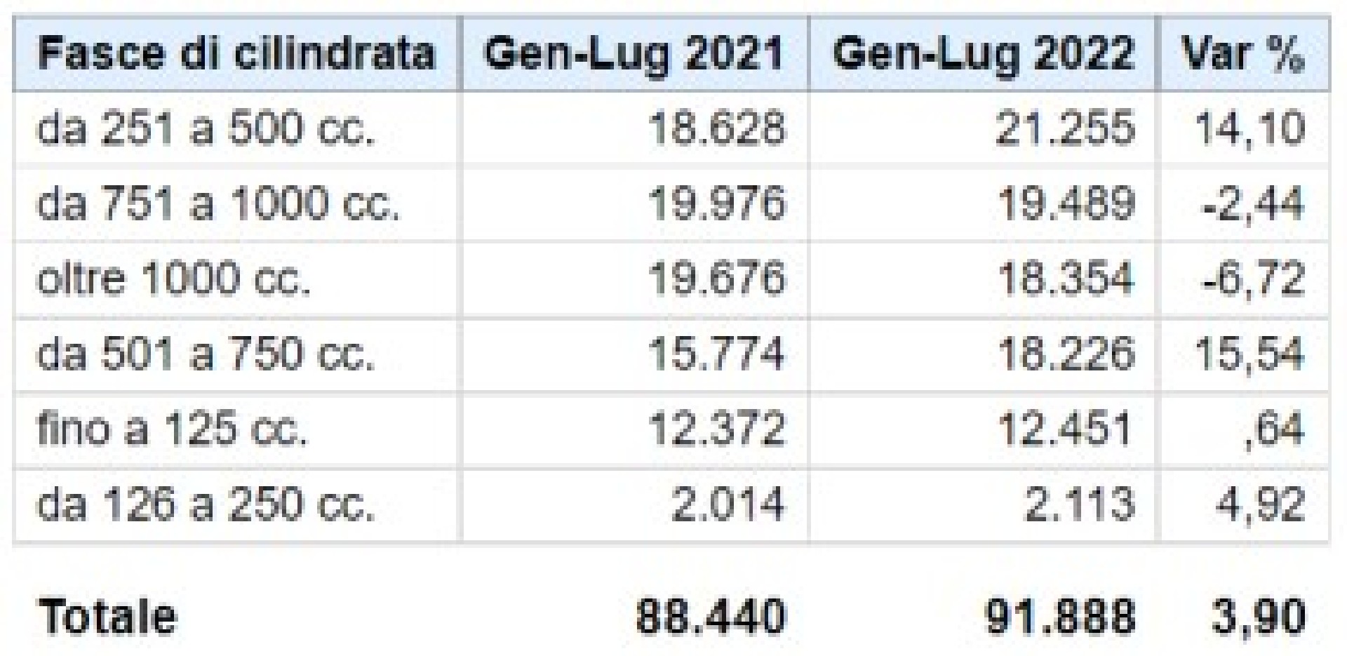 Tiene ancora il cumulato annuo, che, con 205.732 unità, fa segnare un calo del 2,8%. Diverso l’andamento di scooter e moto. Mentre i primi, infatti, incassano una perdita del 10,6% con 99.068 mezzi immatricolati, le moto, grazie ai 92.356 veicoli targati, registrano un incremento del 3,9% rispetto al 2021. Ottimo l’andamento dei ciclomotori, che crescono del 18,3% e immettono sul mercato 14.308 unità.