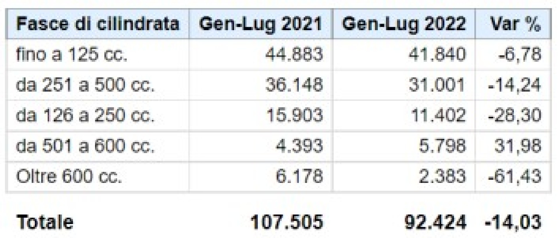 Entrando nel vivo dei dati mensili, a luglio sono stati messi in strada complessivamente 32.897 nuovi veicoli, il 7% in meno sul 2021, che poteva tuttavia contare su un giorno lavorativo in più. A trascinare verso in basso il mercato è il segmento degli scooter, con 17.046 veicoli immatricolati e una flessione del 9,2%. Più contenuta la perdita delle moto (-7,5%), che targano 13.185 mezzi. In controtendenza i ciclomotori che, grazie alla spinta degli elettrici, crescono del 12,5% e fanno registrare 2.666 unità.