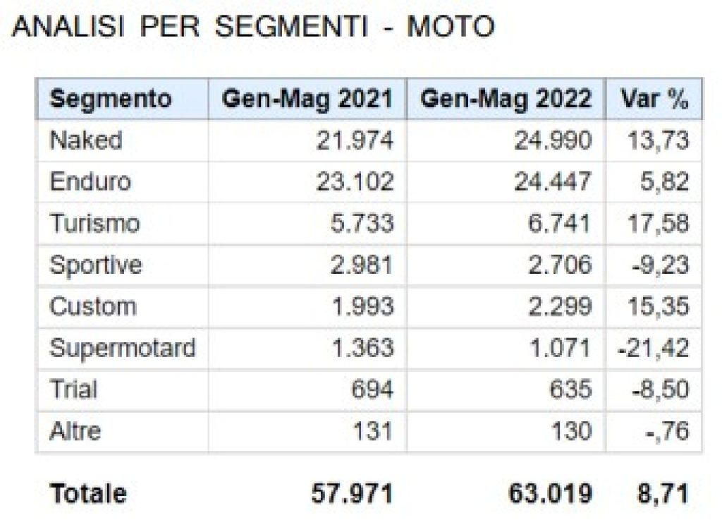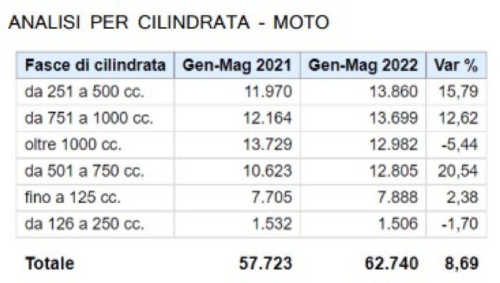 Il quinto mese dell’anno chiude in pari rispetto allo stesso periodo del 2021: il mercato (immatricolato + ciclomotori) mette in strada 38.338 veicoli, corrispondenti a una flessione dello 0,7%. Nel dettaglio, i ciclomotori fanno segnare il risultato migliore, con una crescita del 6,3% e 2.067 mezzi registrati. Seguono le moto, con 16.336 veicoli targati e un incremento dell’1,3% su maggio 2021.