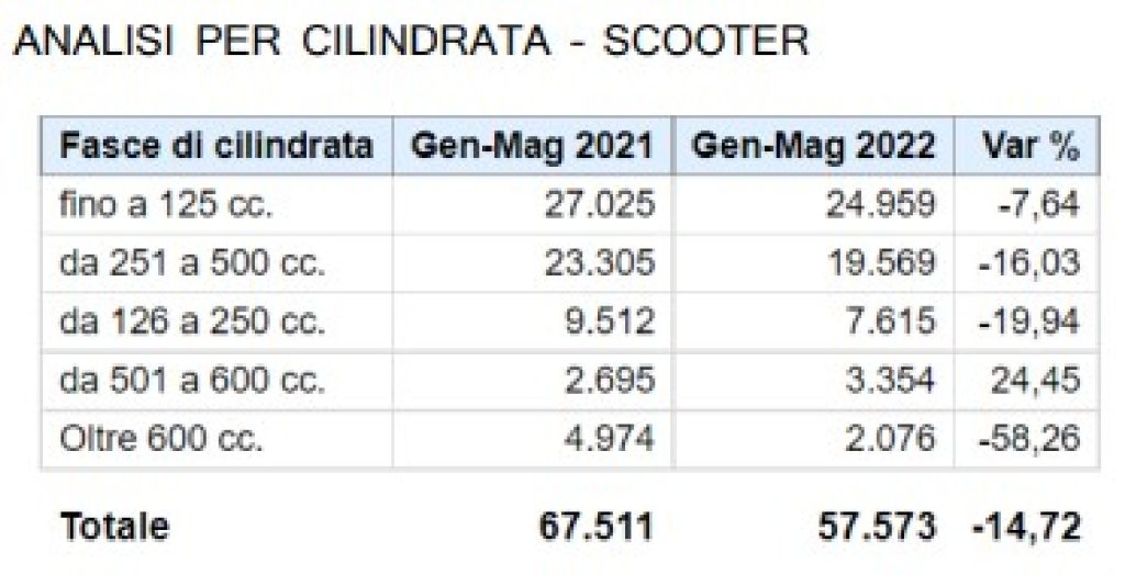 Chiudono gli scooter, che per il quarto mese consecutivo registrano un risultato negativo, con una flessione del 3%, pari a 19.935 veicoli venduti.