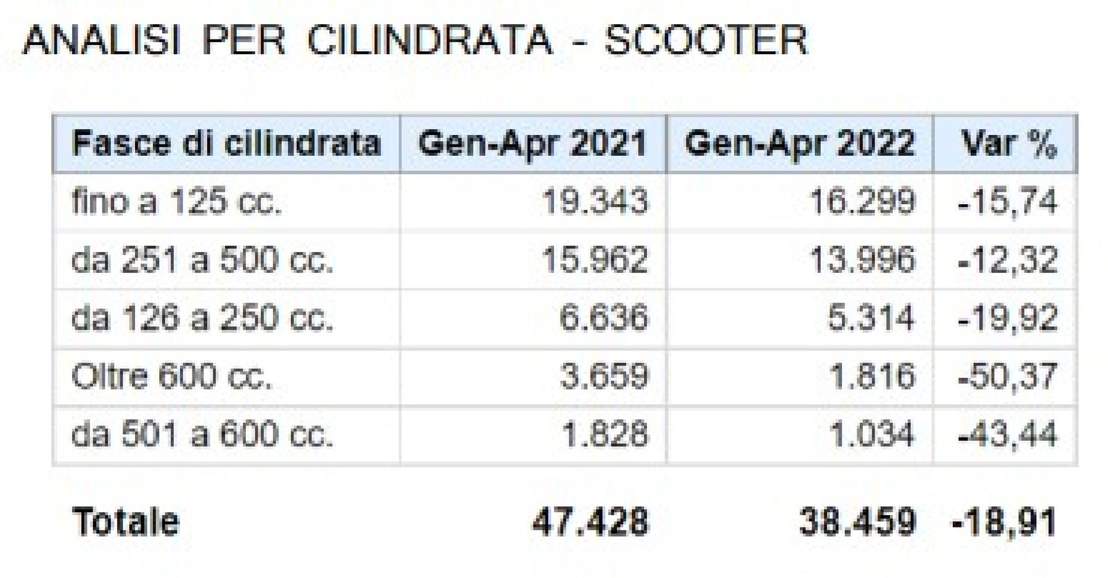Il terzo saldo negativo dall’inizio dell’anno mette il segno meno davanti al mercato cumulato, per la prima volta nel 2022: 93.575 veicoli venduti e un calo del 2,6% rispetto al primo quadrimestre 2021. A tirare verso il basso sono gli scooter, che targano 40.933 mezzi, pari a una flessione del 16,2%. Ancora positivo, invece, il bilancio delle moto, con 46.669 mezzi immatricolati e una crescita dell’11,49% sul 2021; infine i ciclomotori, che, grazie al vantaggio accumulato nei mesi precedenti, chiudono il quadrimestre ancora in positivo, con una crescita del 10,18% e 5.973 veicoli venduti.