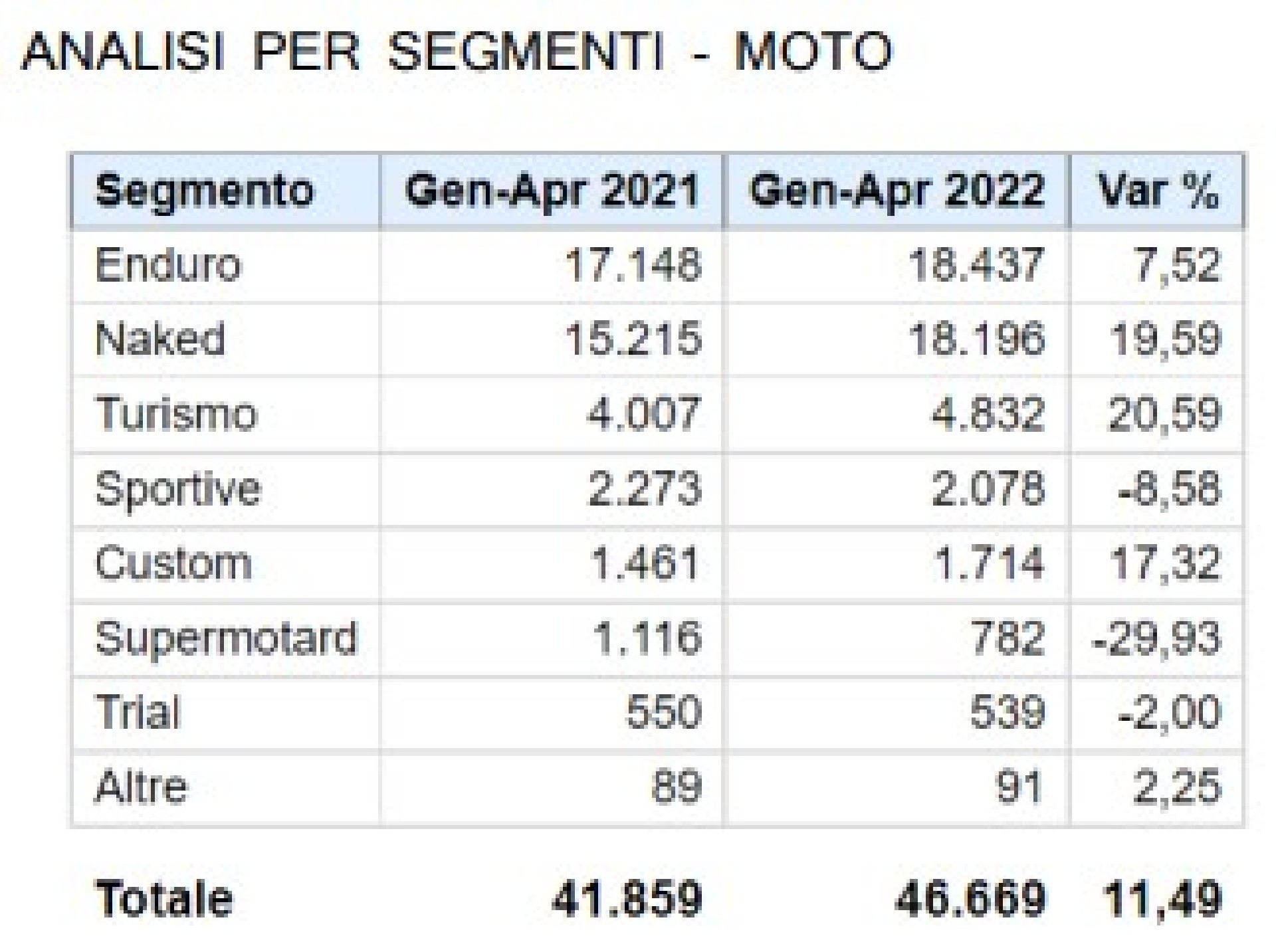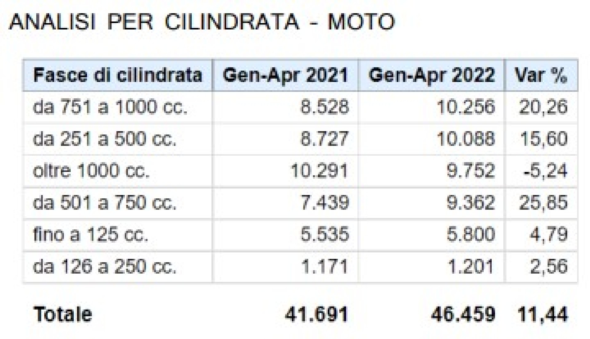Entrando nel vivo dei numeri, aprile immette sul mercato 28.853 veicoli tra motocicli, scooter e ciclomotori, pari a un calo dell’8,9%. In particolare, gli scooter perdono l’11,11%, pari a 13.552 veicoli immatricolati. Le moto, che fino ad oggi avevano fatto segnare incrementi a doppia cifra, flettono del 6,55% rispetto ad aprile 2021, con soli 13.878 veicoli targati. Dopo il buon risultato di marzo, anche i ciclomotori segnano il passo, con 1.423 veicoli registrati e un calo del 9,88%. Occorre tuttavia segnalare che aprile 2022 ha avuto due giorni lavorativi in meno rispetto allo stesso mese del 2021.