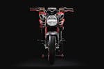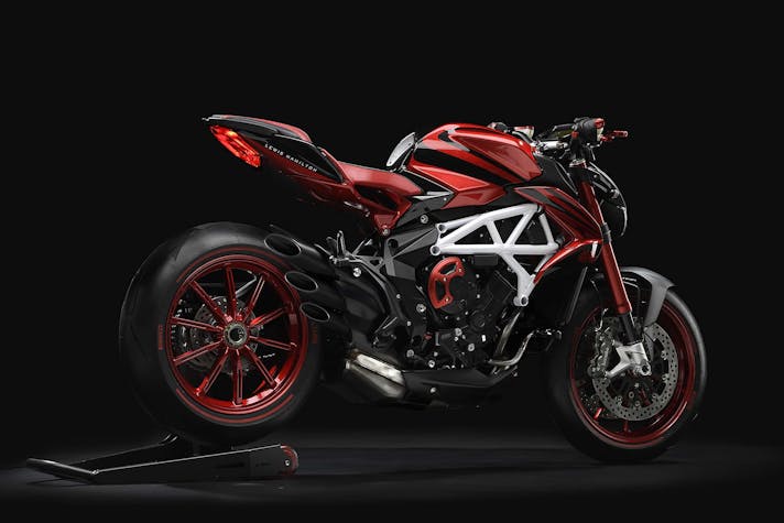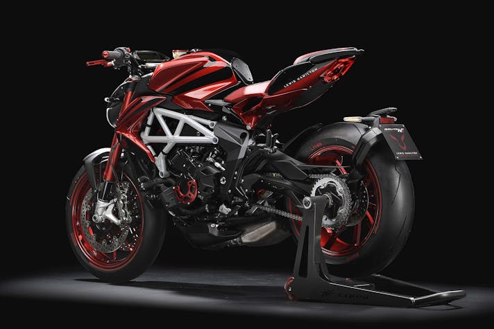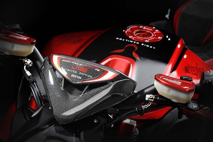 Base di partenza del progetto è l’ultima edizione della Brutale 800 RR, che abbiamo provato poco tempo fa. Lewis Hamilton e il CRC (Centro Ricerche Castiglioni, il polo di San Marino dove sono concepite e progettate tutte le nuove MV) hanno lavorato a braccetto per donare alla naked varesina quel tocco di esclusività che piace ai collezionisti. Le scelte cromatiche s’ispirano a quelle della F4 LH44, con una ricercata combinazione di nero, rosso e bianco. Non mancano, ovviamente, i loghi con il numero di gara del pilota britannico, il celebre 44. Numerose le parti speciali realizzate in fibra di carbonio. Sono realizzati con la pregiata trama parafanghi e condotti dell’airbox. I terminali di scarico hanno una finitura superficiale basata su una speciale vernice a base ceramica, resistente alle altissime temperature. Anche la sella è unica per aspetto, grazie all’imbottitura specifica e al rivestimento con impunture applicate a mano.