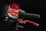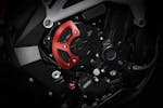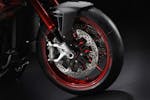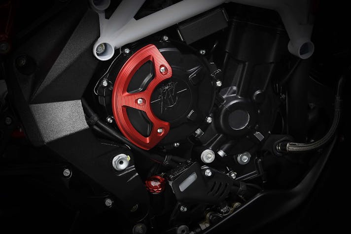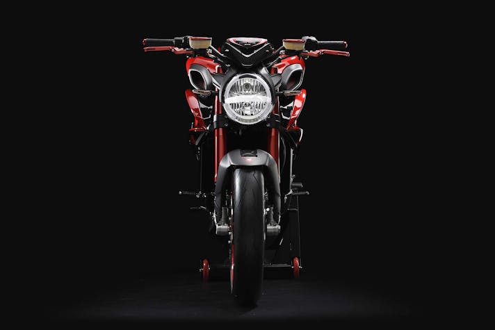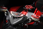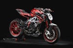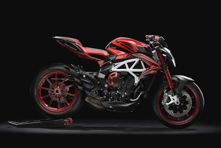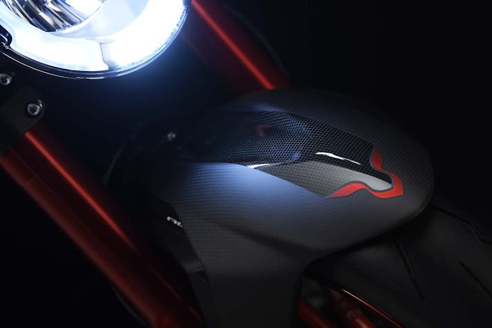 Molte le componenti in lega leggera con lavorazione dal pieno, ad esempio le leve freno e i coperchi dei vari serbatoi. I cerchi vantano un disegno specifico per questo modello e crescono nella sezione che arriva a 6”. Il legame strettissimo che MV Agusta ha con Pirelli rende scontata la presenza delle super performanti Diablo Supercorsa SP, in questo caso disponibili a richiesta con tanto di banda laterale rossa e sigla LH44. Sulla cover del cruscotto, realizzata in fibra di carbonio, è applicato il numero progressivo di produzione.