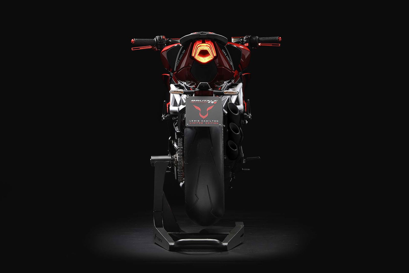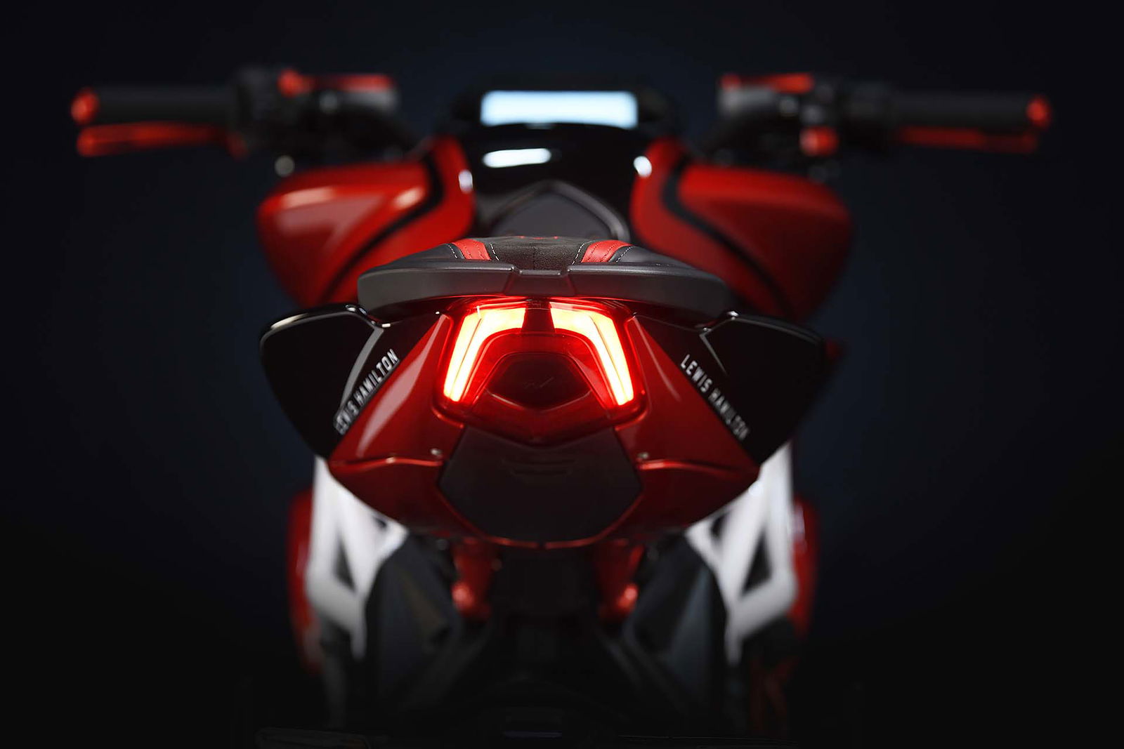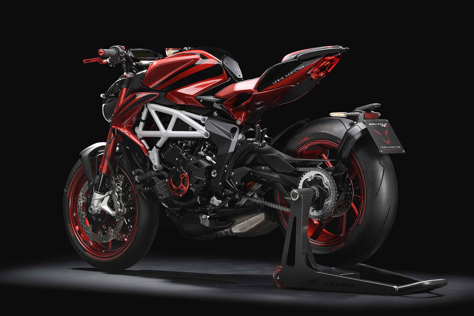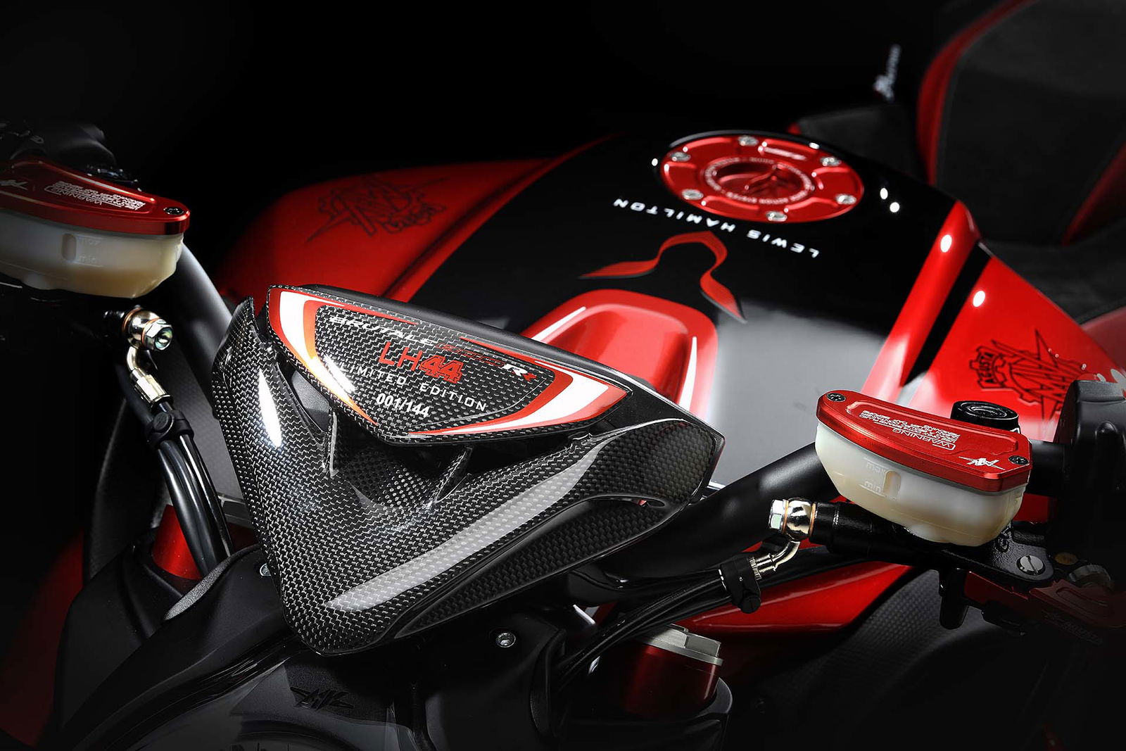 Base di partenza del progetto è l’ultima edizione della Brutale 800 RR, che abbiamo provato poco tempo fa. Lewis Hamilton e il CRC (Centro Ricerche Castiglioni, il polo di San Marino dove sono concepite e progettate tutte le nuove MV) hanno lavorato a braccetto per donare alla naked varesina quel tocco di esclusività che piace ai collezionisti. Le scelte cromatiche s’ispirano a quelle della F4 LH44, con una ricercata combinazione di nero, rosso e bianco. Non mancano, ovviamente, i loghi con il numero di gara del pilota britannico, il celebre 44. Numerose le parti speciali realizzate in fibra di carbonio. Sono realizzati con la pregiata trama parafanghi e condotti dell’airbox. I terminali di scarico hanno una finitura superficiale basata su una speciale vernice a base ceramica, resistente alle altissime temperature. Anche la sella è unica per aspetto, grazie all’imbottitura specifica e al rivestimento con impunture applicate a mano.