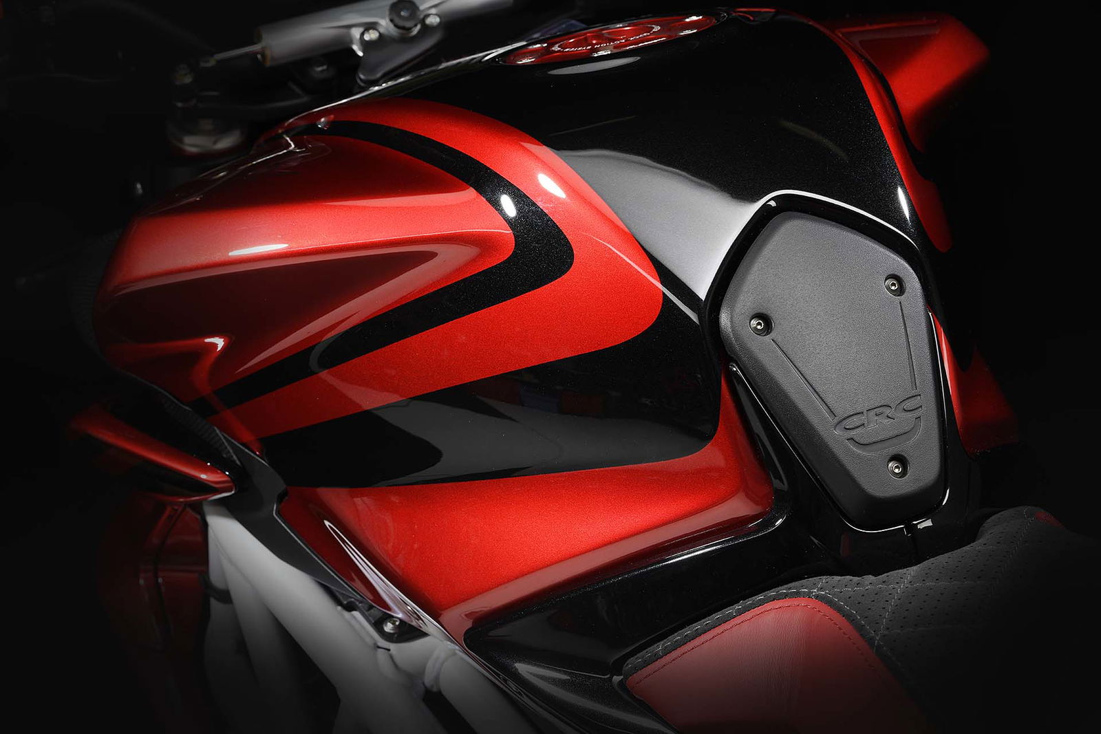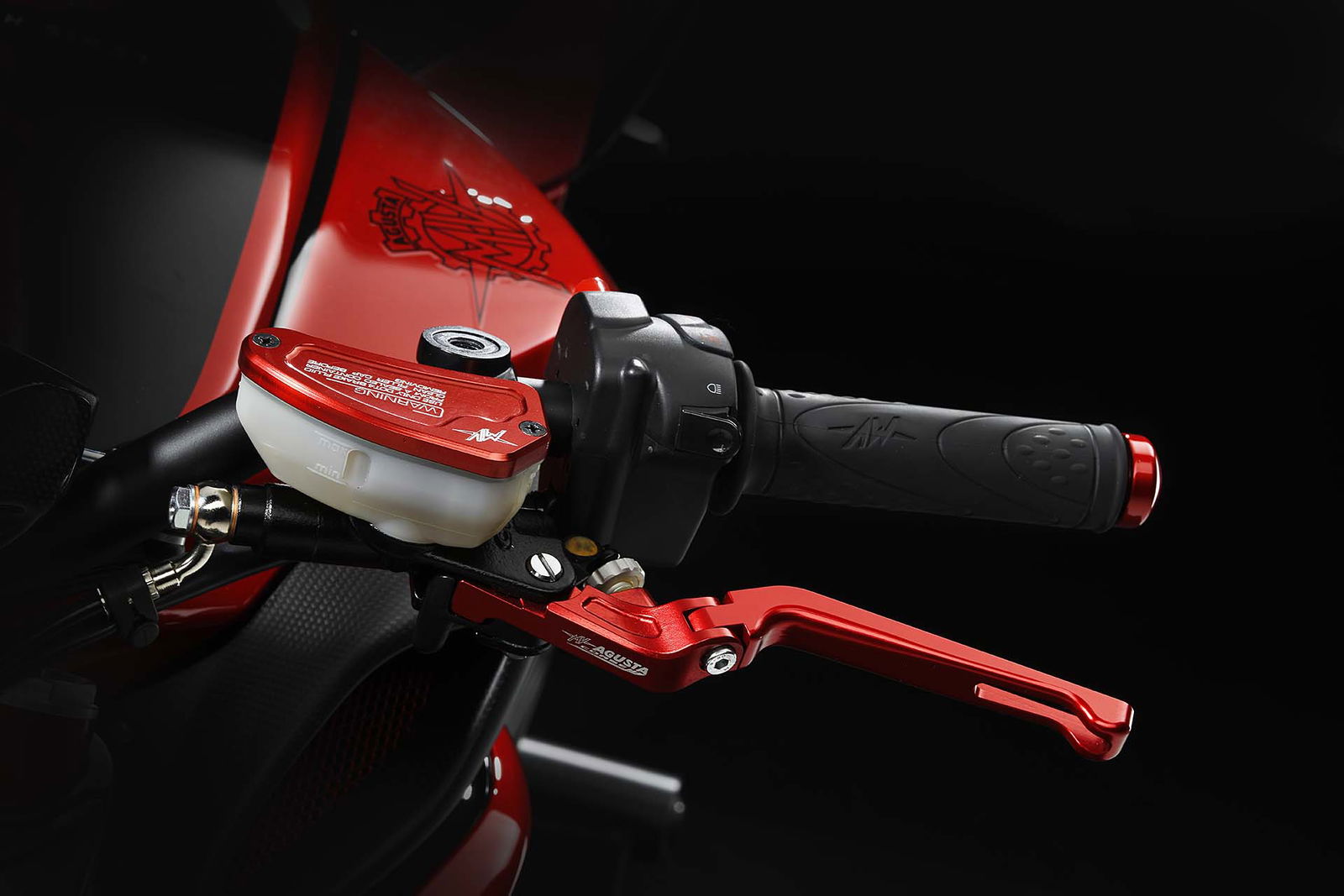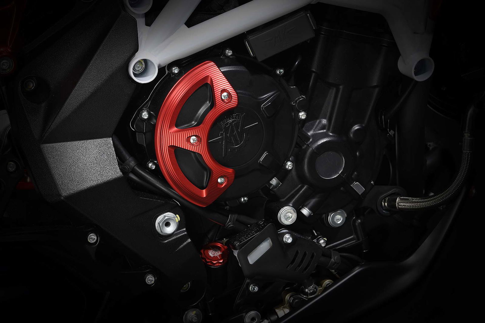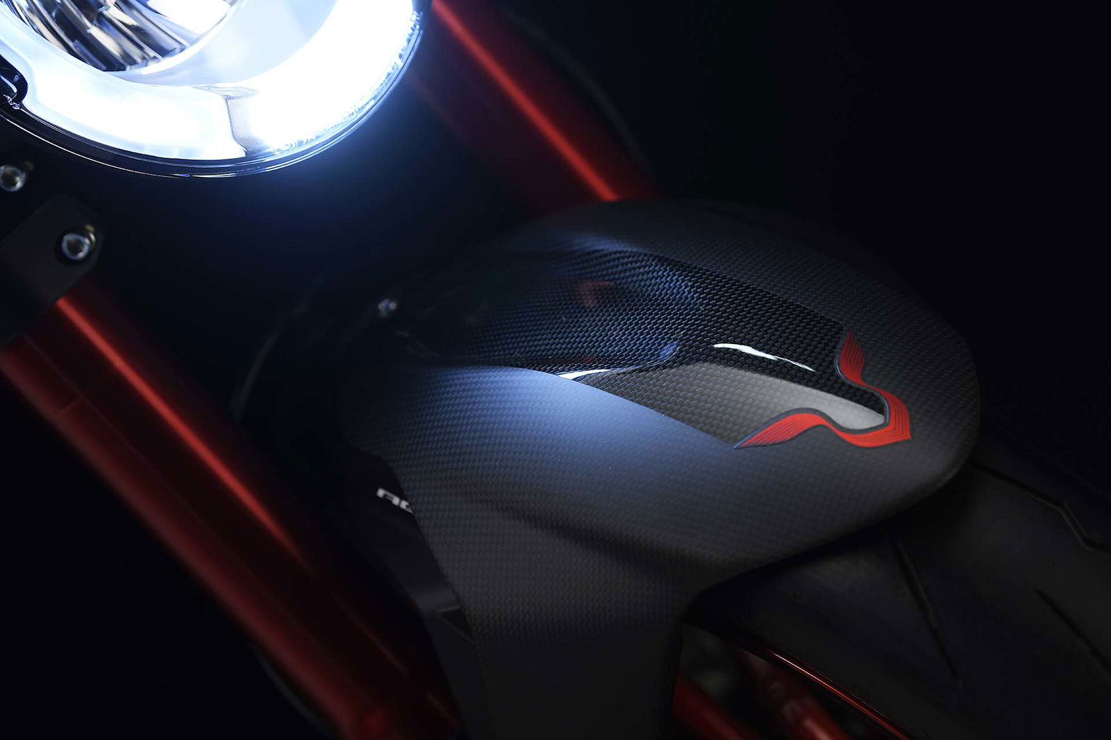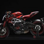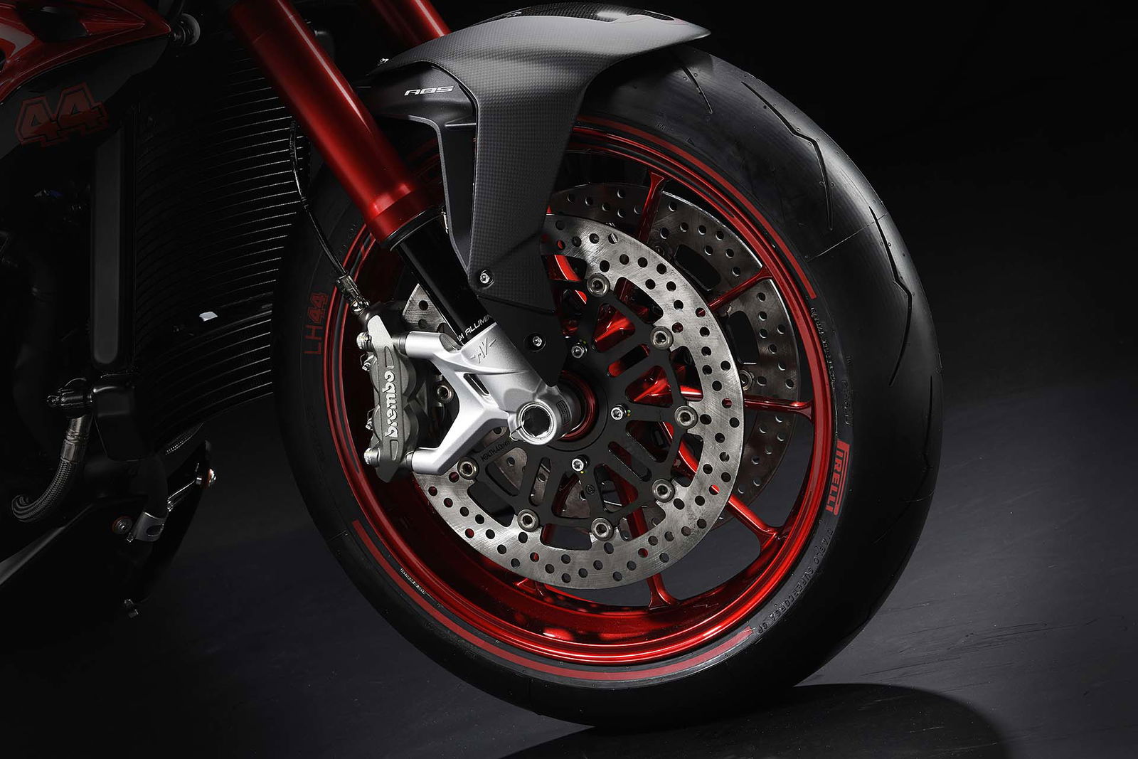 Molte le componenti in lega leggera con lavorazione dal pieno, ad esempio le leve freno e i coperchi dei vari serbatoi. I cerchi vantano un disegno specifico per questo modello e crescono nella sezione che arriva a 6”. Il legame strettissimo che MV Agusta ha con Pirelli rende scontata la presenza delle super performanti Diablo Supercorsa SP, in questo caso disponibili a richiesta con tanto di banda laterale rossa e sigla LH44. Sulla cover del cruscotto, realizzata in fibra di carbonio, è applicato il numero progressivo di produzione.