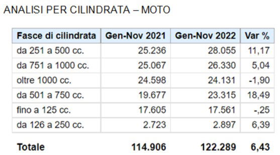Il bilancio positivo degli ultimi due mesi consente al mercato totale di consolidare la parità rispetto all’anno precedente: +0,85% e 282.593 veicoli registrati. Recuperano qualche punto percentuale anche gli scooter, che tuttavia rimangono in negativo, con un calo del 5,3% e 139.338 unità registrate. Il mercato moto targa invece 122.966 veicoli e cresce del 6,48%; in linea con il dato mensile il cumulato annuo dei ciclomotori, che segnano una crescita del 15,37% pari a 20.289 unità.