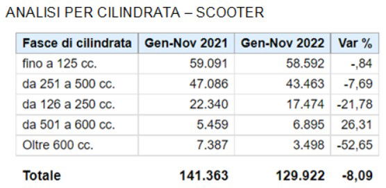 Cresce di più di un terzo (35,12%), rispetto al 2021, il mercato due ruote del mese di novembre, raggiungendo 16.476 veicoli venduti. A fare da traino sono gli scooter, che per il secondo mese consecutivo segnano un incremento a doppia cifra (+42,52%), corrispondente a 8.692 mezzi immatricolati. Seguono le moto con una crescita del 30,75% e 6.403 veicoli targati; in territorio positivo anche i ciclomotori, che ottengono un incremento del 15,28%, pari a 1.381 unità immesse sul mercato.