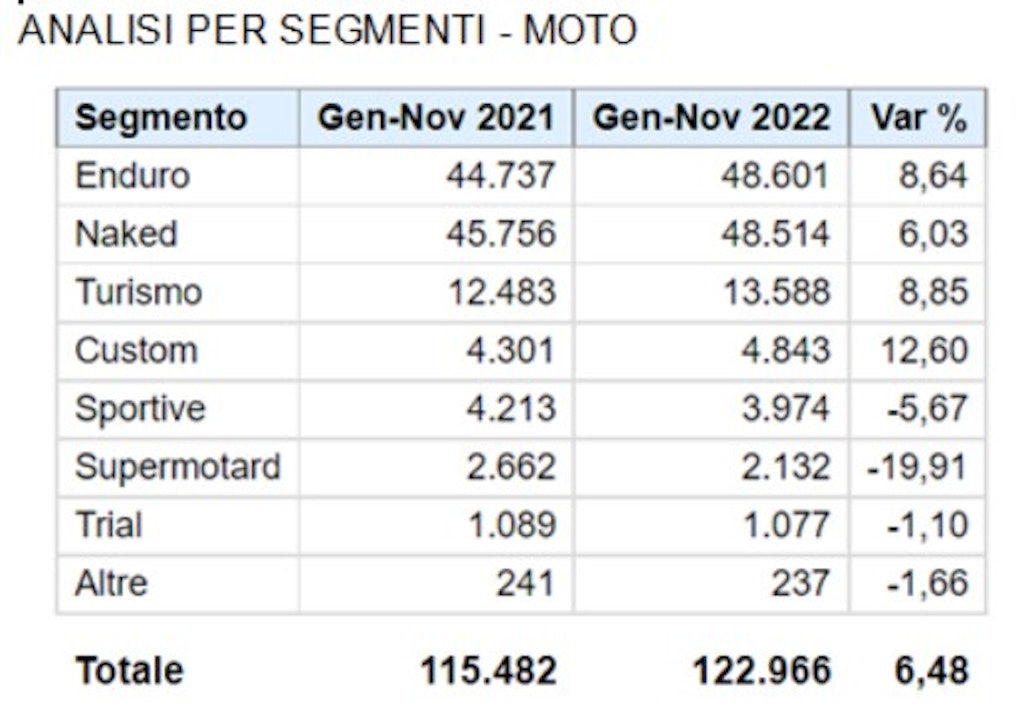 Dopo il solido +26% dello scorso mese, il mercato delle due ruote a motore non arresta la sua crescita anche in novembre. Le immatricolazioni mensili di ciclomotori, scooter e moto fanno infatti segnare un altro aumento a doppia cifra e volano a +35% sullo stesso periodo dell’anno scorso. Nel comunicato diffuso da Confindustria ANCMA (Associazione Nazionale Ciclo Motociclo Accessori), il presidente dall’associazione dei costruttori Paolo Magri ha ribadito che “la disponibilità di prodotto consente finalmente di misurare il reale peso specifico del mercato”.