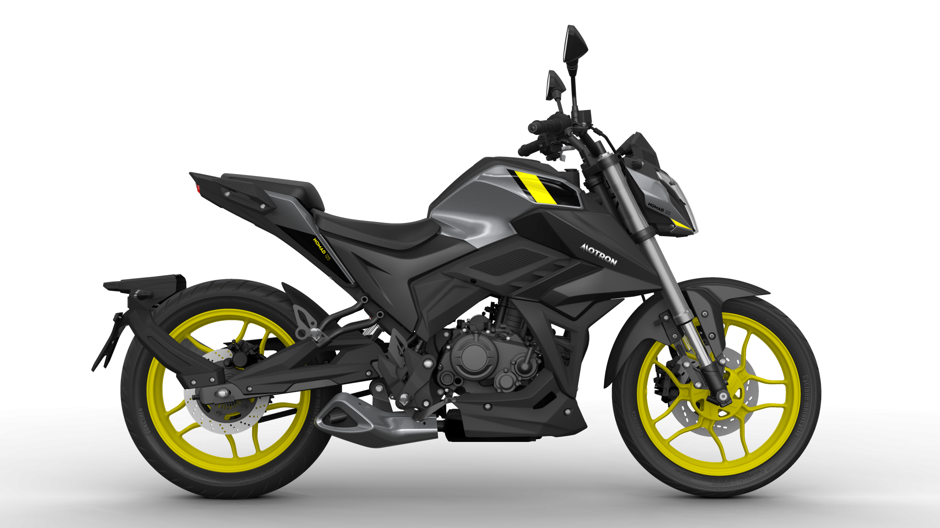 La Motron Nomad è dotata di un motore monocilindrico quattro tempi da 125 cc ovviamente Euro 5. Essendo una moto che rientra nella categoria “patenti A1”, la potenza è di 13 CV (2 CV meno del limite legale) e la coppia di 10,5 Nm a 5.500 giri. La seduta è bassa, solo 780 mm da terra, ma in Motron garantiscono che la moto ha comunque una posizione di guida da naked sportiva. Habitat naturale? La città, grazie al peso ridotto e al passo di 1.375 mm questa piccola 125 promette di essere una vera lepre nel traffico cittadino. Quanto ai freni: l’impianto anteriore conta su un disco da 265 mm dietro lavora invece un disco da 240 mm.