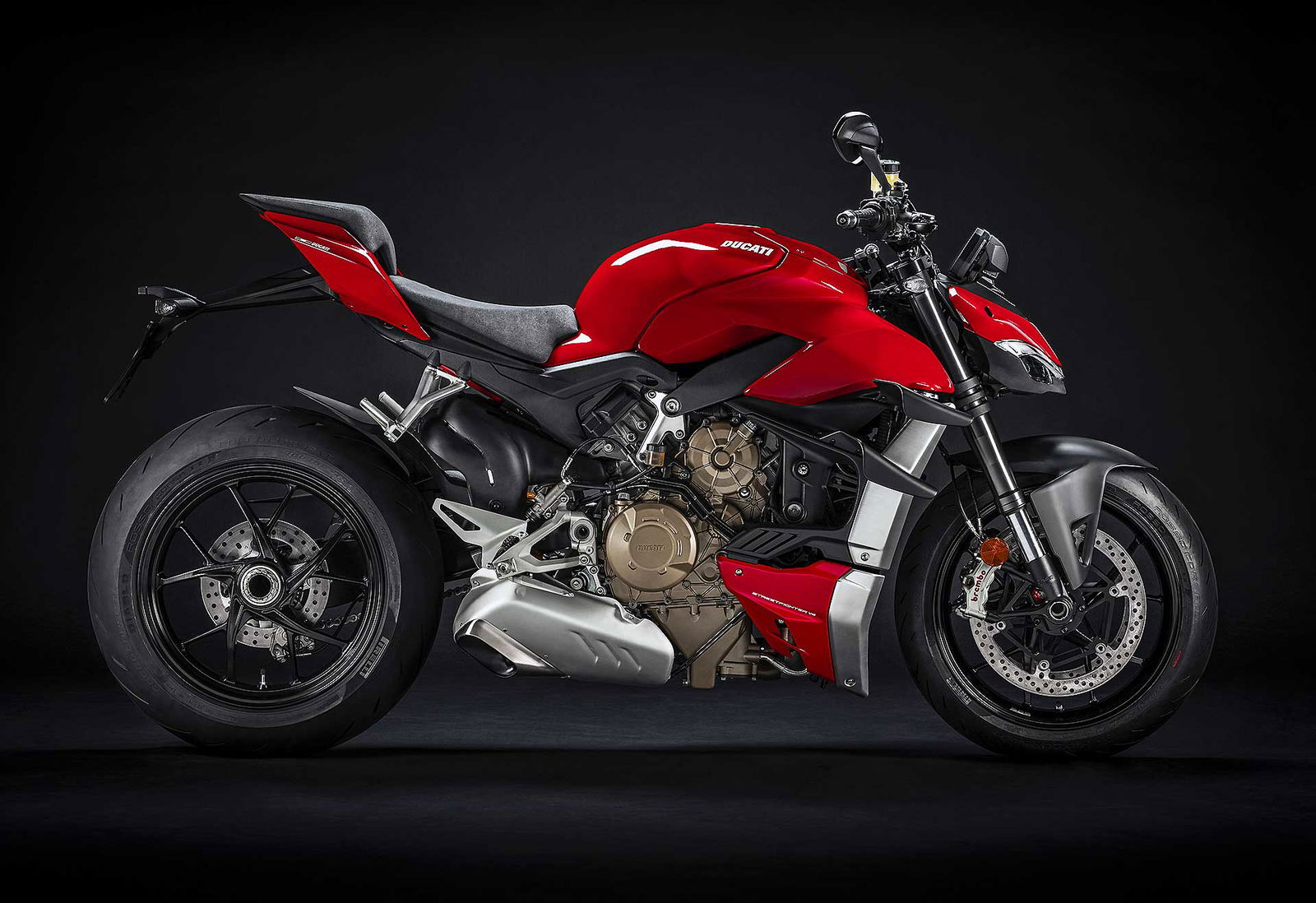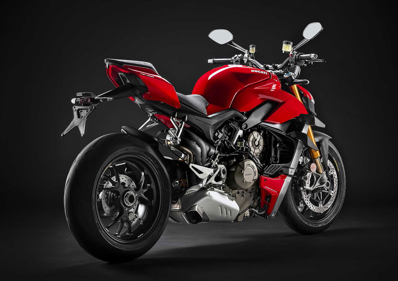 Il motore V4 Desmosedici Stradale in questa configurazione eroga 208 cavalli di potenza massima a 12500 giri/min, con la coppia pari a 12,5 kgm a 11500 giri. A proposito di coppia, quella disponibile alla ruota in terza marcia a 100 km/h, anche in virtù del rapporto più corto, è del 14% in più rispetto alla Panigale V4. Per l’uso in pista può essere montato l’accessorio originale con scarico completo Akrapovic, arrivando fino a 216 cv di potenza massima, con un risparmio di peso pari a 6 kg. Nella configurazione omologata il rapporto peso/potenza raggiunge 1,17 cv/kg, ossia un netto +25% rispetto alla migliore concorrente. Dati che sottolineano le intenzioni di Ducati nel segmento delle iper naked, moto protagoniste della nostra recente comparativa.